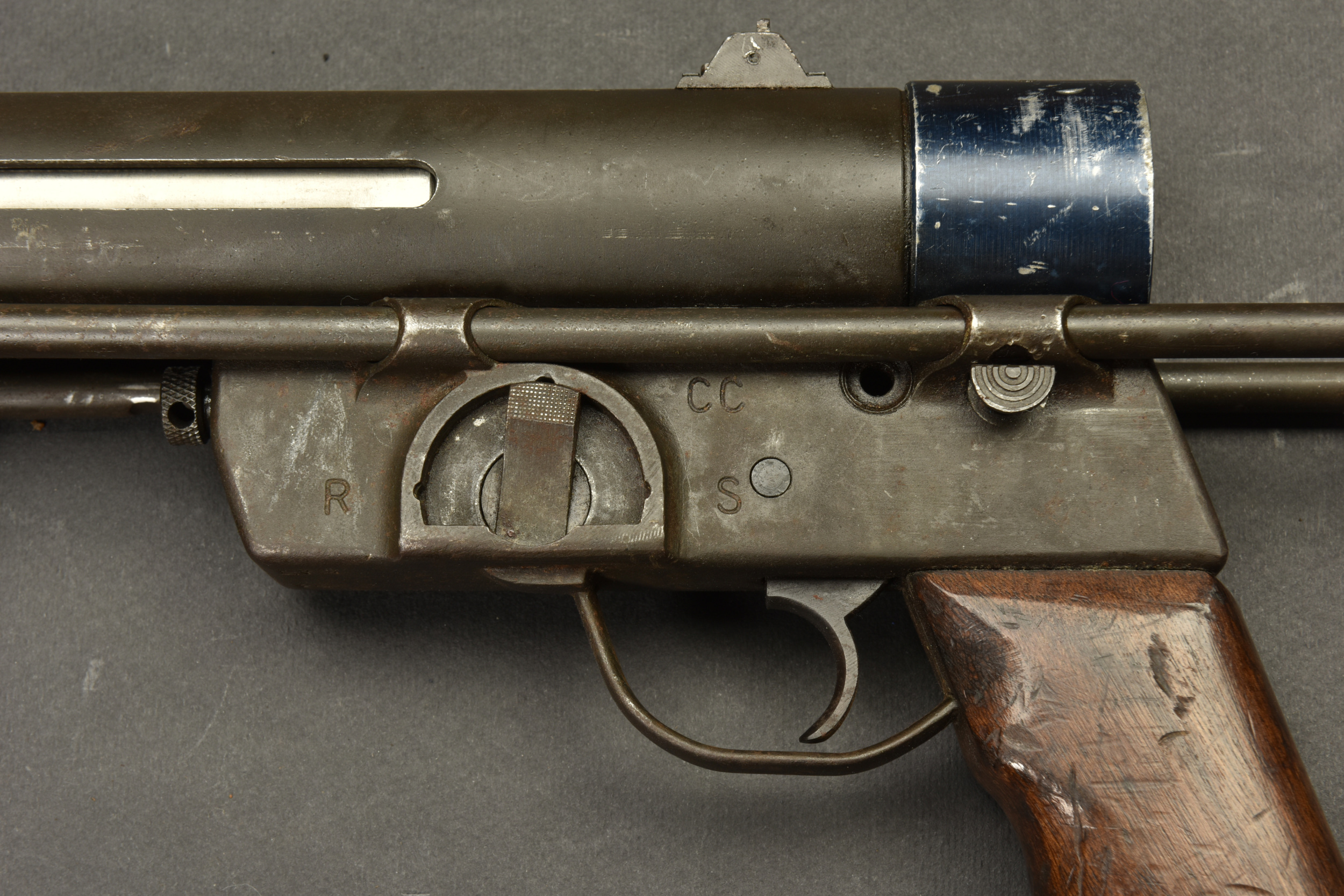 Pistolet mitrailleur Gevarm D4. Tout en métal, crosse pliante présente. Poignée en bois. Chargeur bloqué par la neutralisation. Culasse rendue mobile par une neutralisation +. Numéro 355620.... en savoir plus