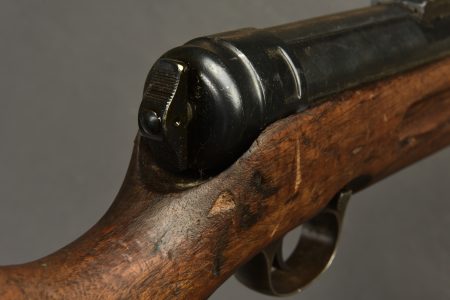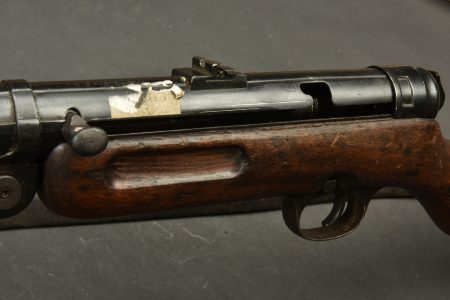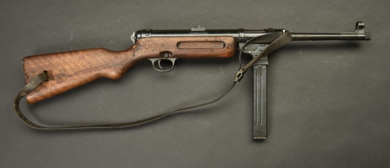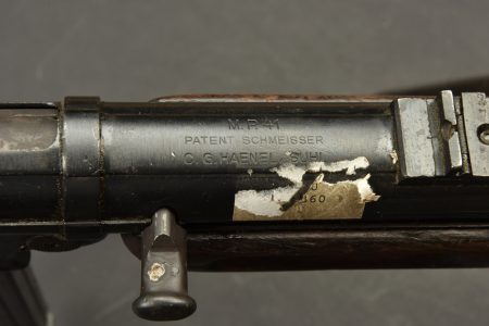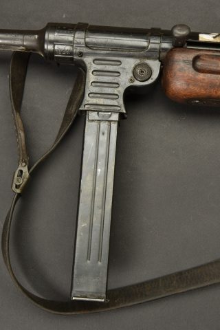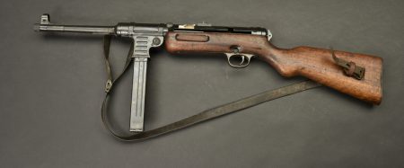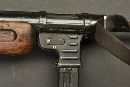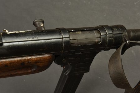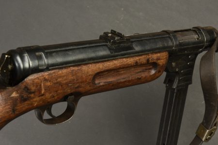 Pistolet mitrailleur MP41. Les garnitures sont dans leur bronzage d’origine à 80%. Belle crosse en bois. Chargeur bloqué par la neutralisation. Culasse rendue mobile par une neutralisation +. Bretelle en cuir complète. Fabrication Haenel MP 41. Numéro 13861. Catégorie C9. Arme neutralisée aux nouvelles normes européenne par le Banc d’épreuve de Saint Etienne. Cette arme doit être déclarée avec Cerfa et certificat médical de moins de 1 mois ou licence de tir tamponnée ou permis de chasse valide (art R312-56). La délivrance de l’arme n’aura lieu qu’après consultation du fichier Finadia. L’inscription de l’acheteur sur ce fichier entrainera automatiquement la nullité de la vente. A noter une certaine usure et patine de la pièce. Etat II+.