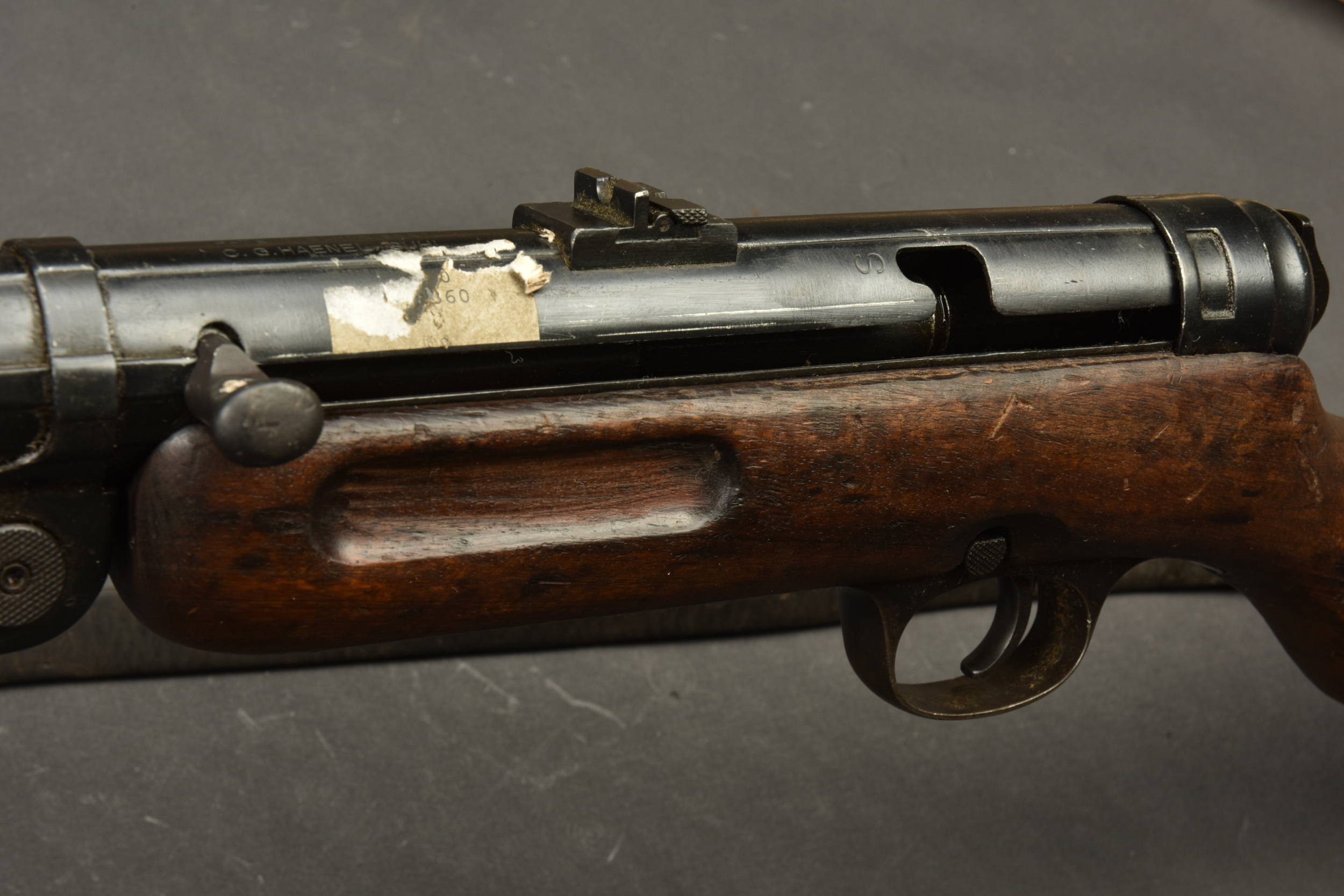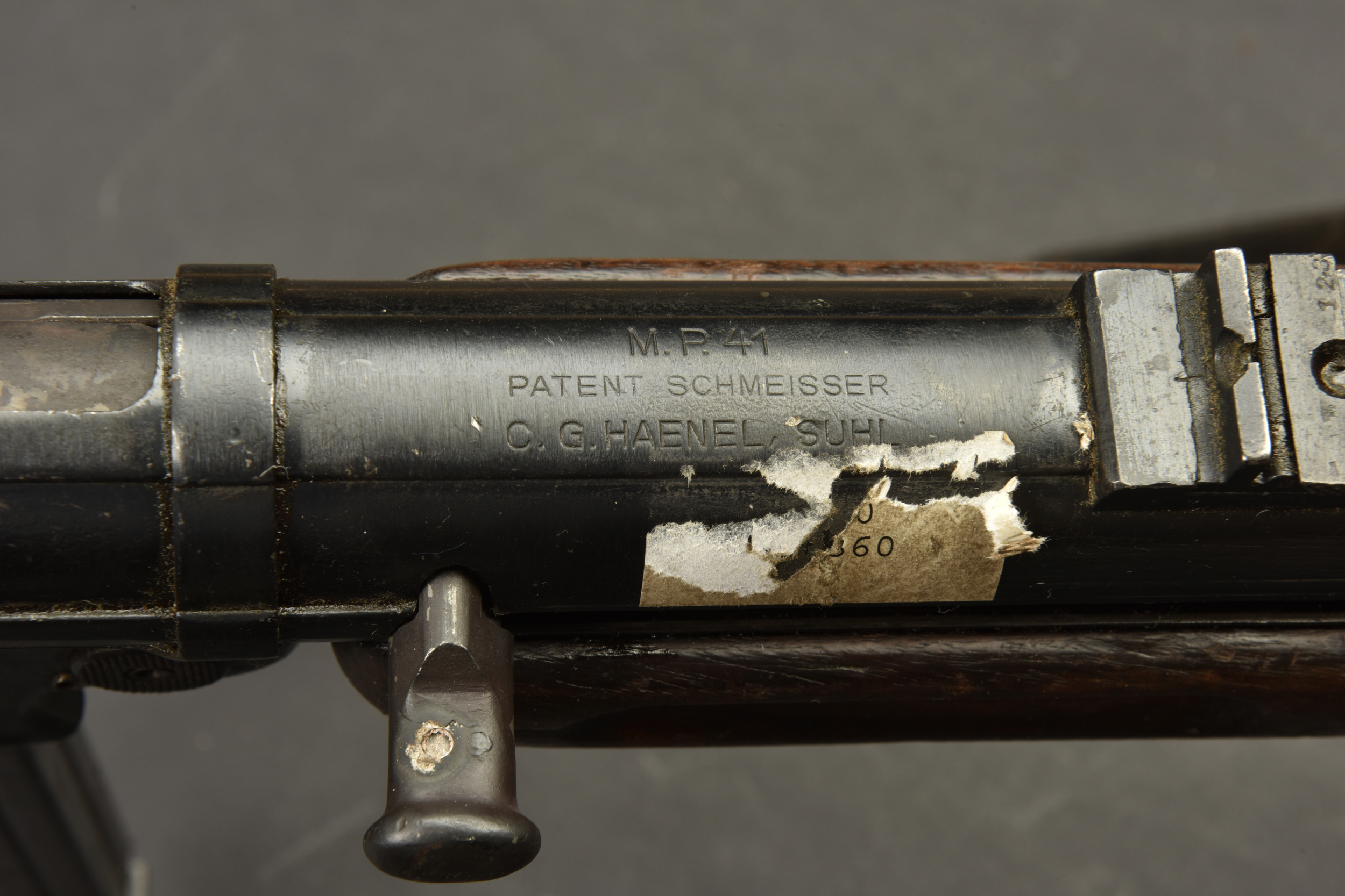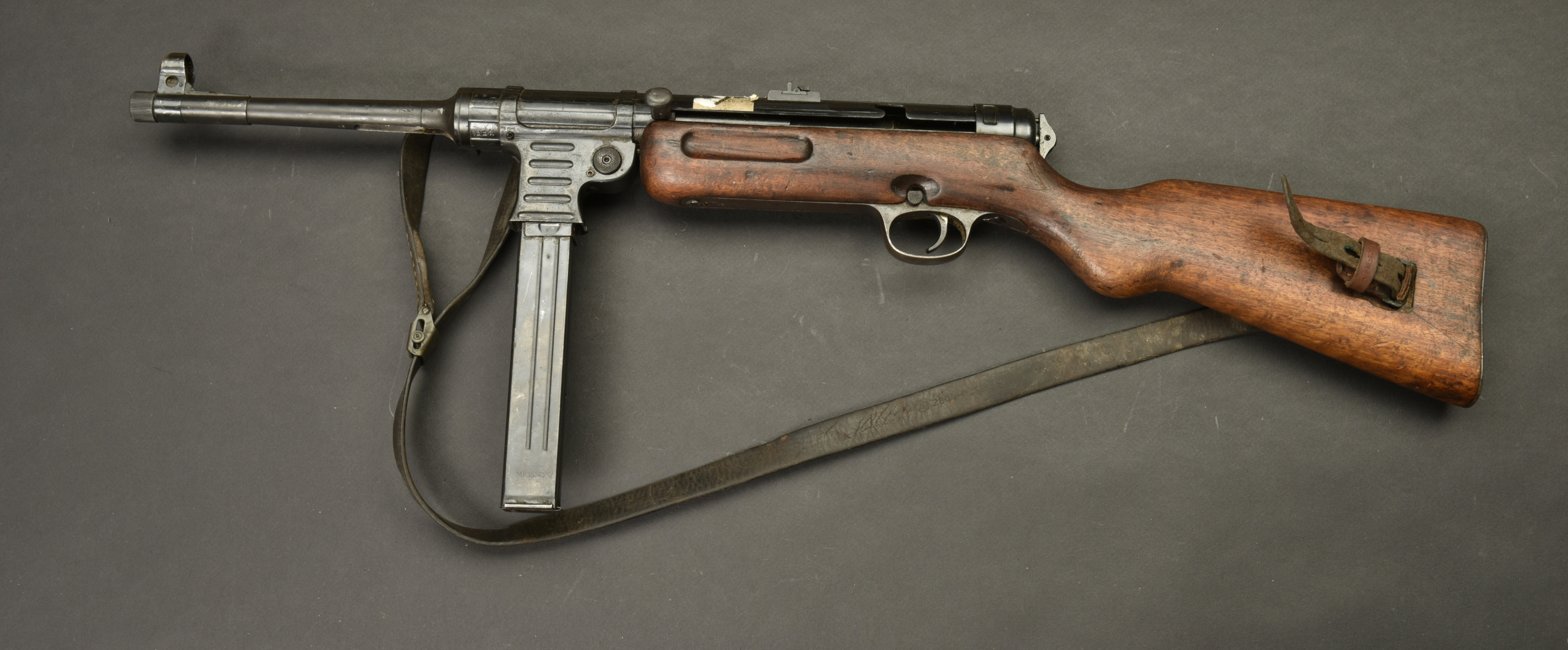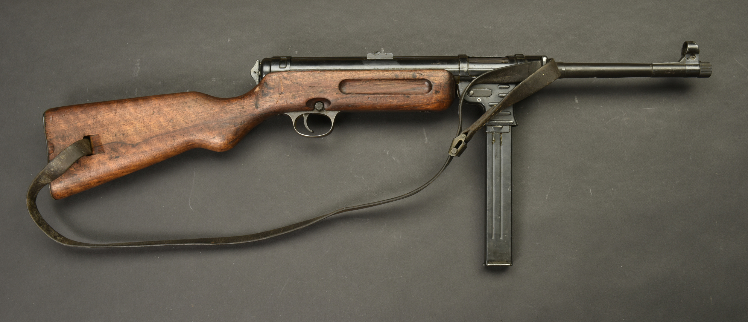 Détails de la vente >Pistolet mitrailleur MP41. Les garnitures sont dans leur bronzage d’origine à 80%. Belle crosse en bois. Chargeur bloqué par la neutralisation. Culasse rendue mobile par une neutralisation... en savoir plus