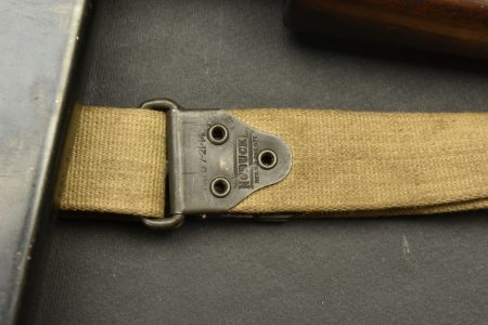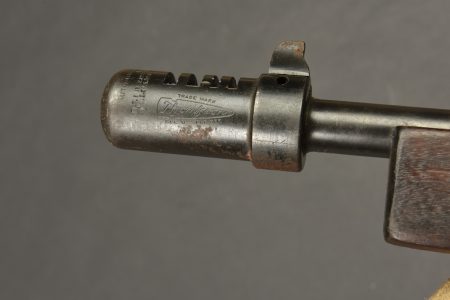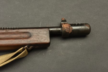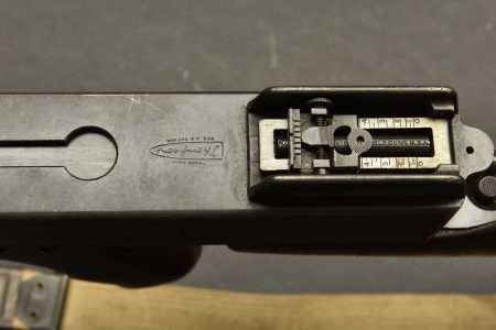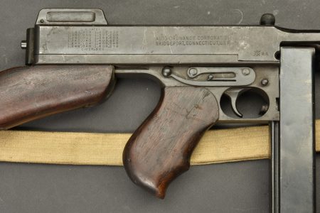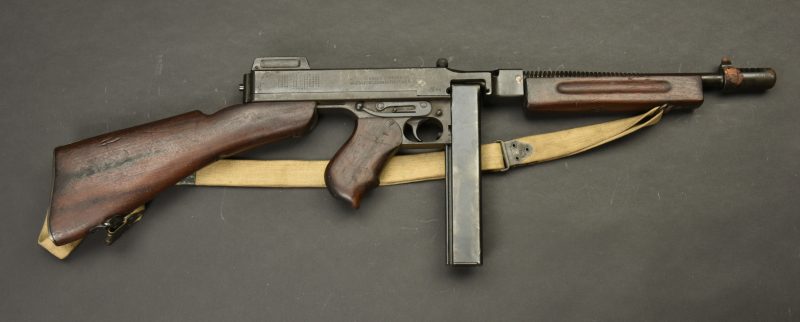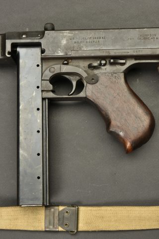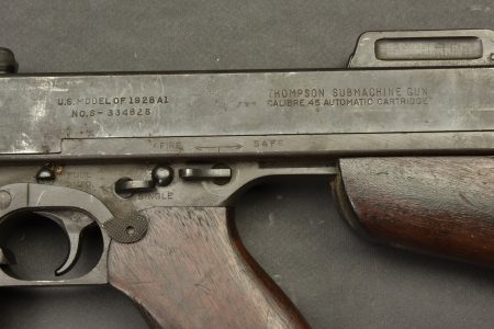 Pistolet Mitrailleur Thompson 1928 A1. Fabrication Auto Ordnance Corporation Bridgeport Connecticut. Numéro S-334825. Crosse en bois complète. Poignée et garde main également en bois. Quelques marques d’oxydation. Culasse rendue mobile grâce à une neutralisation +. Chargeur bloqué par la neutralisation. Bretelle en toile complète. Catégorie C9. Arme neutralisée aux nouvelles normes européenne par le Banc d’épreuve de Saint Etienne. Cette arme doit être déclarée avec Cerfa et certificat médical de moins de 1 mois ou licence de tir tamponnée ou permis de chasse valide (art R312-56). La délivrance de l’arme n’aura lieu qu’après consultation du fichier Finadia. L’inscription de l’acheteur sur ce fichier entrainera automatiquement la nullité de la vente. A noter une certaine usure et patine de la pièce. Etat II+.