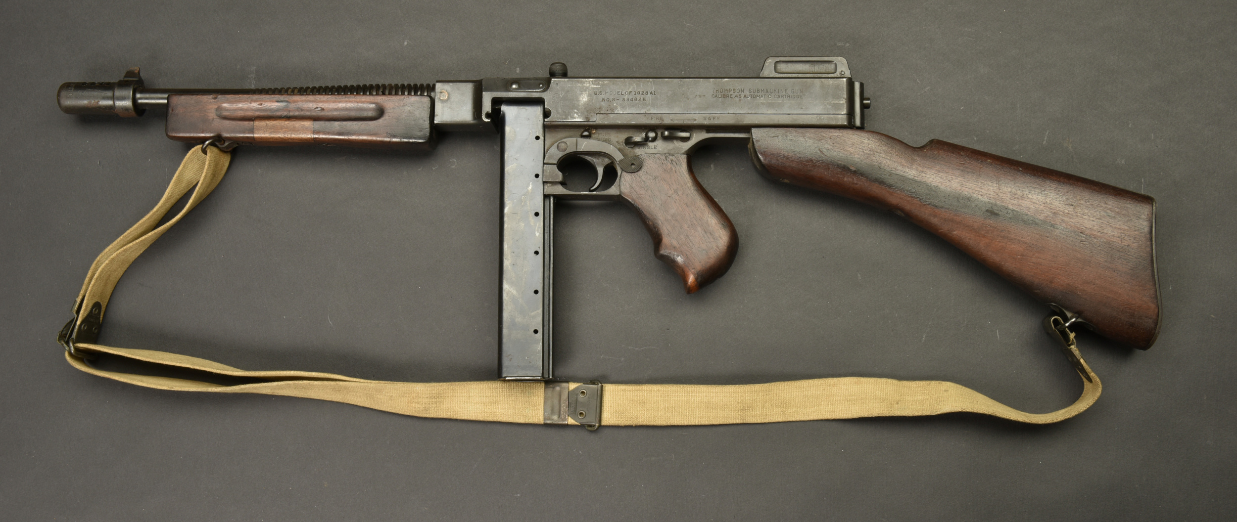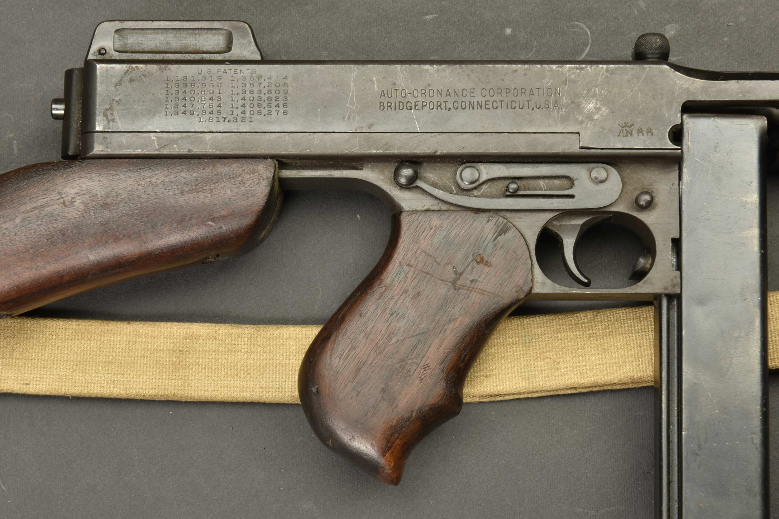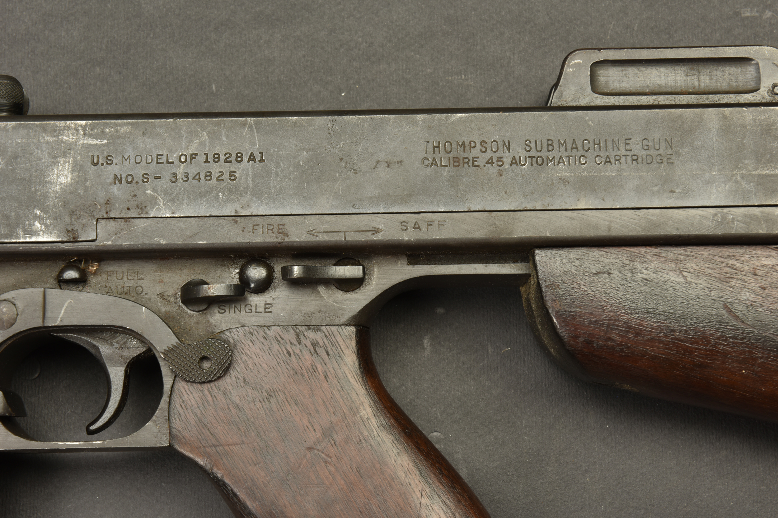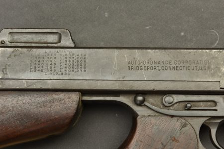 Détails de la vente >Pistolet Mitrailleur Thompson 1928 A1. Fabrication Auto Ordnance Corporation Bridgeport Connecticut. Numéro S-334825. Crosse en bois complète. Poignée et garde main également en bois. Quelques... en savoir plus
