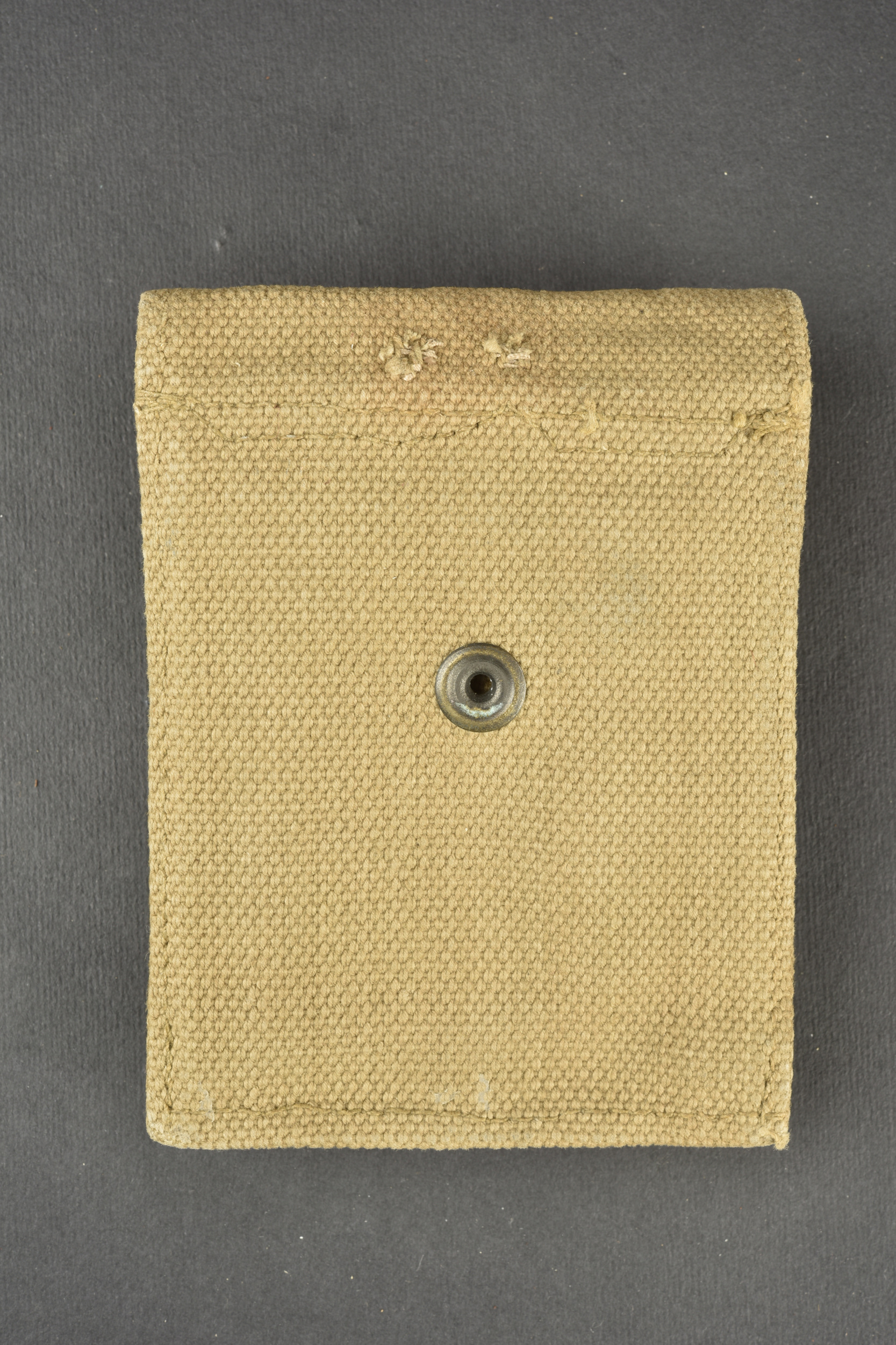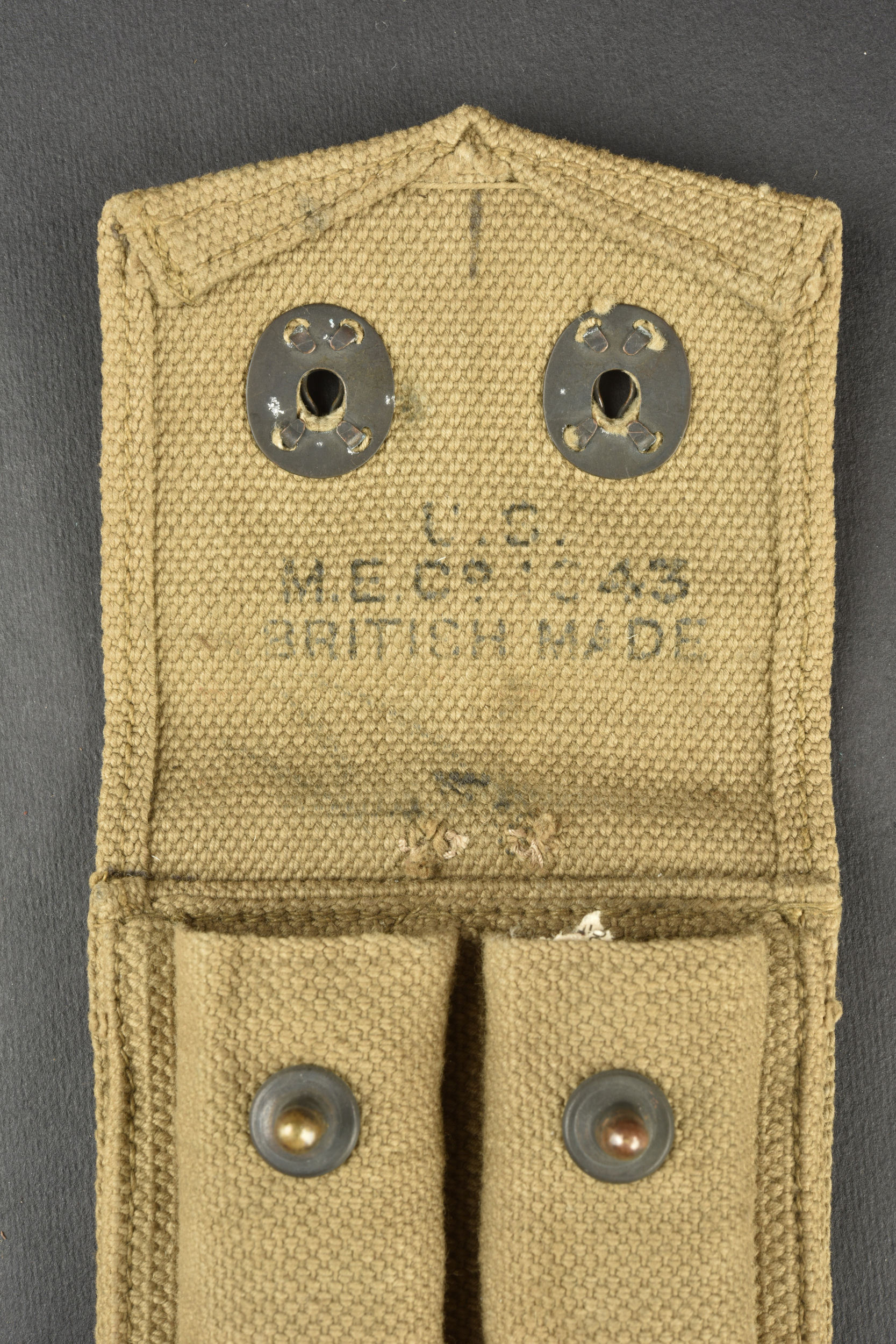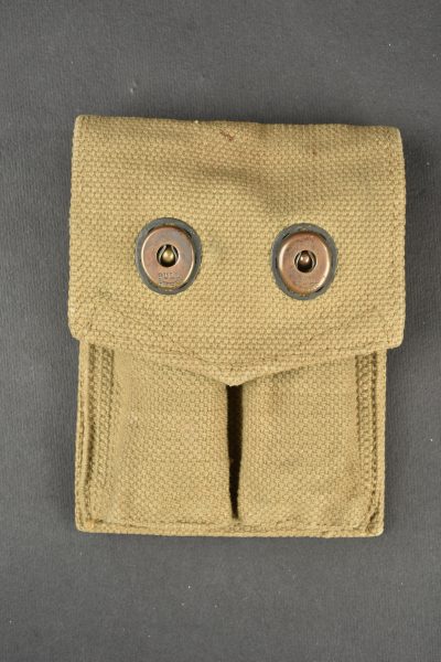 Pochette pour chargeurs de Colt 45 British Made. En toile web, typique des fabrications britannique. Les boutons pressions sont fonctionnels. Fabrication US MECO 1943 British Made. A noter une certaine usure et patine de la pièce, ainsi que des tâches. Etat II+.