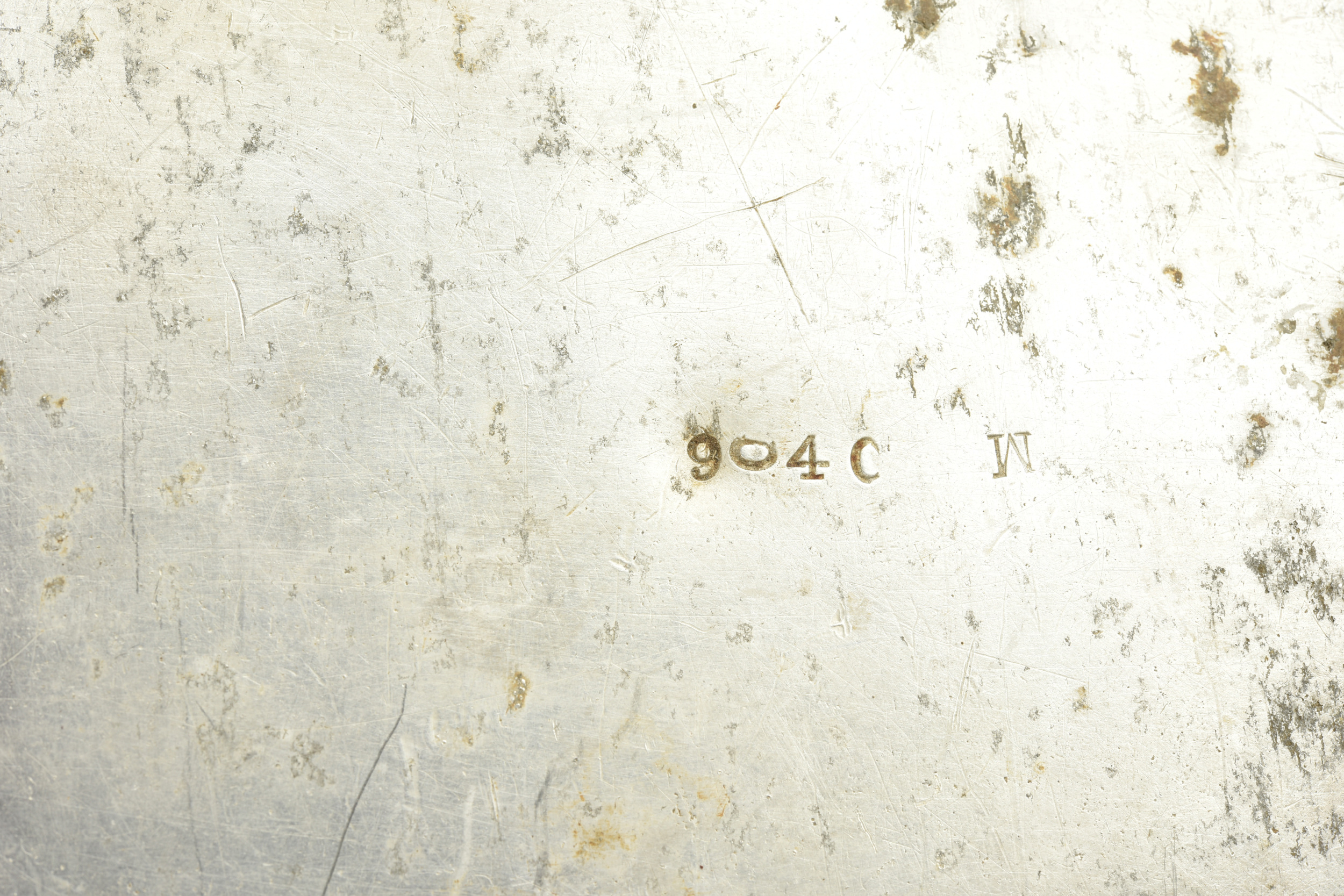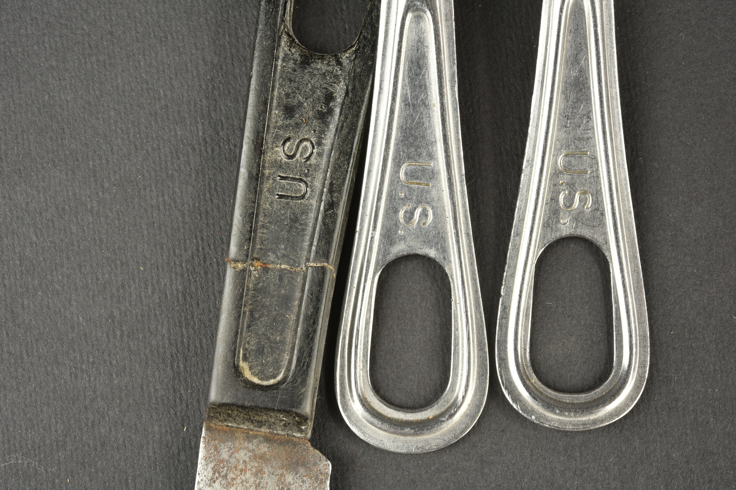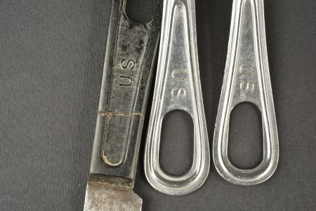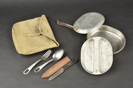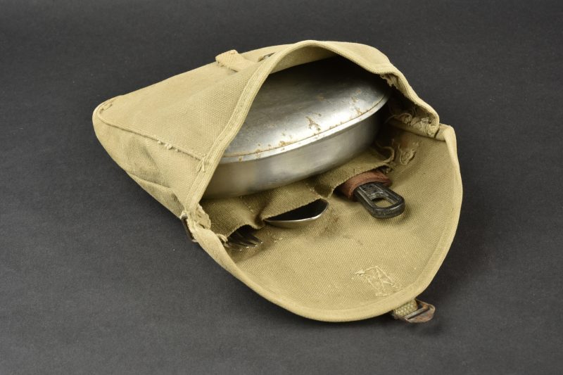 Pochette pour gamelle et accessoires. Housse en forte toile OD, la sangle de fermeture est complète. Gamelle complète, les parties métalliques sont fortement oxydées. Une cuillère et une fourchette en métal. Un couteau avec manche en bakélite, la lame est fortement oxydée, le manche est cassé et réparé avec de la colle. Une housse en cuir pour la protection du couteau. A noter une certaine usure et patine des pièces, ainsi que des tâches et marques d’oxydation. Etat II+.