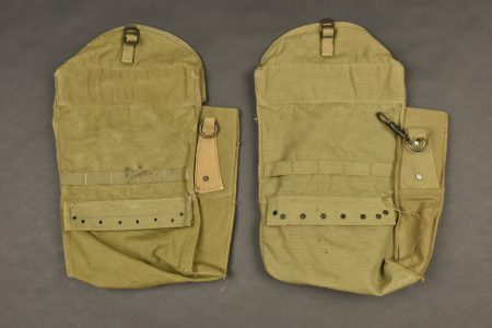 Pochettes médicale US vides. Deux pochettes en forte toile OD. Les attaches sont présentes. Toutes les sangle sont manquantes. Réutilisation par l’armée française. Vides. A noter une certaine usure et patine des pièces, ainsi que des tâches. Etat II+.