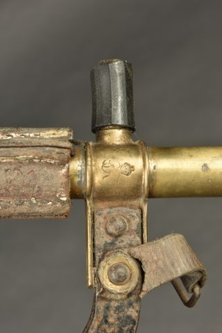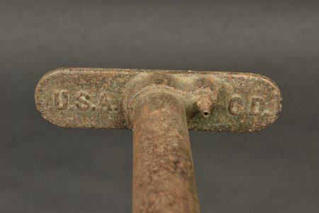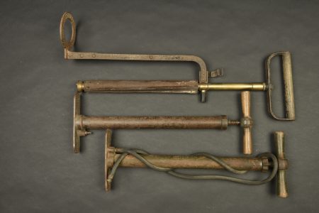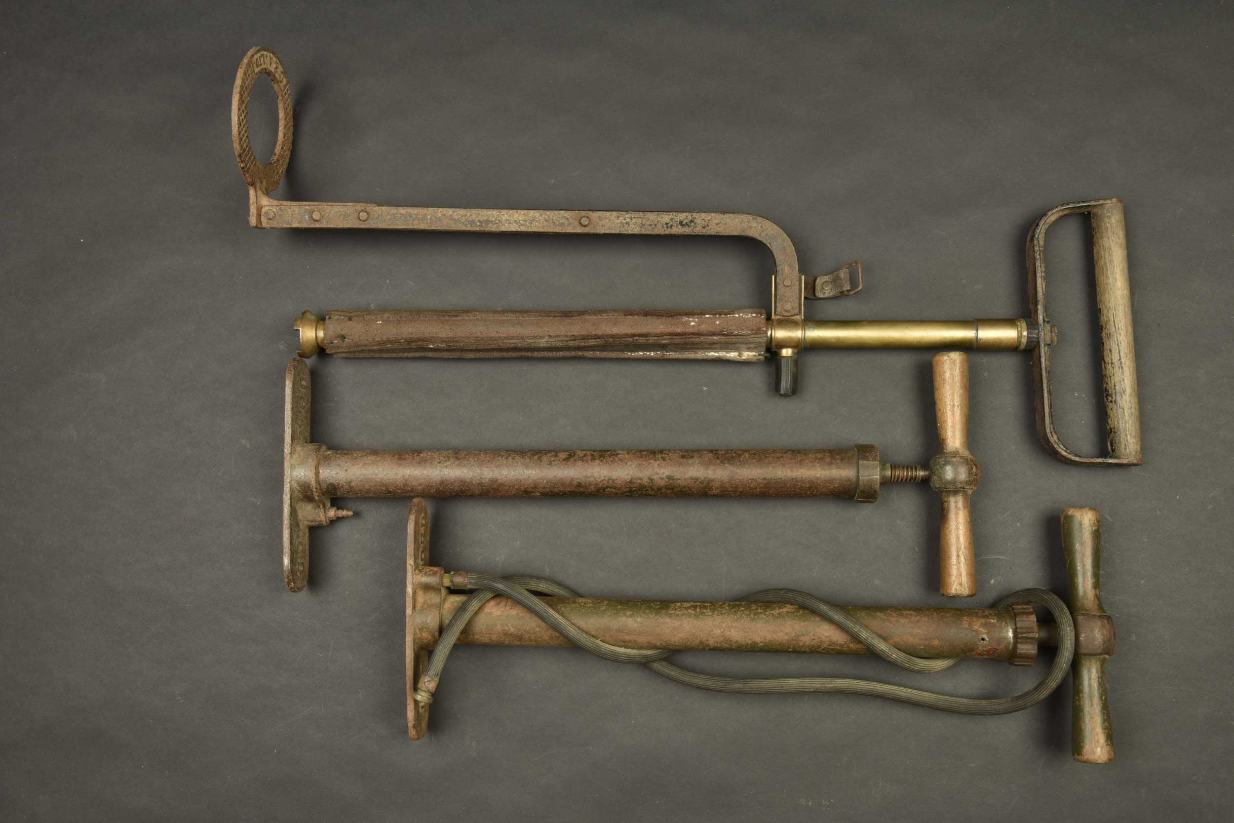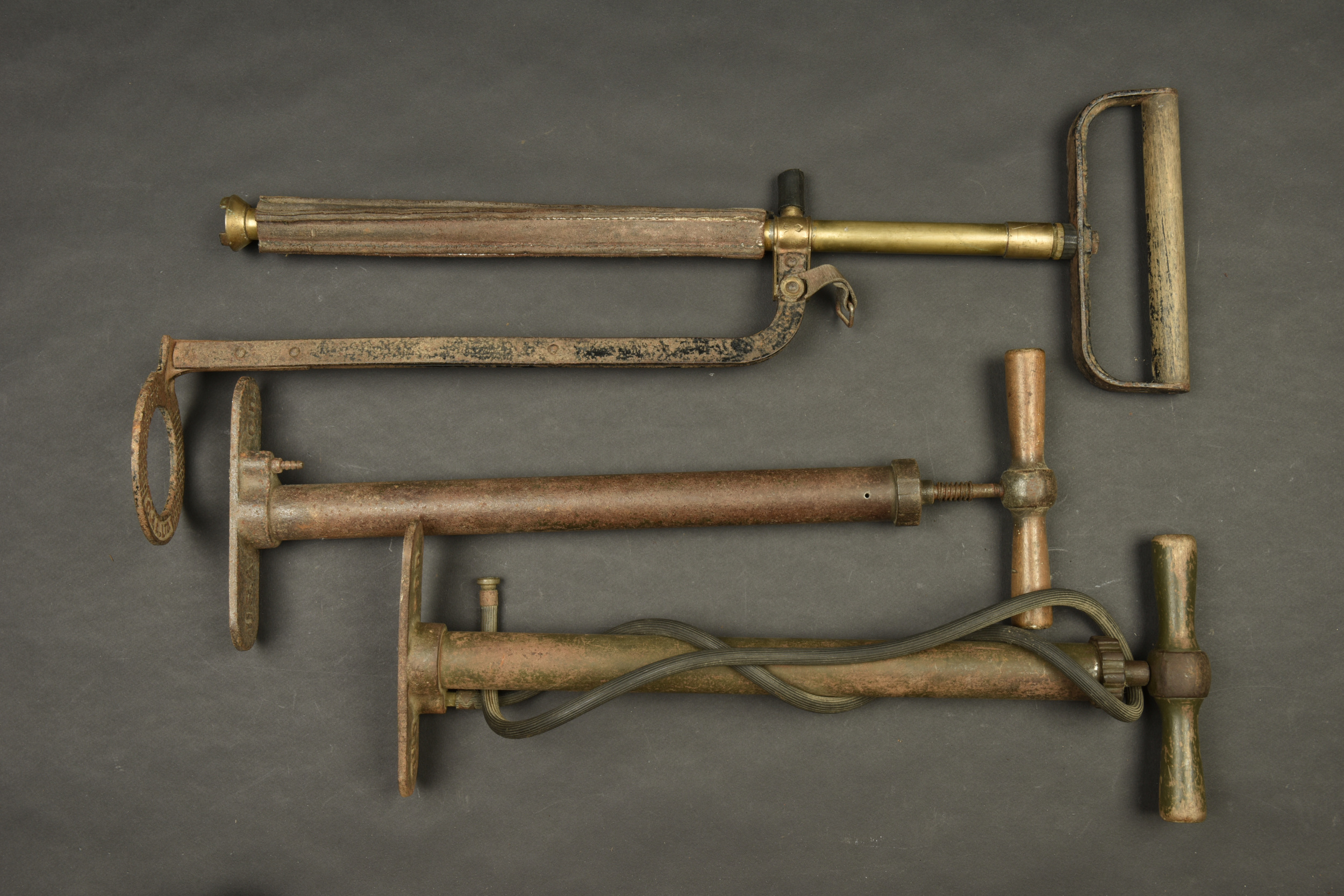 Pompes à vélo US. Comprenant une pompe à vélo en métal, poignée en bois, peinture kaki à 70%, fabrication US ORD, flexible complet, mais visiblement postérieur. Une pompe à vélo en métal, poignée en bois. Peinture kaki à 10%, marquages USA OD, flexible absent. Une pompe à vélo en laiton et métal, fortement oxydée, les marquages sont illisibles. A noter une certaine usure et oxydation des pièces. Etat II+.