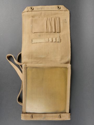 Porte carte britannique. En forte toile web, les boutons pressions sont fonctionnels. La sangle de transport est présente. Marquages partiellement illisibles, datés 1944. A noter une certaine usure et patine de la pièce. Etat