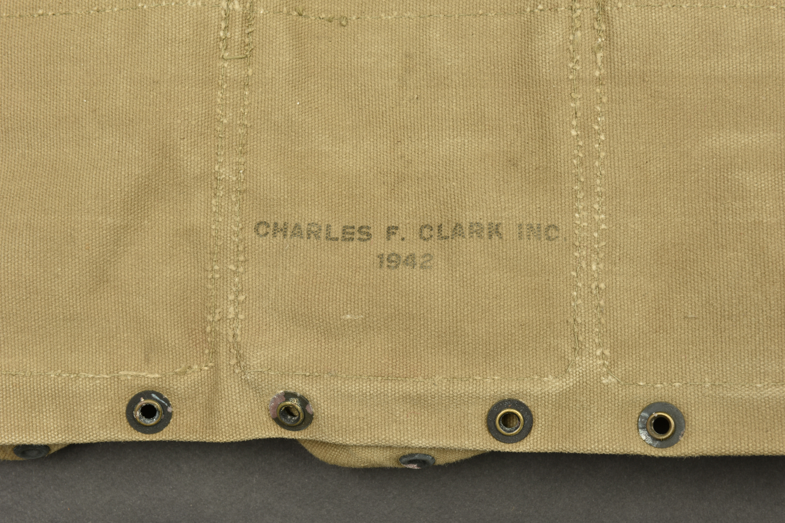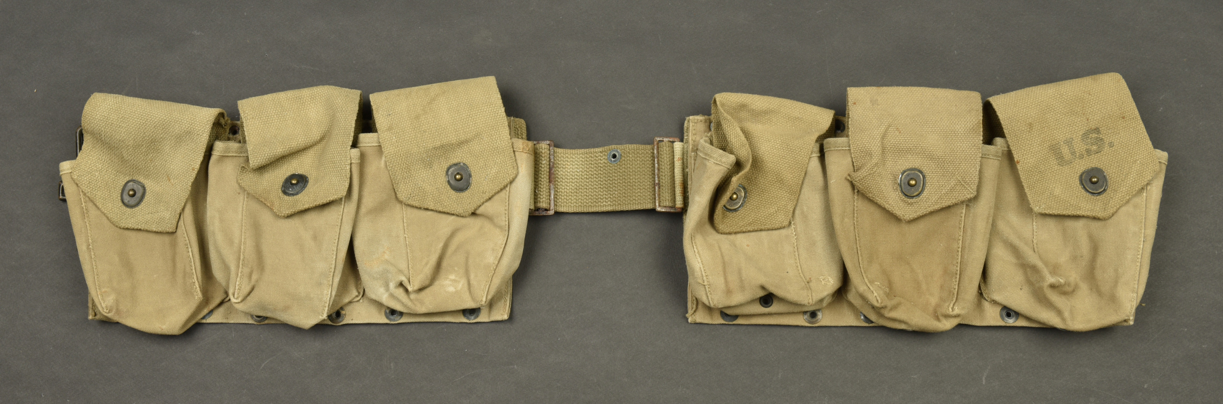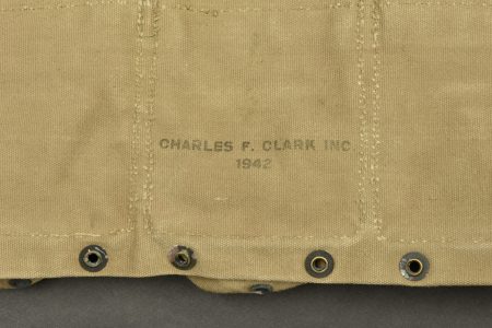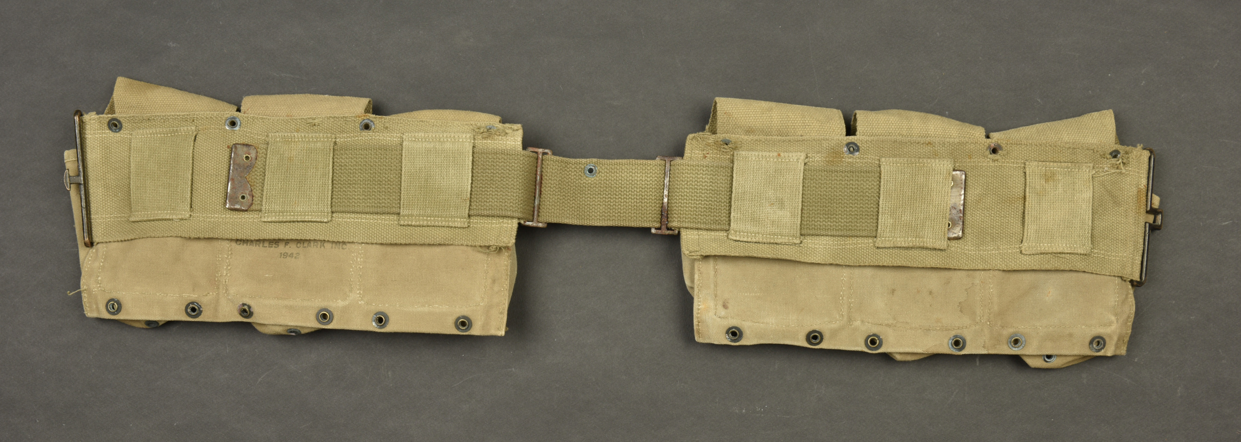 Ceinturon porte chargeur FM BAR. Ensemble homogène en toile OD. Beau marquage US sur un rabat. Le crochet de fermeture est complet. Les boutons pressions sont fonctionnels. Fabrication Charles F Clark Inc 1942. Les parties métalliques sont partiellement oxydées. A noter une certaine usure et patine de la pièce. Etat II+.