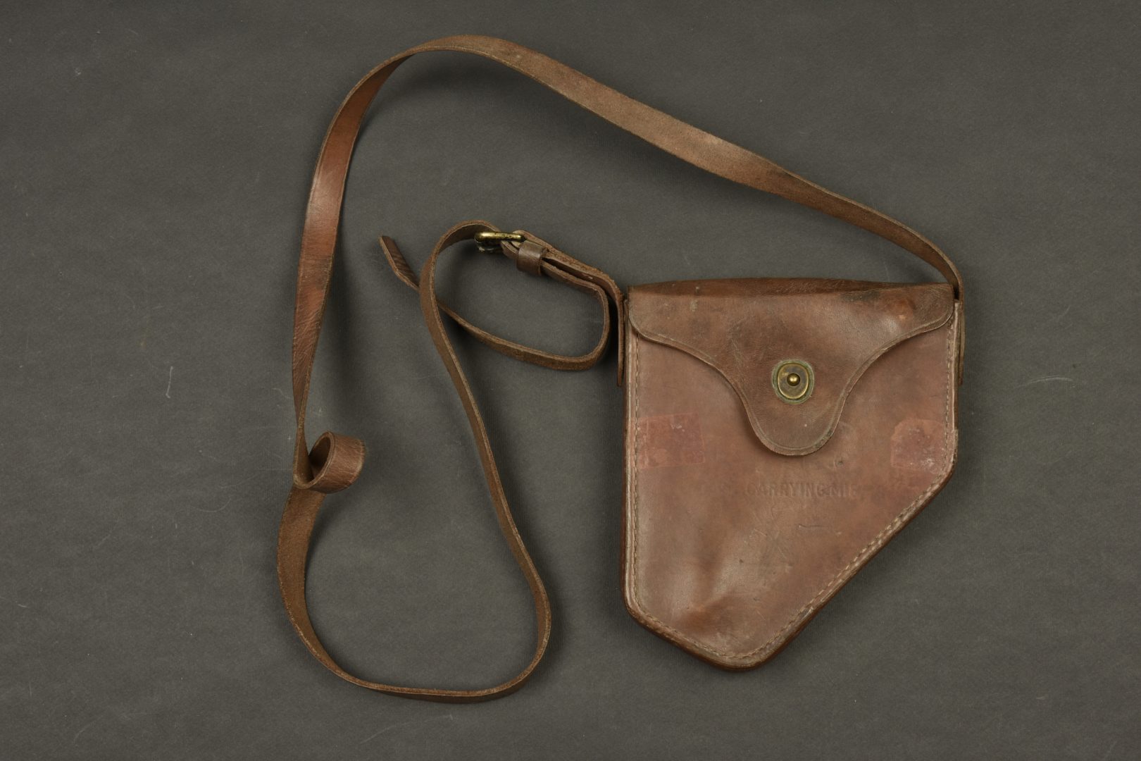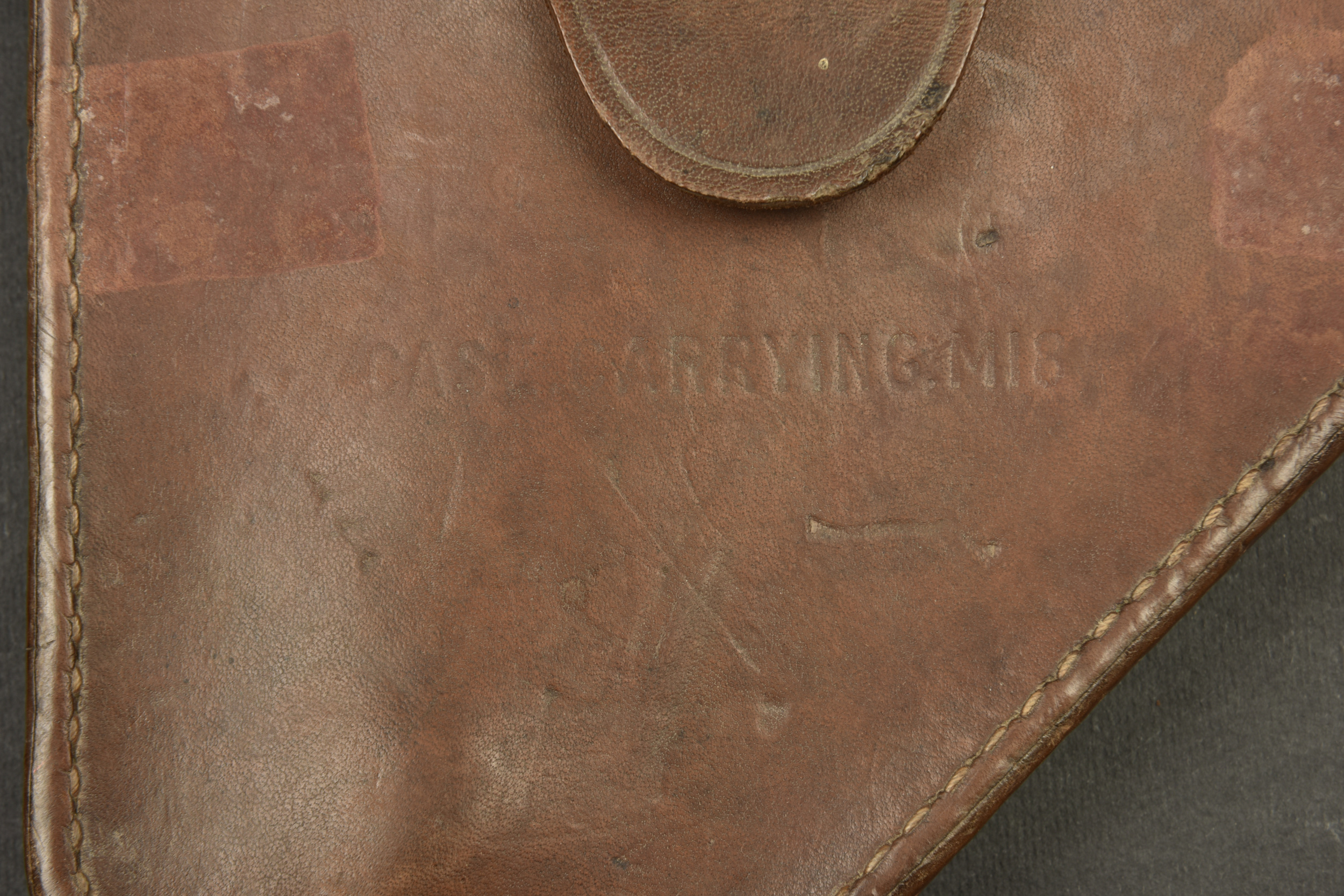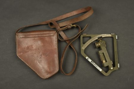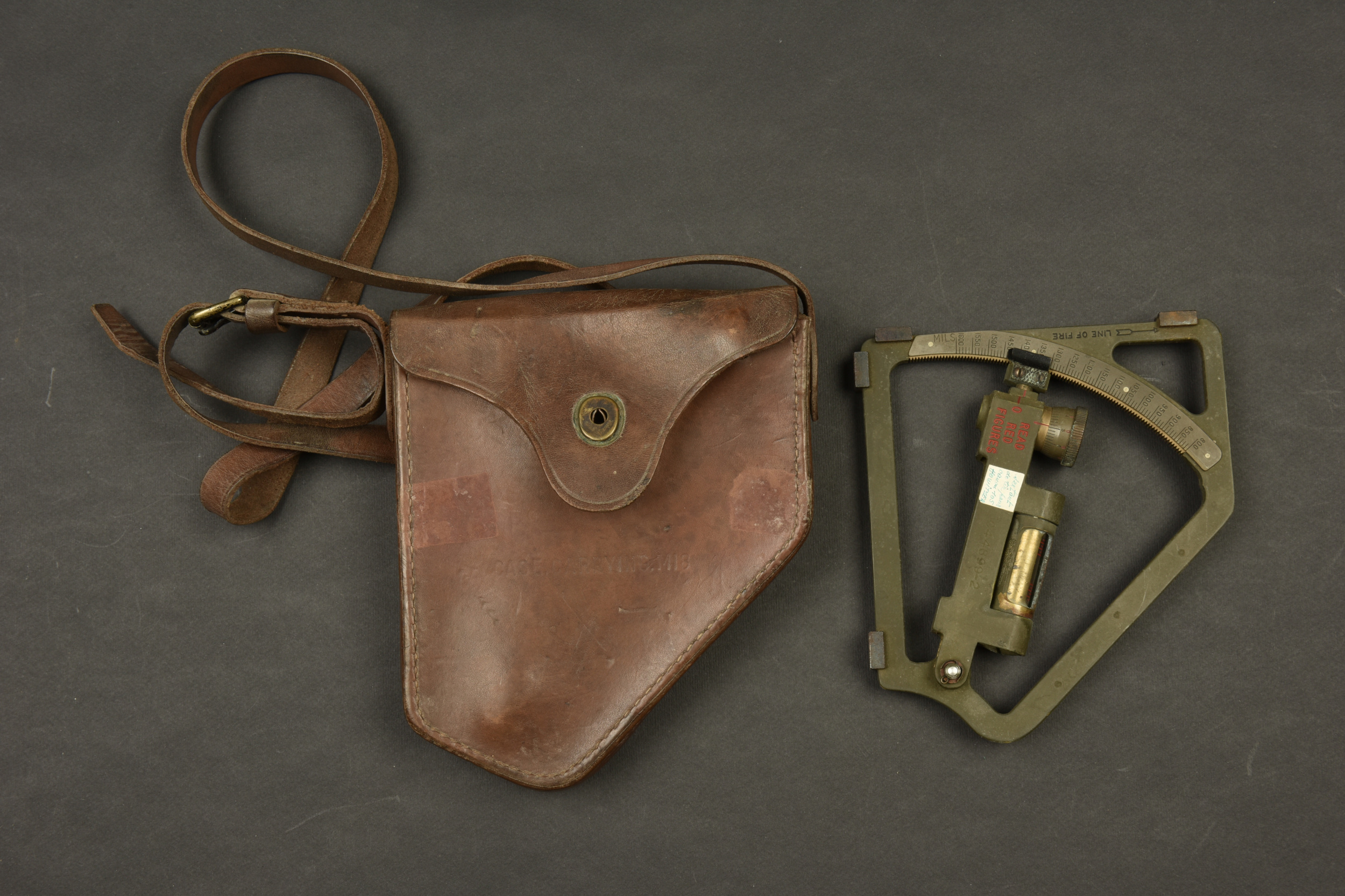 Quadrant Gunners M1. Instrument en métal, peinture kaki à 70%. Plaquette marquées Quadrant Gunners M1, numéro 58130, Mineapolis Honeywell Reg Co 1943. Niveau a bulle fonctionnel. Housse en épais cuir marron. Le bouton pression est fonctionnel. Sangle de transport présente. Marquages Case Carrying M18. A noter une certaine usure et patine de la pièce, ainsi que des tâches au niveau du cuir. Etat II+.