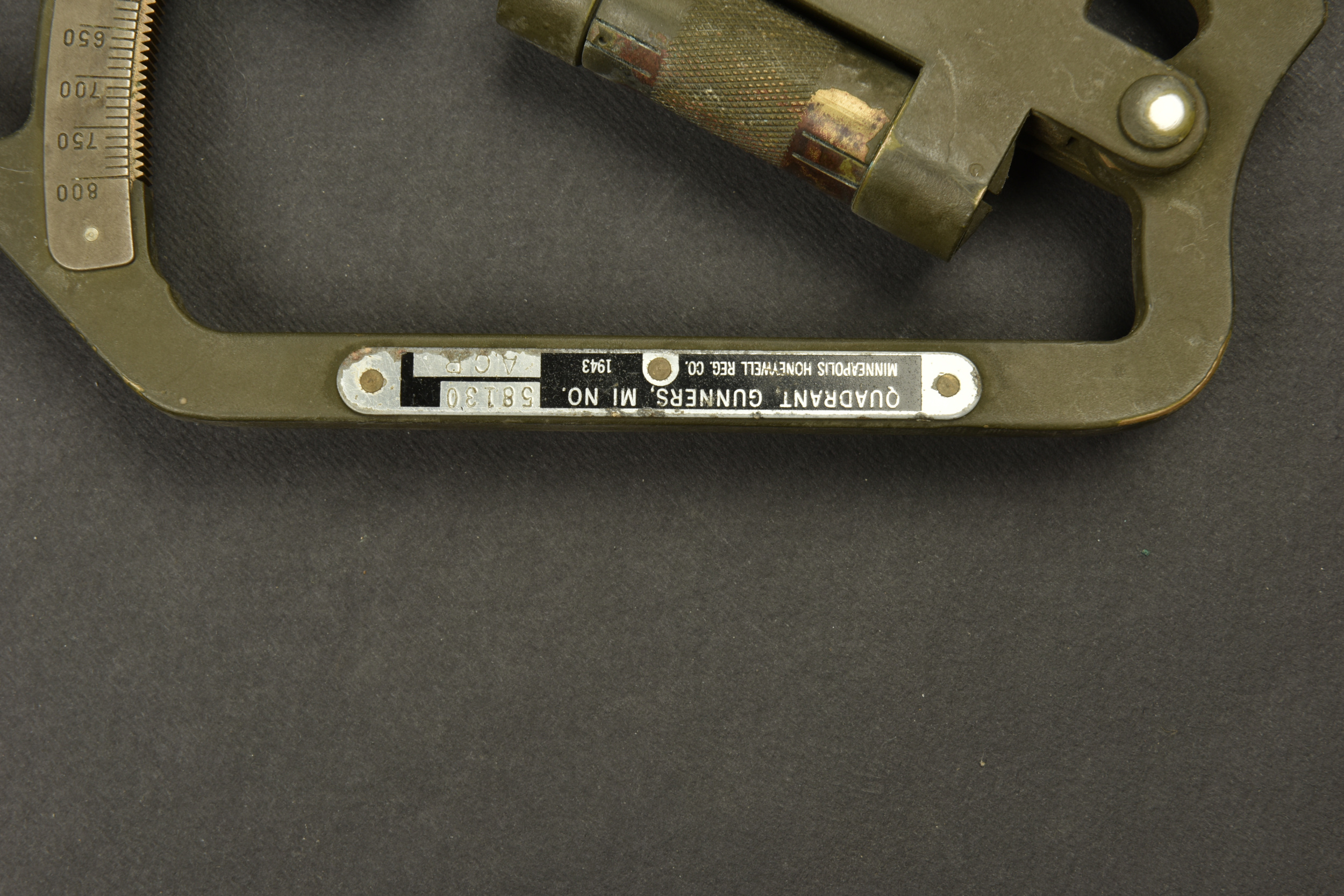 Quadrant Gunners M1. Instrument en métal, peinture kaki à 70%. Plaquette marquées Quadrant Gunners M1, numéro 58130, Mineapolis Honeywell Reg Co 1943. Niveau a bulle fonctionnel. Housse en... en savoir plus