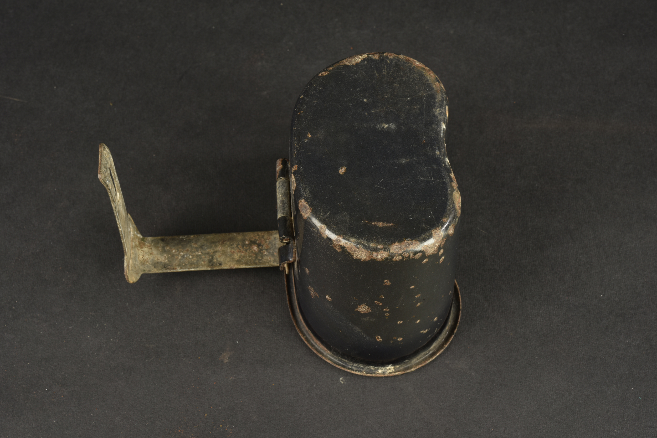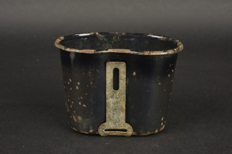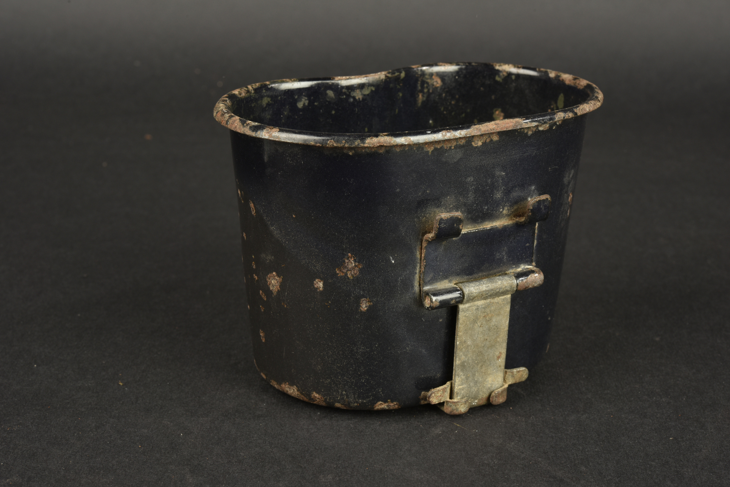 Quart émaillé US. En métal émaillé couleur bleue. Poignée en métal. Fabrication LF&Co 1942. La partie métallique est un peu oxydée. Quelques manques visibles au niveau de l’émail. A noter une certaine usure et patine de la pièce. Etat II+.