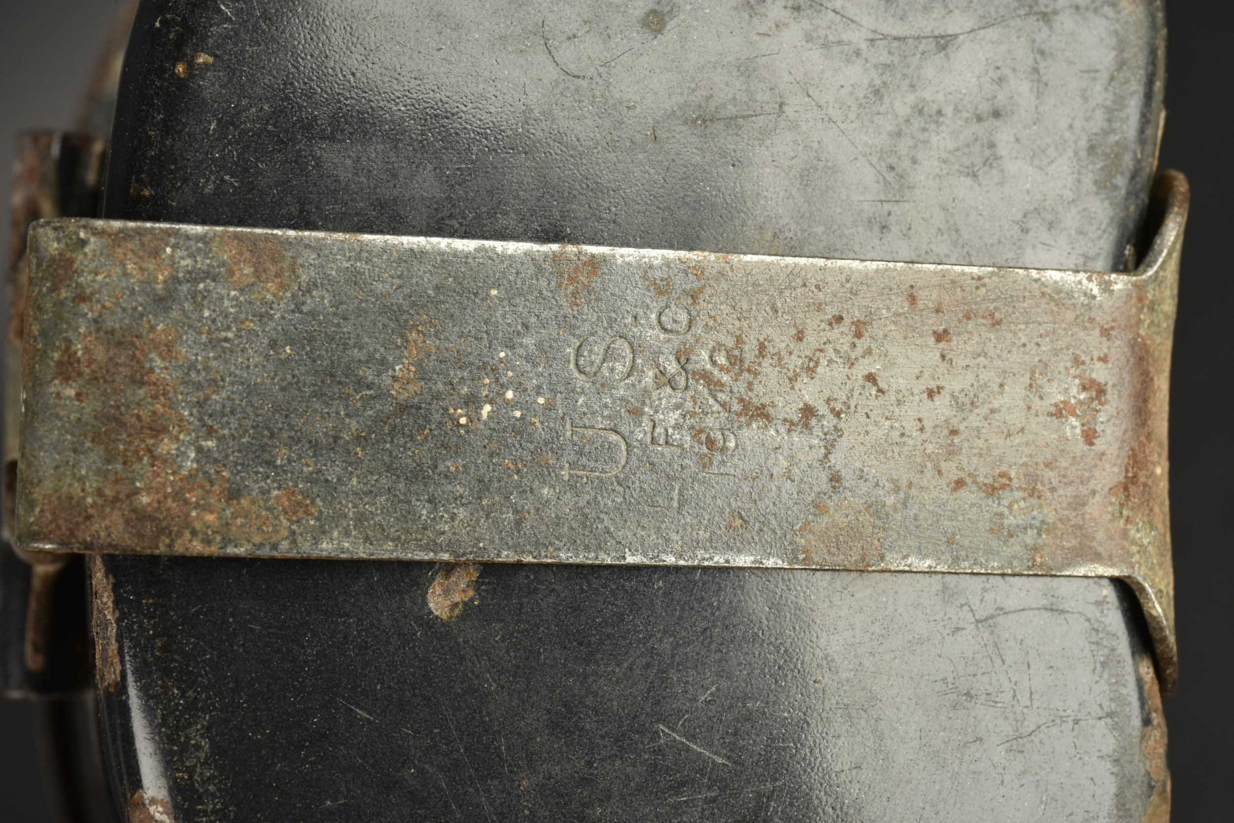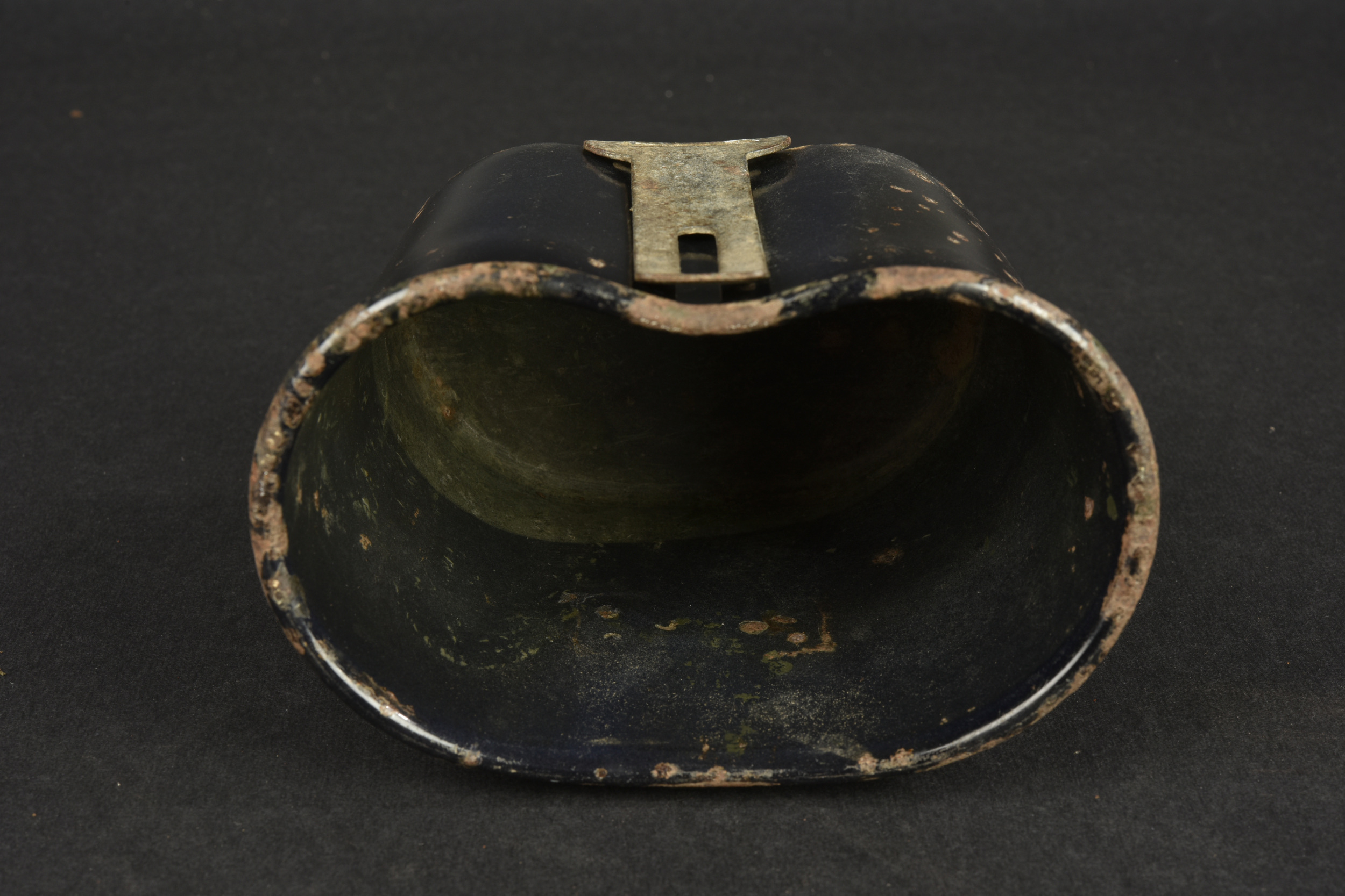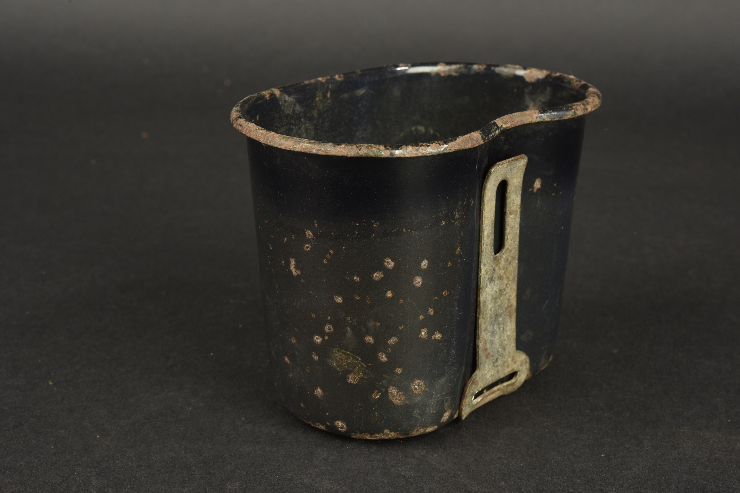 Quart émaillé US. En métal émaillé couleur bleue. Poignée en métal. Fabrication LF&Co 1942. La partie métallique est un peu oxydée. Quelques manques visibles au niveau de l’émail. A noter une certaine usure et patine de la pièce. Etat II+.