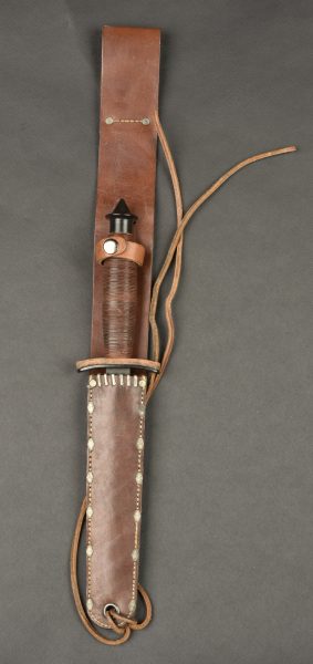 Détails de la vente >Reproduction de dague FSSF. Belle reproduction moderne dans son fourreau en cuir. Lacet en cuir présent. A noter une certaine usure et patine de la pièce. Etat II+.