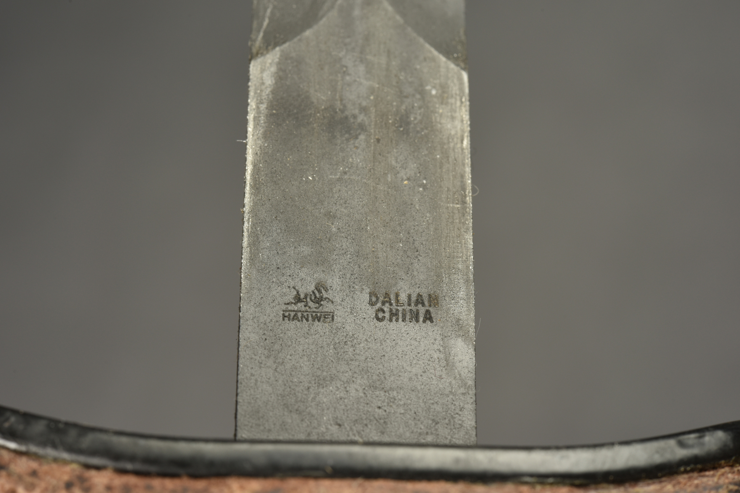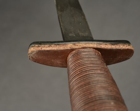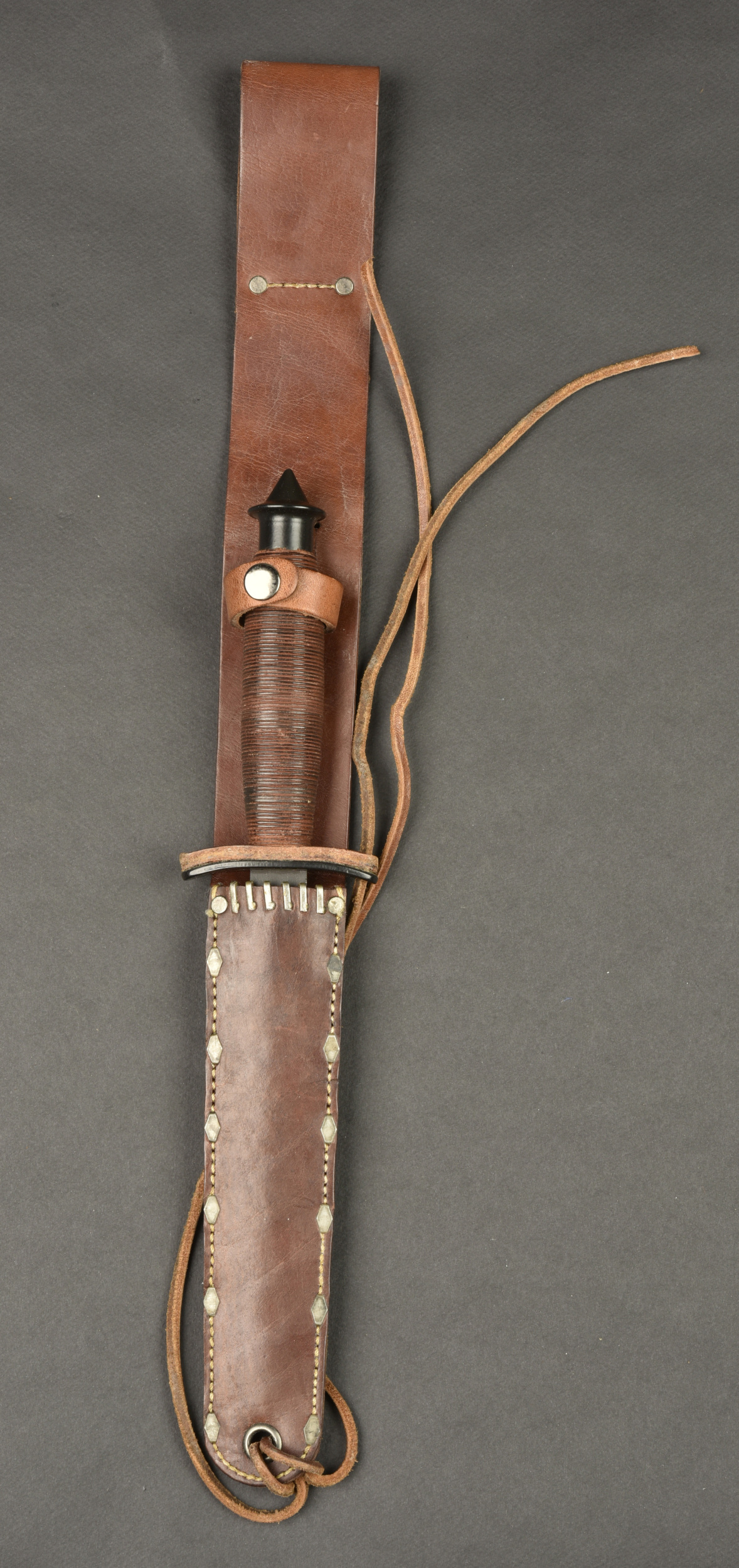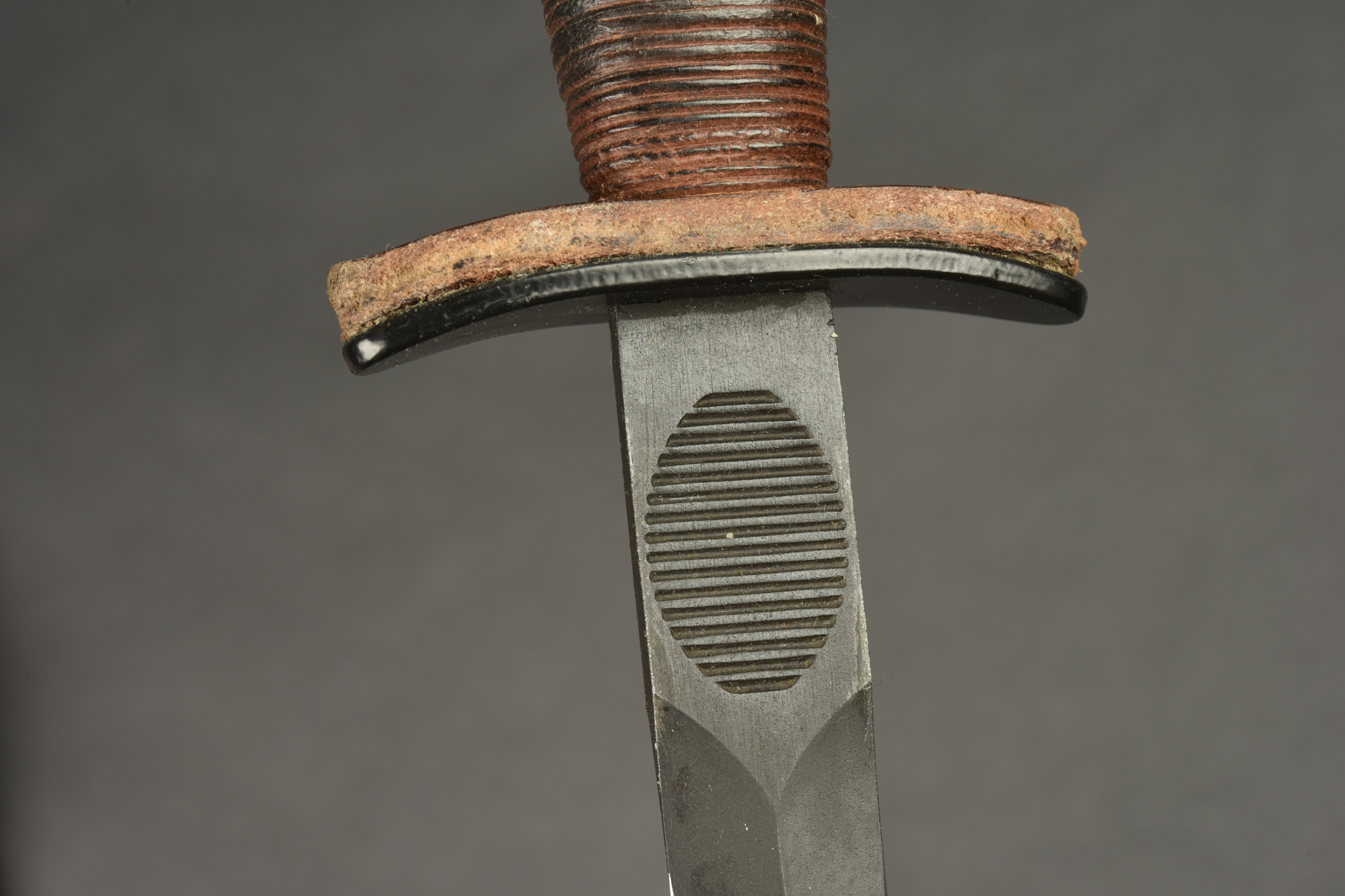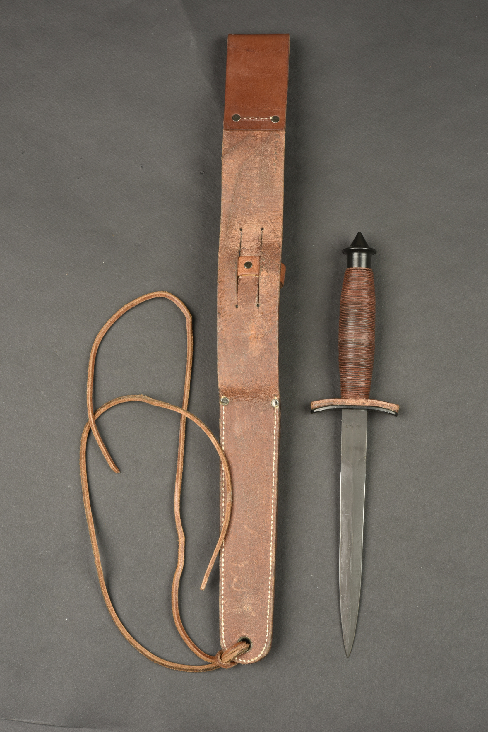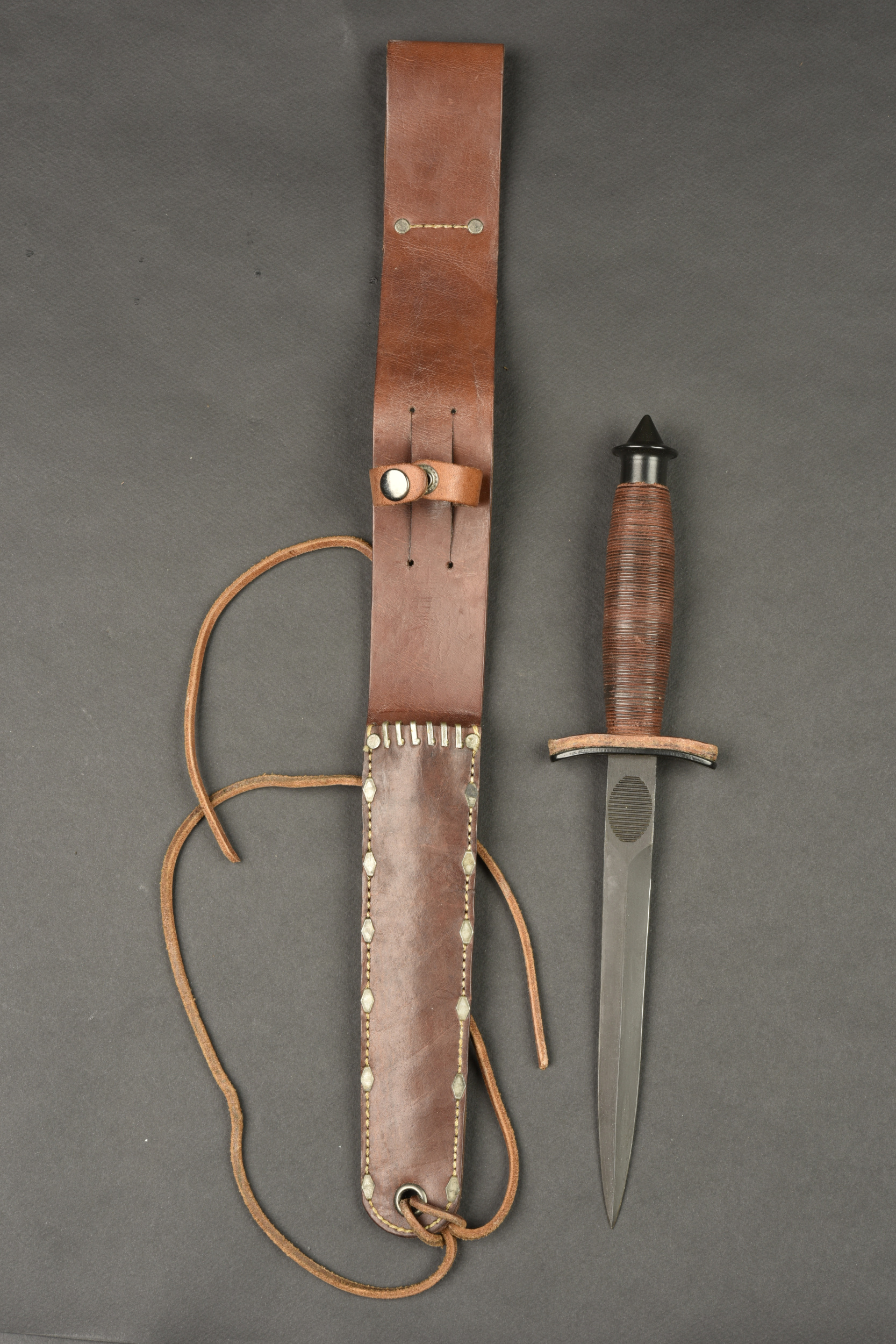 Reproduction de dague FSSF. Belle reproduction moderne dans son fourreau en cuir. Lacet en cuir présent. A noter une certaine usure et patine de la pièce. Etat II+.