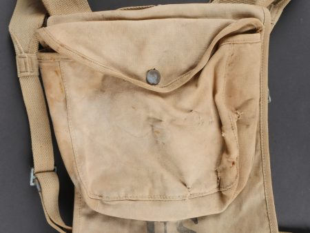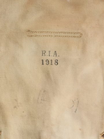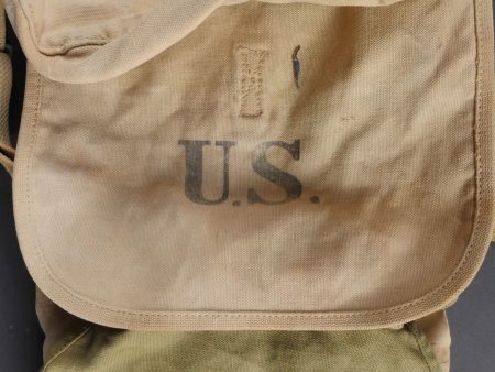 Sac à dos US M-1910. En forte toile OD, beau marquage US sur le rabat. Le triangle est un modèle de la seconde guerre mondiale, avec sa sangle en cuir. Toutes les sangles sont présentes. Fabrication RIA 1918. Pochette pour gamelle complète avec son bouton de fermeture. A noter une certaine usure et patine de la pièce, ainsi que des tâches. Etat II+.