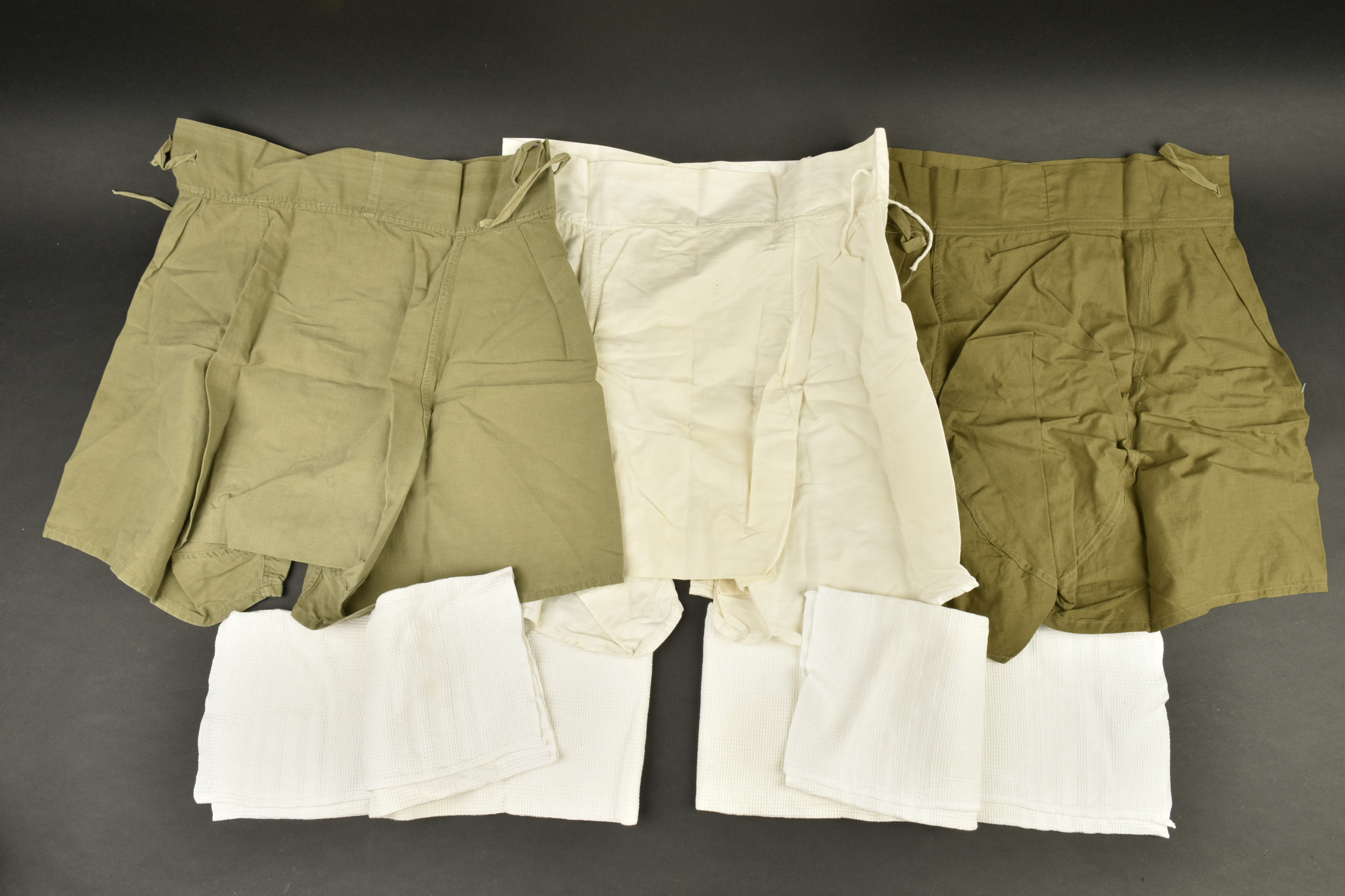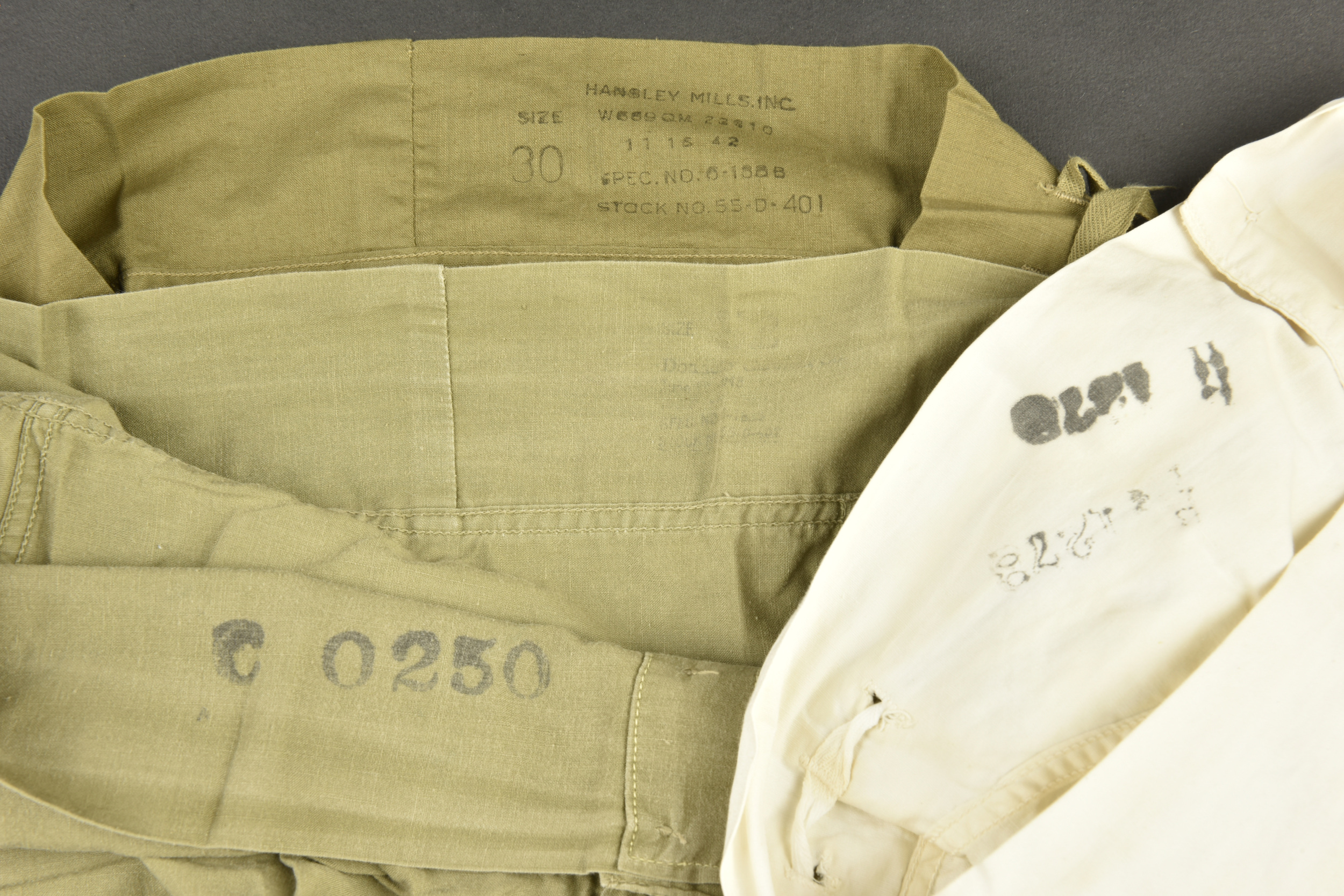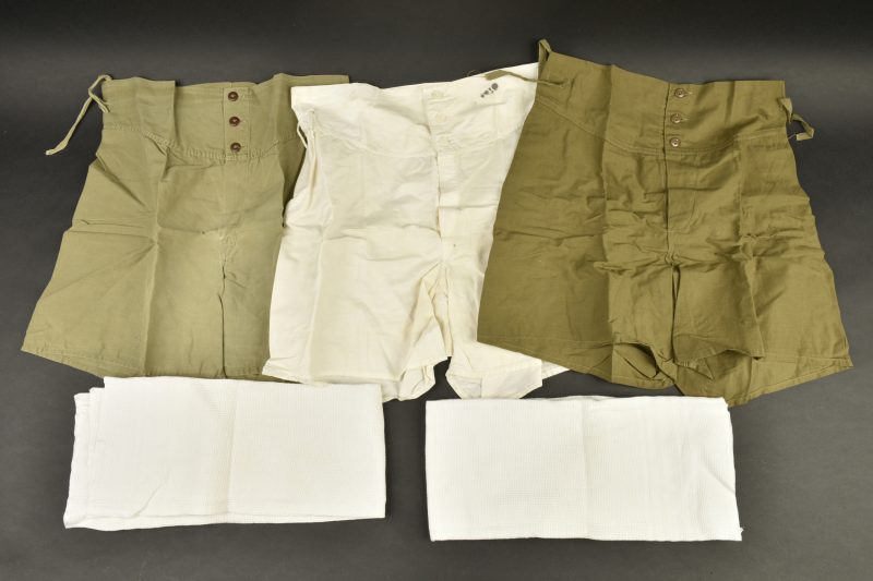 Sous-vêtement US. Comprenant un caleçon court en toile kaki, tous les boutons sont présents. Le cordon de serrage est présent, taille 30, daté du 15 novembre 1942. Un caleçon court en tissu coton blanc, tous les boutons sont présents, le cordon de serrage est présent. Laundry number H-1278. Sans marquages fabricant visibles. Un caleçon en tissu coton kaki, tous les boutons sont présents, le cordon de serrage est présent. Laundry number C-0250. Deux serviettes en tissu coton nid d’abeille blanc. Sans marquages visibles. A noter une certaine usure et patine des pièces. Etat II+.