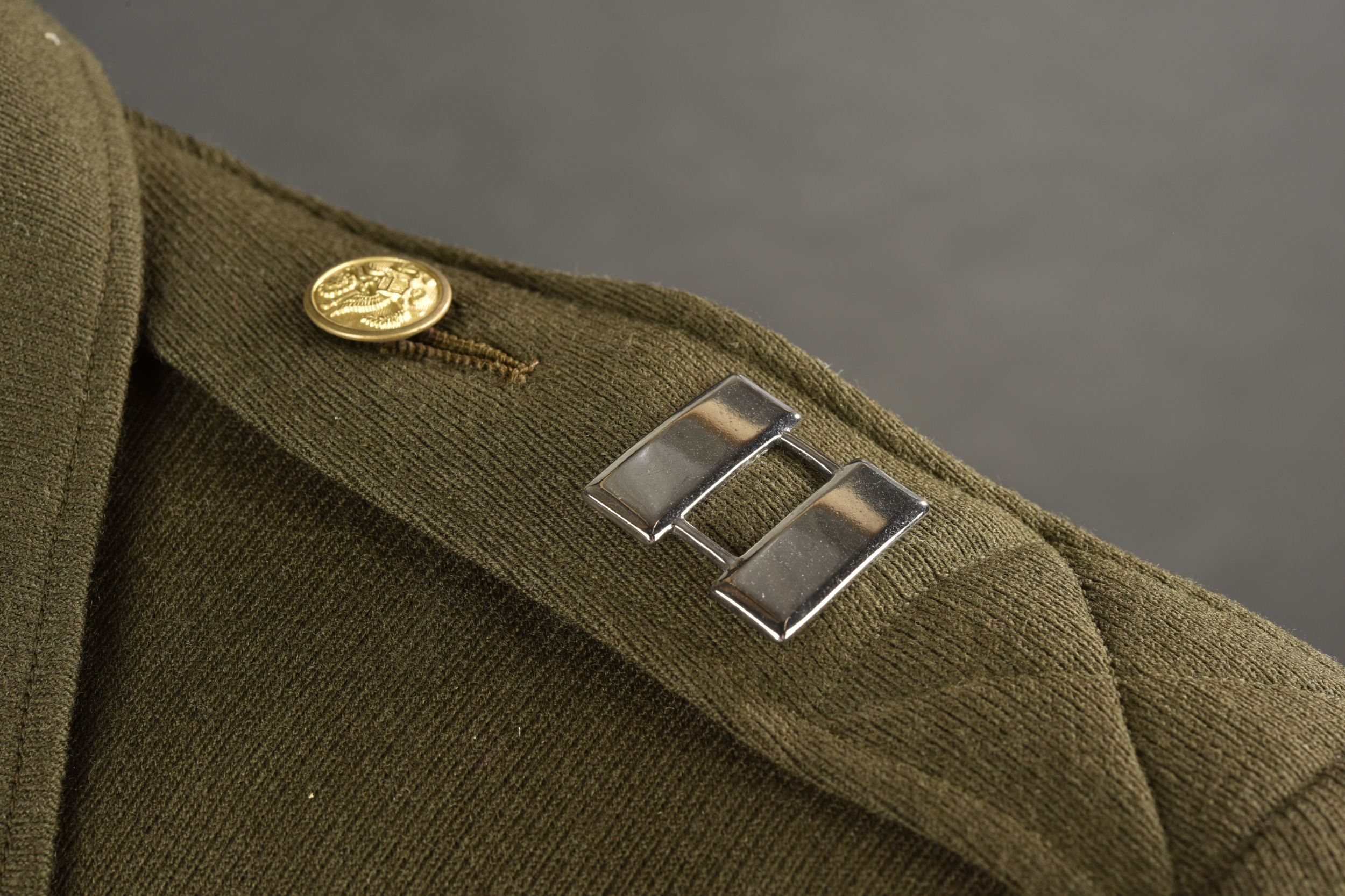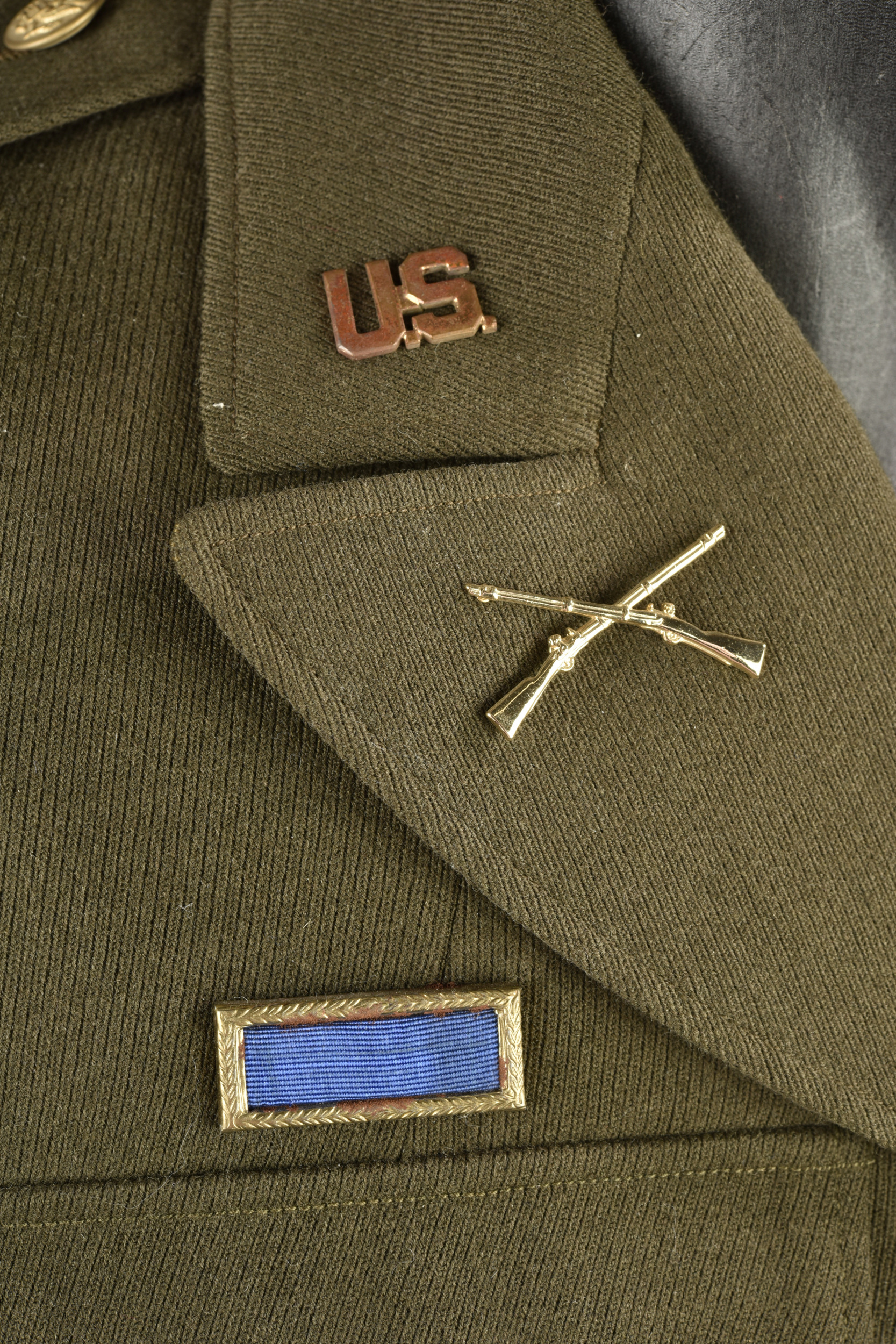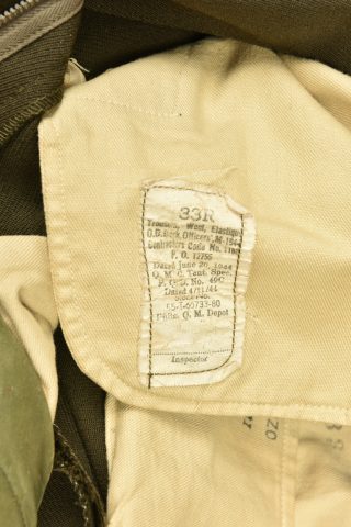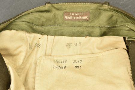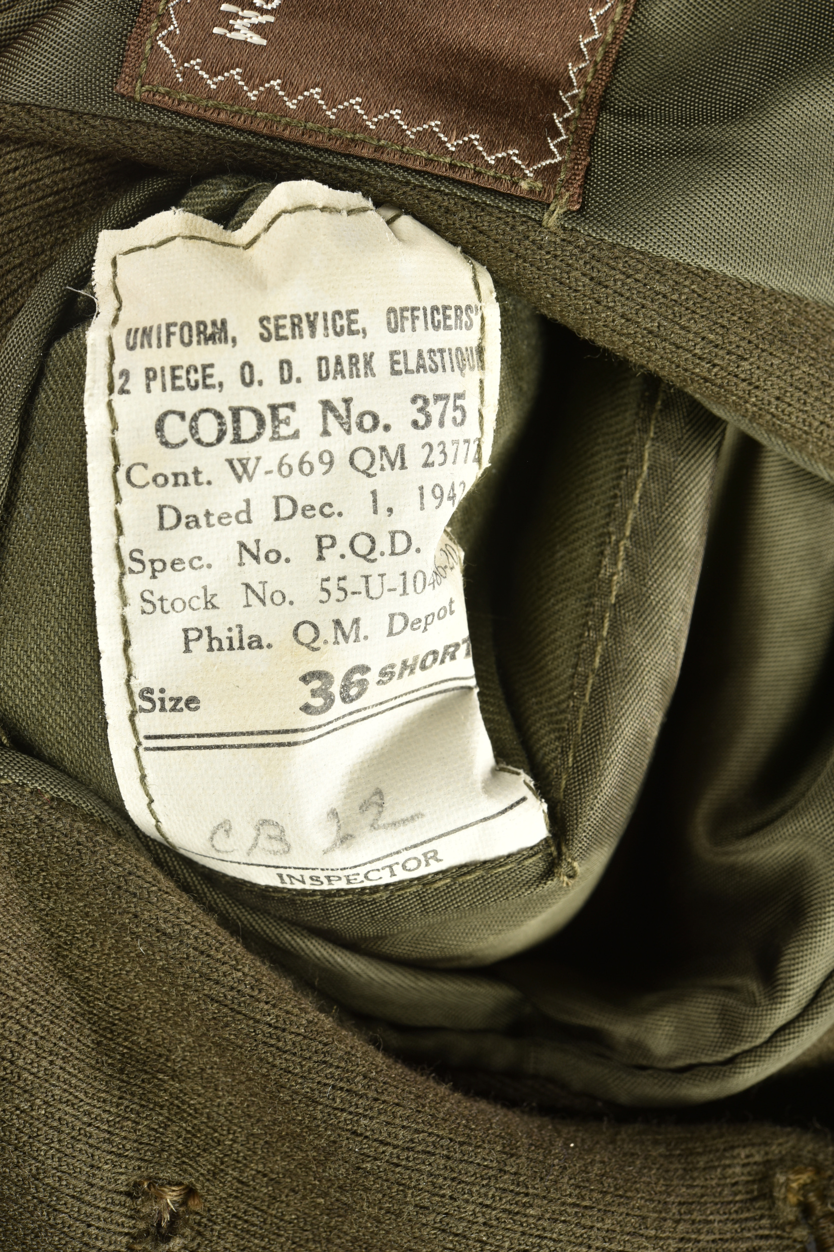 Uniforme d’officier de la 29ème DI US. Comprenant une vareuse en tissu coton couleur chocolat. Tous les boutons dorés et estampillés de l’aigle américain sont présents. La ceinture est manquante. Insigne de manche de la 29ème DI recousu. Grades de capitaine postérieurs. Insignes de col d’officier d’infanterie US. Les insigne de l’infanterie sont postérieurs. Barette de décoration de la purple heart et de l’American Defense. Citation présidentielle complète. Intérieur doublé en satinette kaki. Etiquette du tailleur marquée 375, datée du 1er décembre 1942. Taille 36S. Un pantalon en drap coton couleur chocolat, tous les boutons sont présents. Fermeture éclaire fonctionnelle, mais oxydée. Intérieur doublé en satinette kaki et tissu coton blanc. Etiquette du fabricant 12755, datée du 20 juin 1944. Taille 33R. A noter une certaine usure et patine des pièces, ainsi que quelque discrètes tâches et traces de mite. Etat II+.