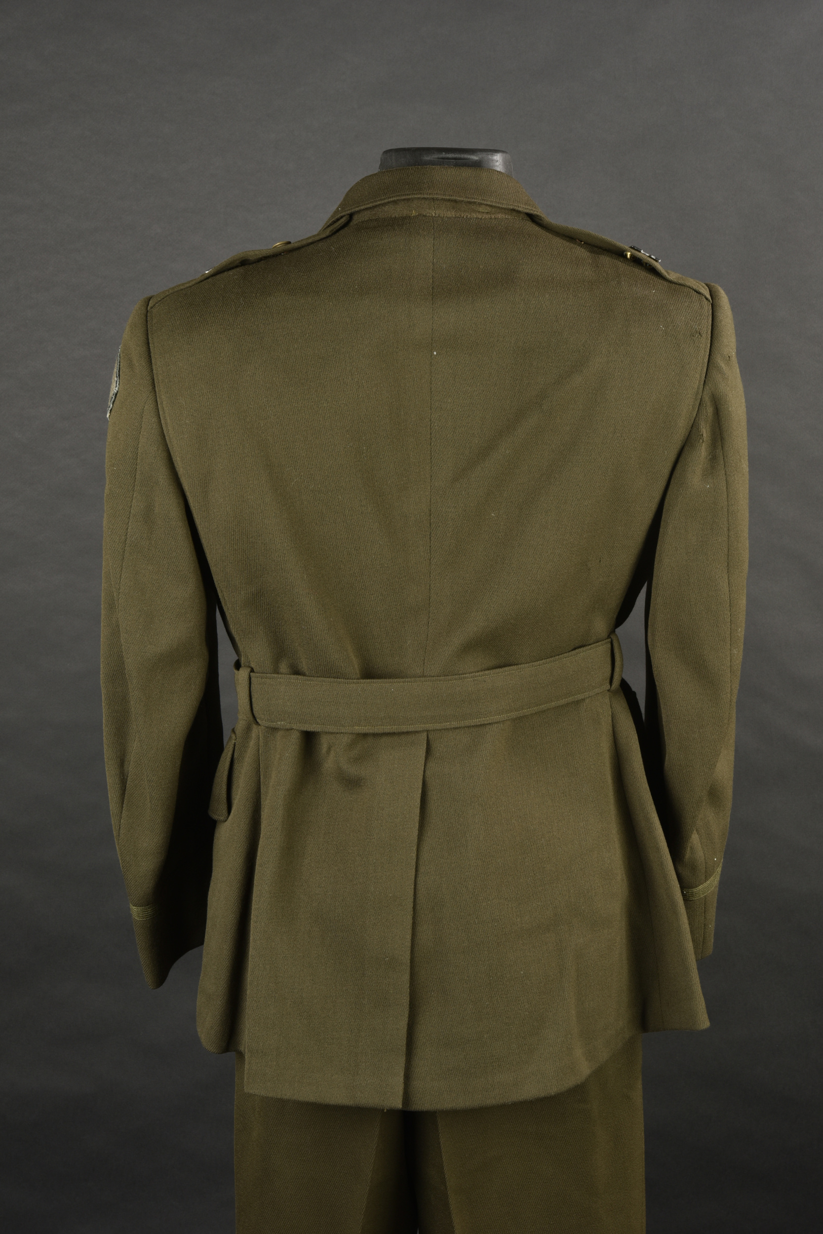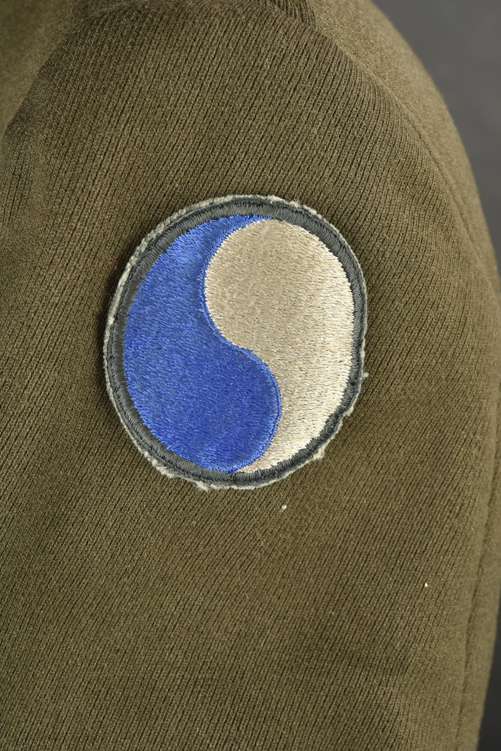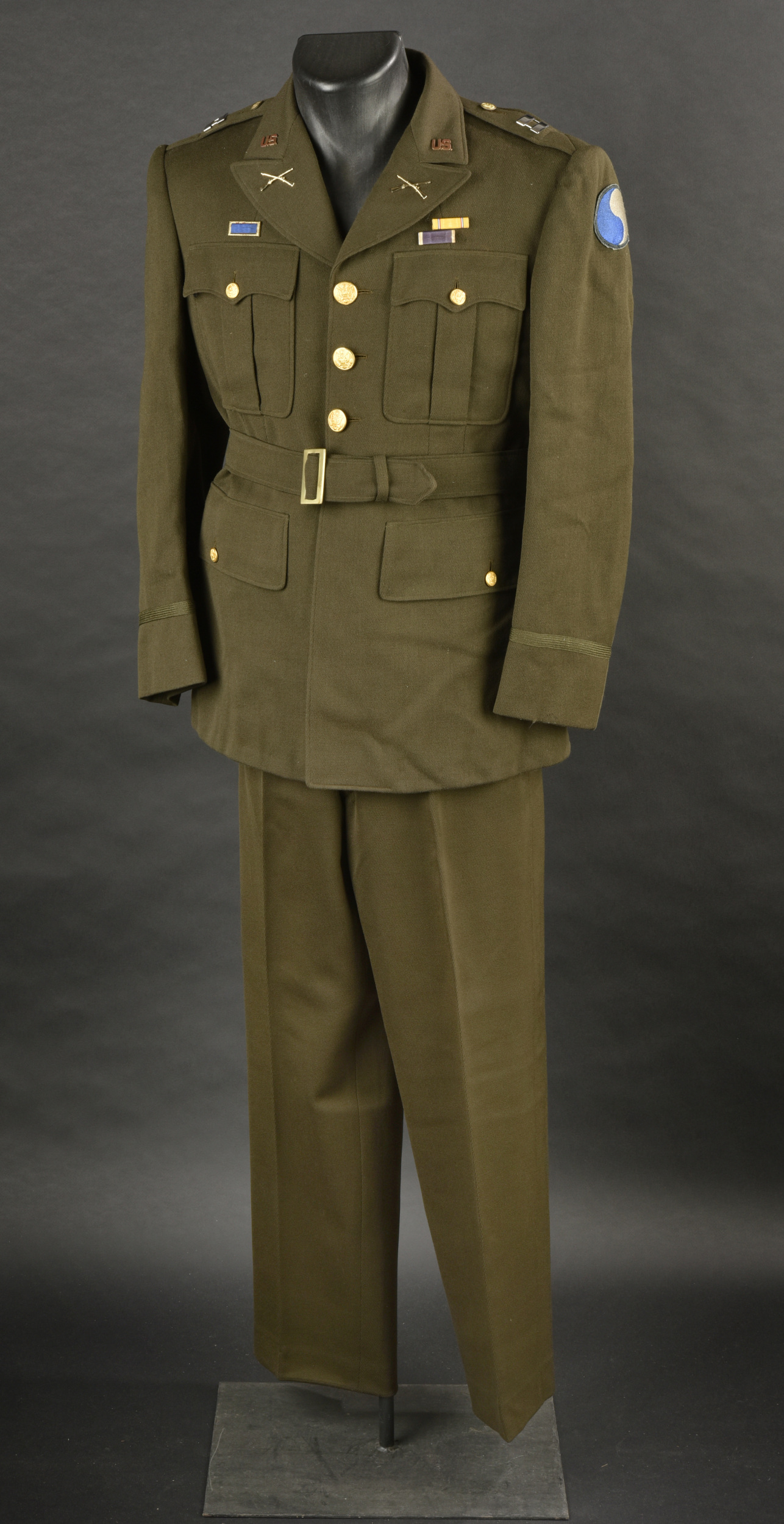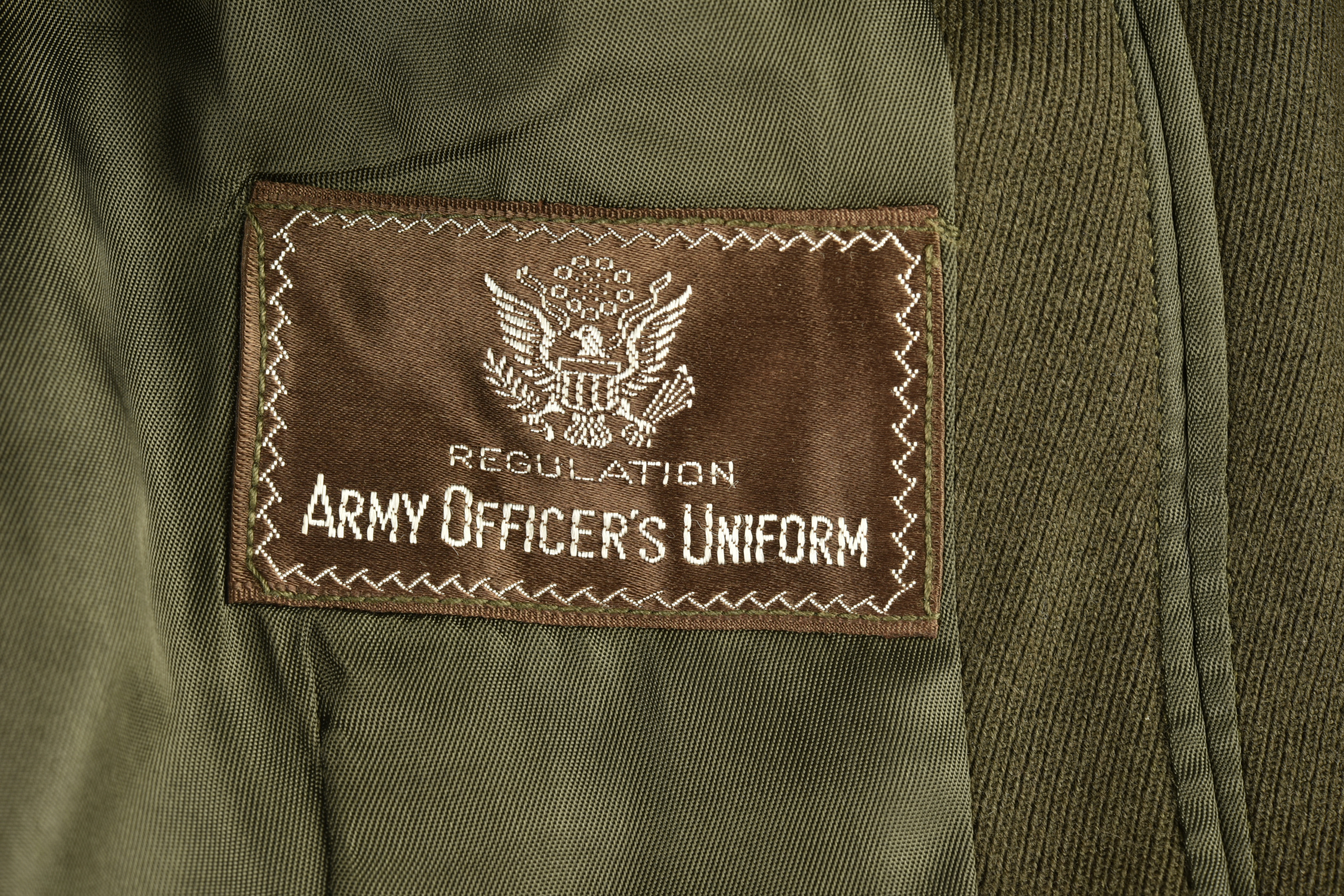 Uniforme d’officier de la 29ème DI US. Comprenant une vareuse en tissu coton couleur chocolat. Tous les boutons dorés et estampillés de l’aigle américain sont présents. La ceinture est manquante. Insigne de manche de la 29ème DI recousu. Grades de capitaine postérieurs. Insignes de col d’officier d’infanterie US. Les insigne de l’infanterie sont postérieurs. Barette de décoration de la purple heart et de l’American Defense. Citation présidentielle complète. Intérieur doublé en satinette kaki. Etiquette du tailleur marquée 375, datée du 1er décembre 1942. Taille 36S. Un pantalon en drap coton couleur chocolat, tous les boutons sont présents. Fermeture éclaire fonctionnelle, mais oxydée. Intérieur doublé en satinette kaki et tissu coton blanc. Etiquette du fabricant 12755, datée du 20 juin 1944. Taille 33R. A noter une certaine usure et patine des pièces, ainsi que quelque discrètes tâches et traces de mite. Etat II+.