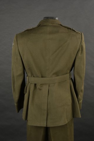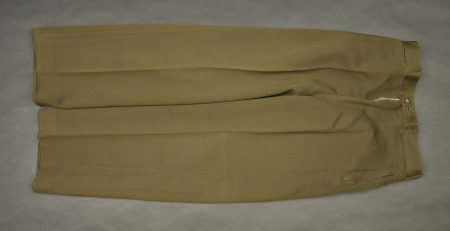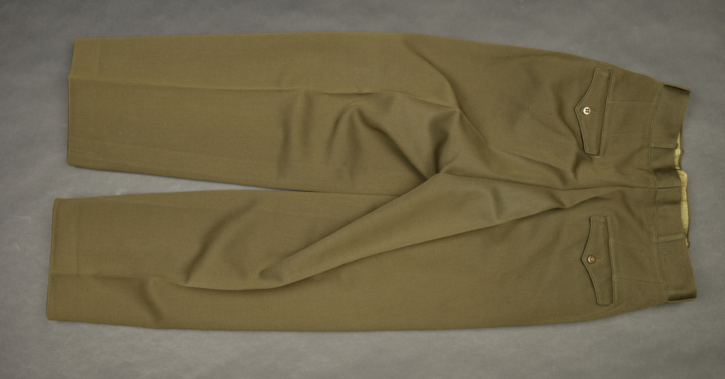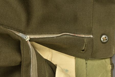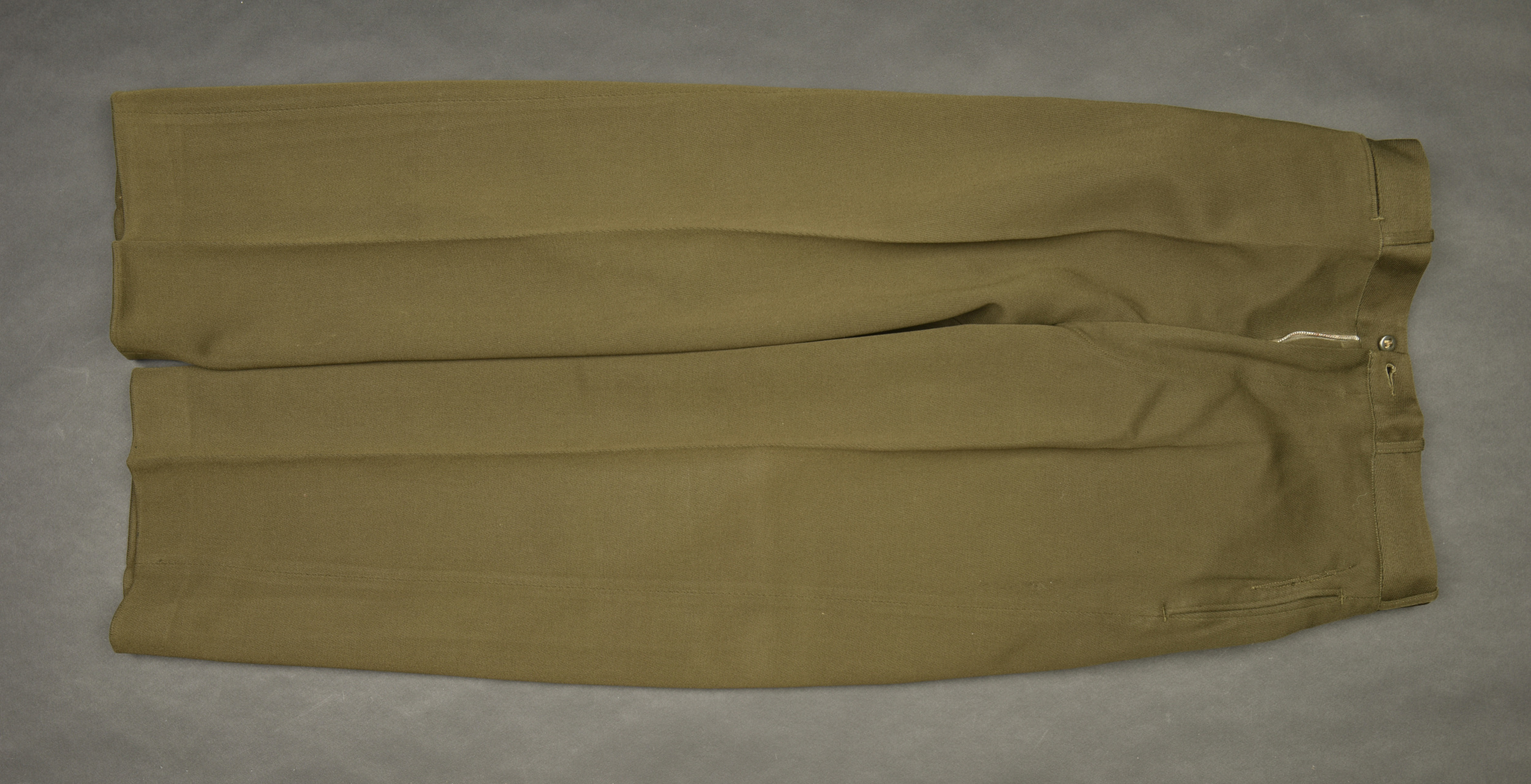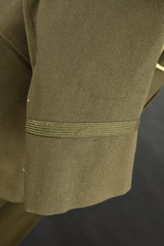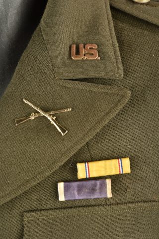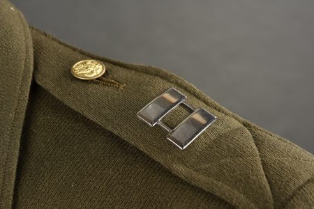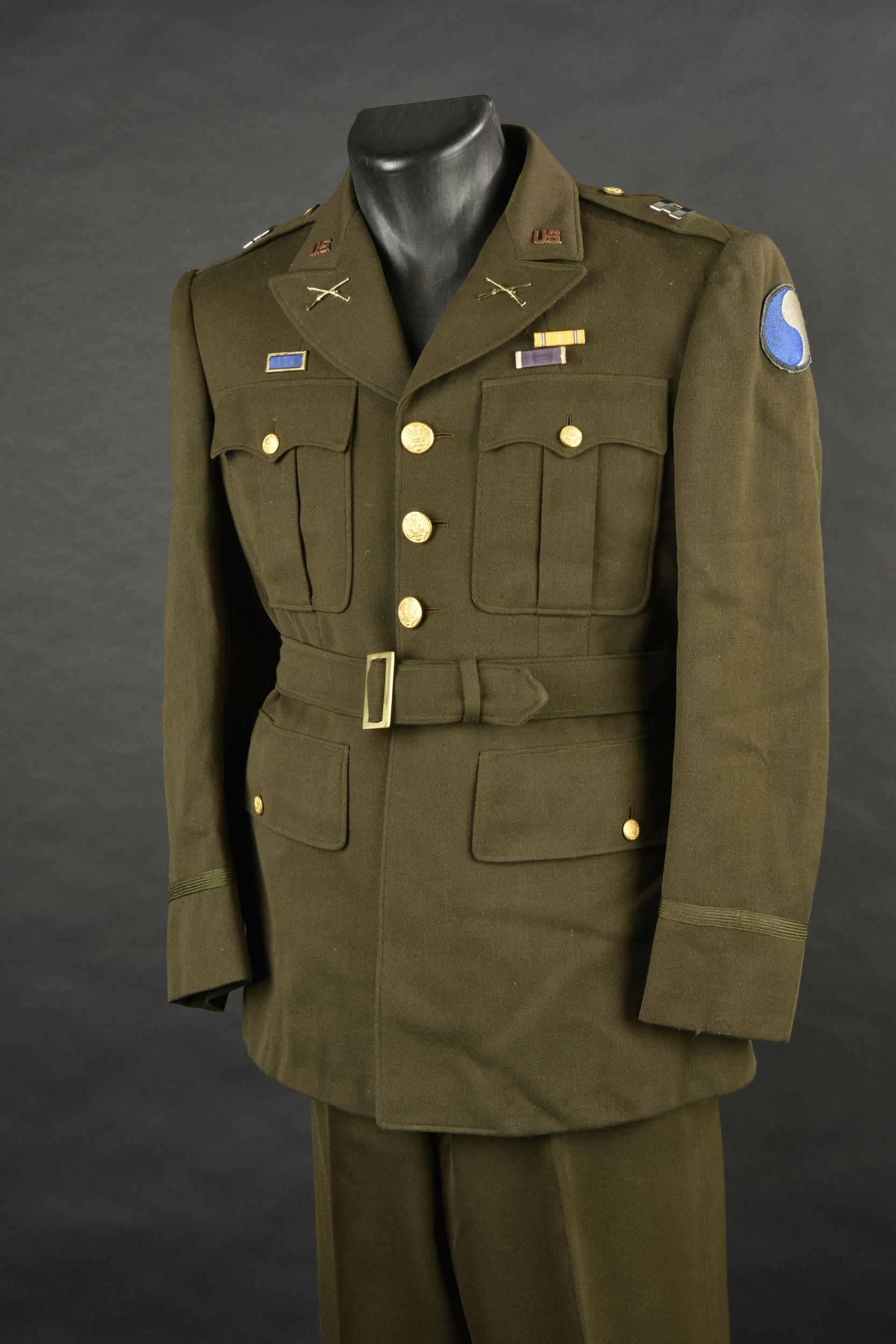 Uniforme d’officier de la 29ème DI US. Comprenant une vareuse en tissu coton couleur chocolat. Tous les boutons dorés et estampillés de l’aigle américain sont présents. La ceinture est manquante. Insigne de manche de la 29ème DI recousu. Grades de capitaine postérieurs. Insignes de col d’officier d’infanterie US. Les insigne de l’infanterie sont postérieurs. Barette de décoration de la purple heart et de l’American Defense. Citation présidentielle complète. Intérieur doublé en satinette kaki. Etiquette du tailleur marquée 375, datée du 1er décembre 1942. Taille 36S. Un pantalon en drap coton couleur chocolat, tous les boutons sont présents. Fermeture éclaire fonctionnelle, mais oxydée. Intérieur doublé en satinette kaki et tissu coton blanc. Etiquette du fabricant 12755, datée du 20 juin 1944. Taille 33R. A noter une certaine usure et patine des pièces, ainsi que quelque discrètes tâches et traces de mite. Etat II+.