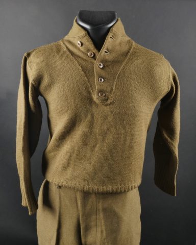 Uniforme US. Comprenant un pull 5 boutons, en épais lainage kaki, les cinq boutons sont présents, trace d’une étiquette dans le col. Quelques discrets trous de mite. Un pantalon moutarde, tous les boutons sont présents, bavette anti-gaz complète, intérieur doublé en tissu coton blanc, taille W 32 L33, étiquette du fabricant Corman & Wasserman, datée du 5 janvier 1945. A noter une certaine usure et patine des pièces, ainsi que quelques traces de mite. Etat II+.