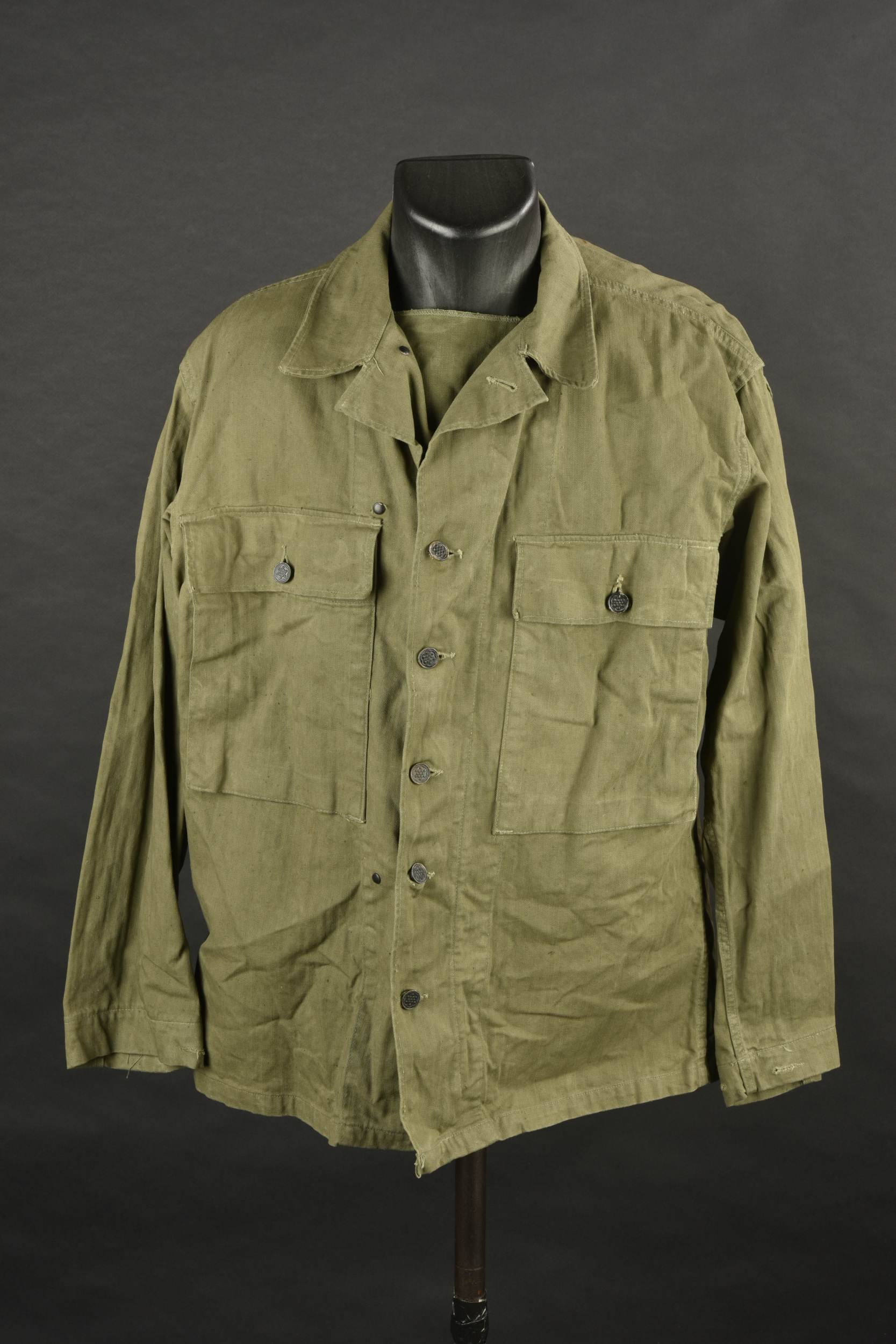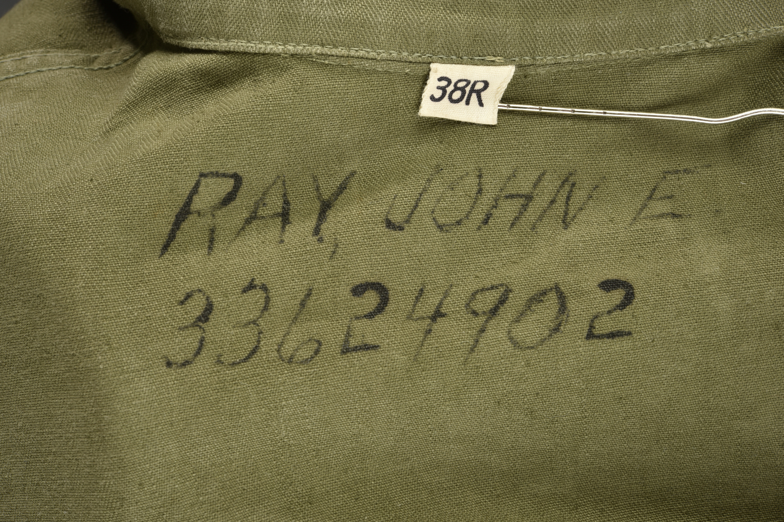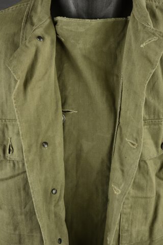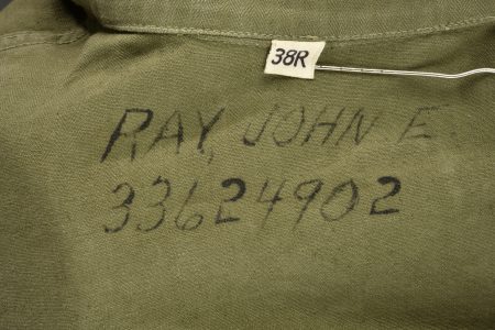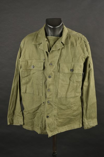 Veste HBT nominative. En tissu HBT couleur OD7. La texture du tissu peut faire penser à une imprégnation par un produit anti-gaz, en effet le tissu est poisseux au touché. Tous les boutons sont présents et estampillés de treize étoiles. Bavette anti-gaz complète. Etiquette dans le col indiquant une taille 38R. Indication nominative dans le col Ray John E 33624902. Etiquette fabricant présente, mais illisible. Selon nos recherche Ray Joh, est un résident d’Alaska, il a été incorporé le 4 mai 1943 à Allentown Pennsylvanie. A noter une certaine usure et patine de la pièce, ainsi que quelques tâches. Etat II+.