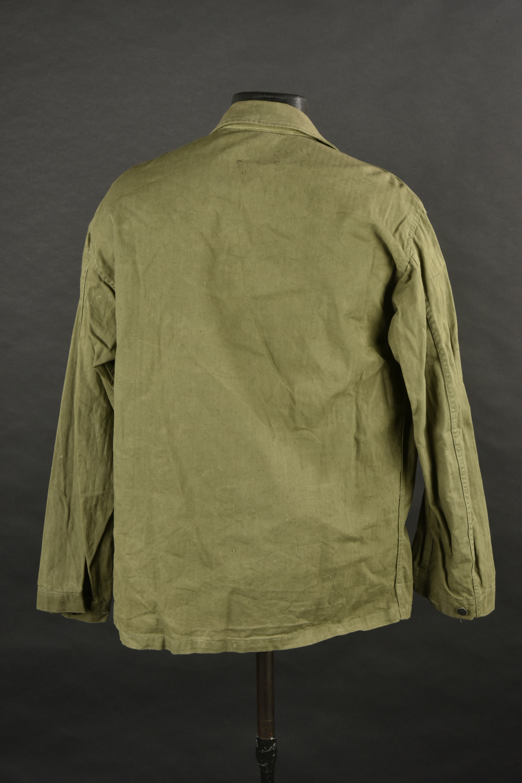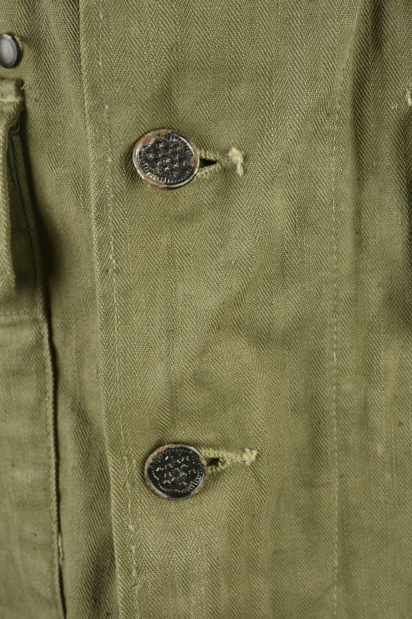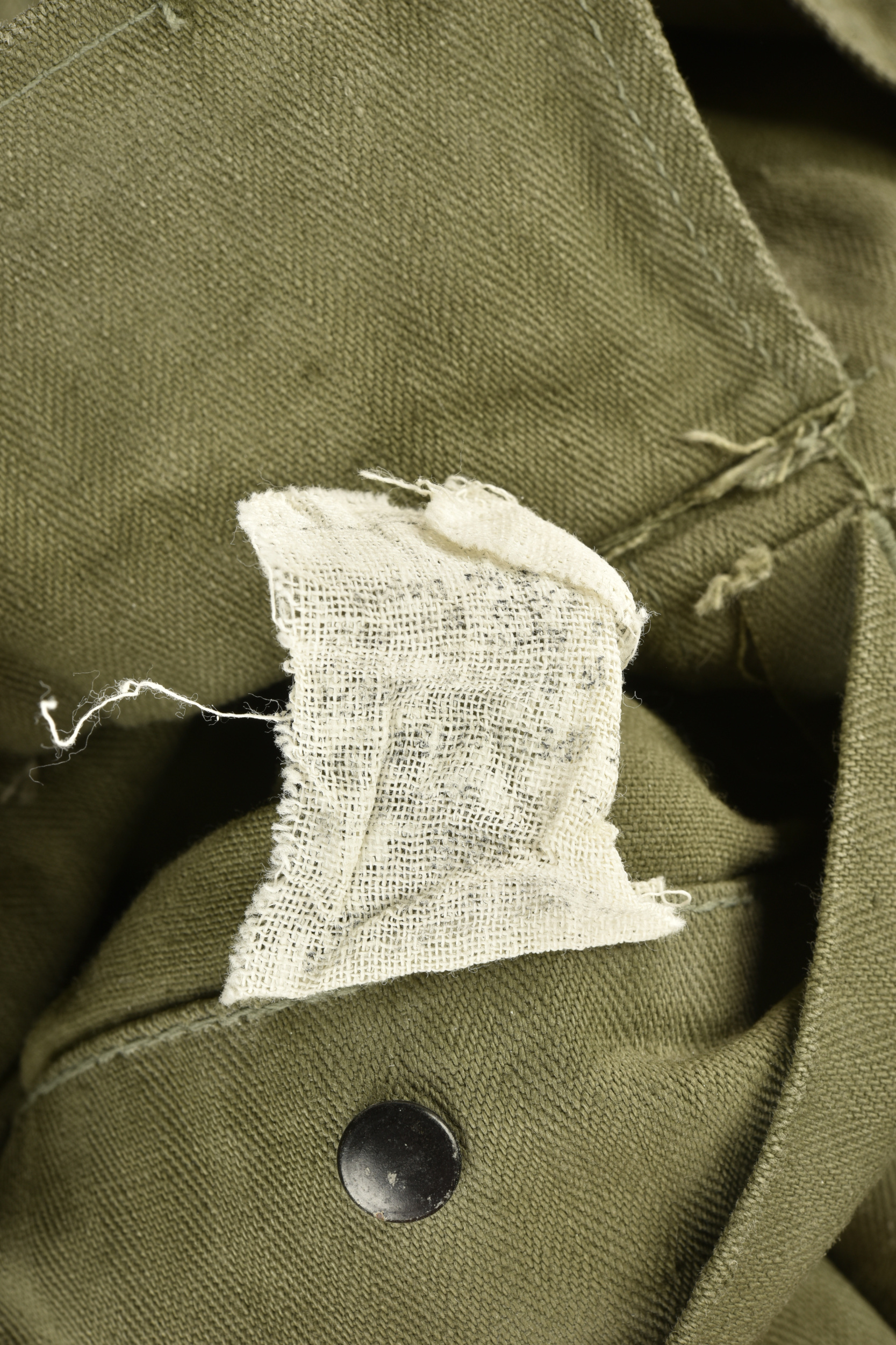 Veste HBT nominative. En tissu HBT couleur OD7. La texture du tissu peut faire penser à une imprégnation par un produit anti-gaz, en effet le tissu est poisseux au touché. Tous les boutons sont présents et estampillés de treize étoiles. Bavette anti-gaz complète. Etiquette dans le col indiquant une taille 38R. Indication nominative dans le col Ray John E 33624902. Etiquette fabricant présente, mais illisible. Selon nos recherche Ray Joh, est un résident d’Alaska, il a été incorporé le 4 mai 1943 à Allentown Pennsylvanie. A noter une certaine usure et patine de la pièce, ainsi que quelques tâches. Etat II+.
