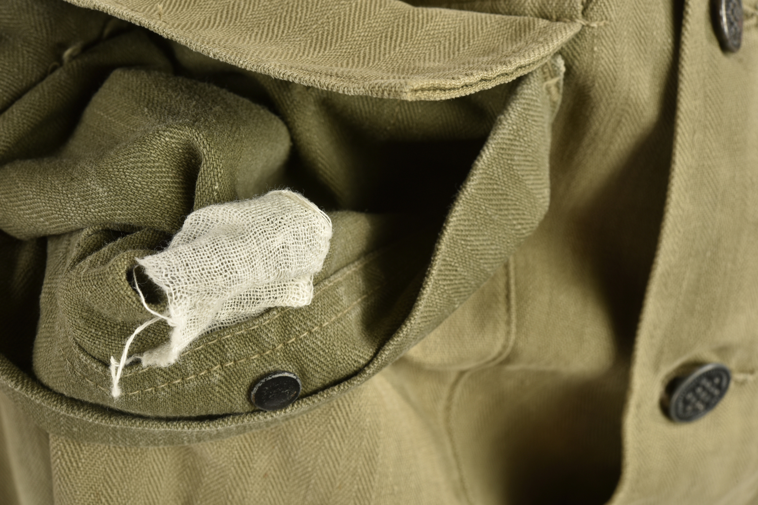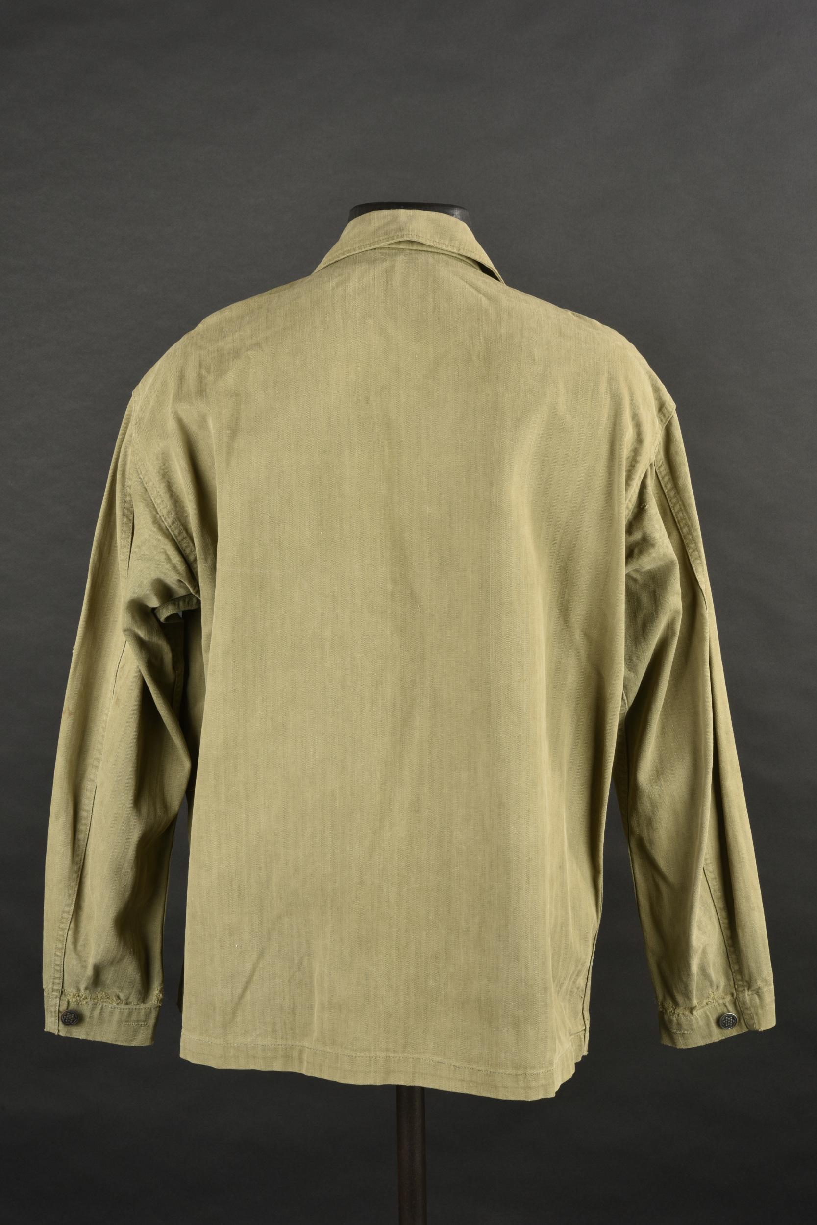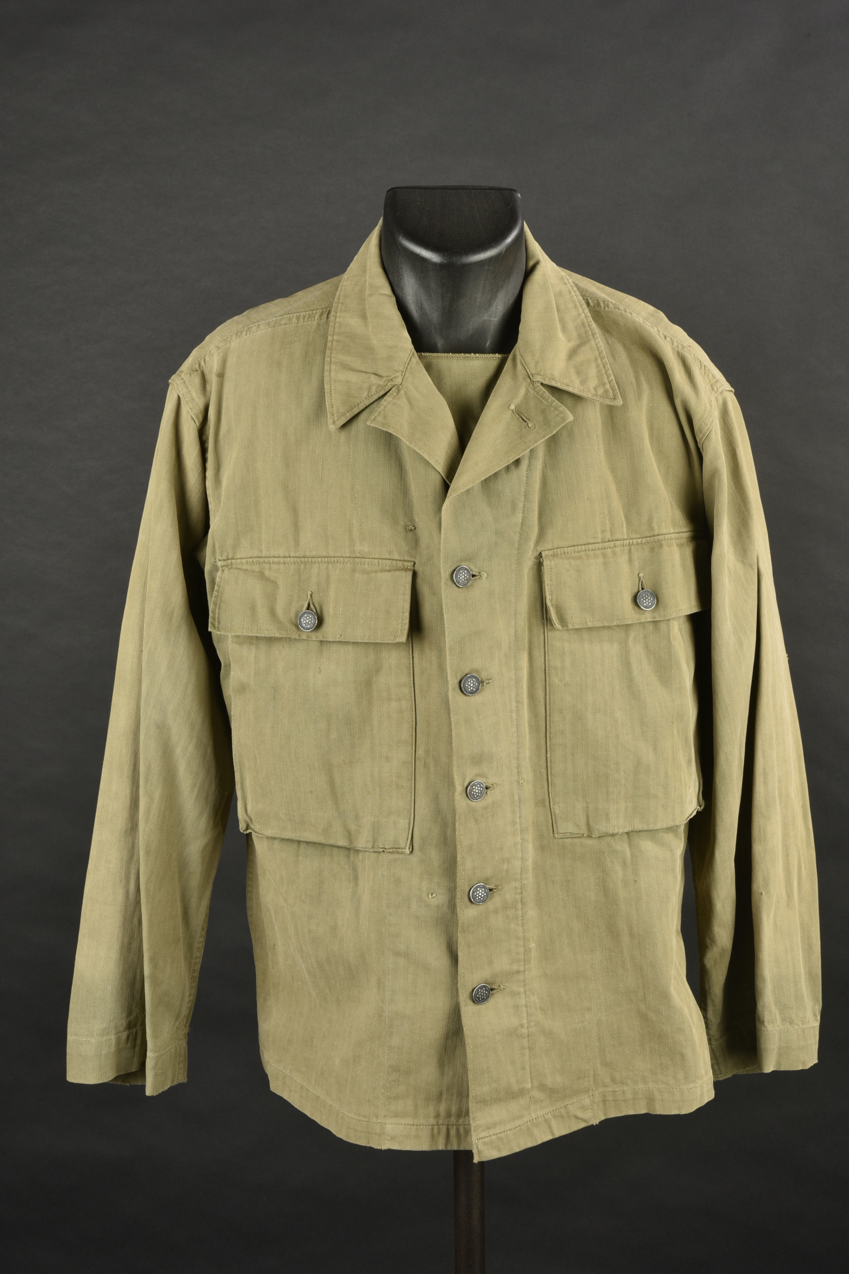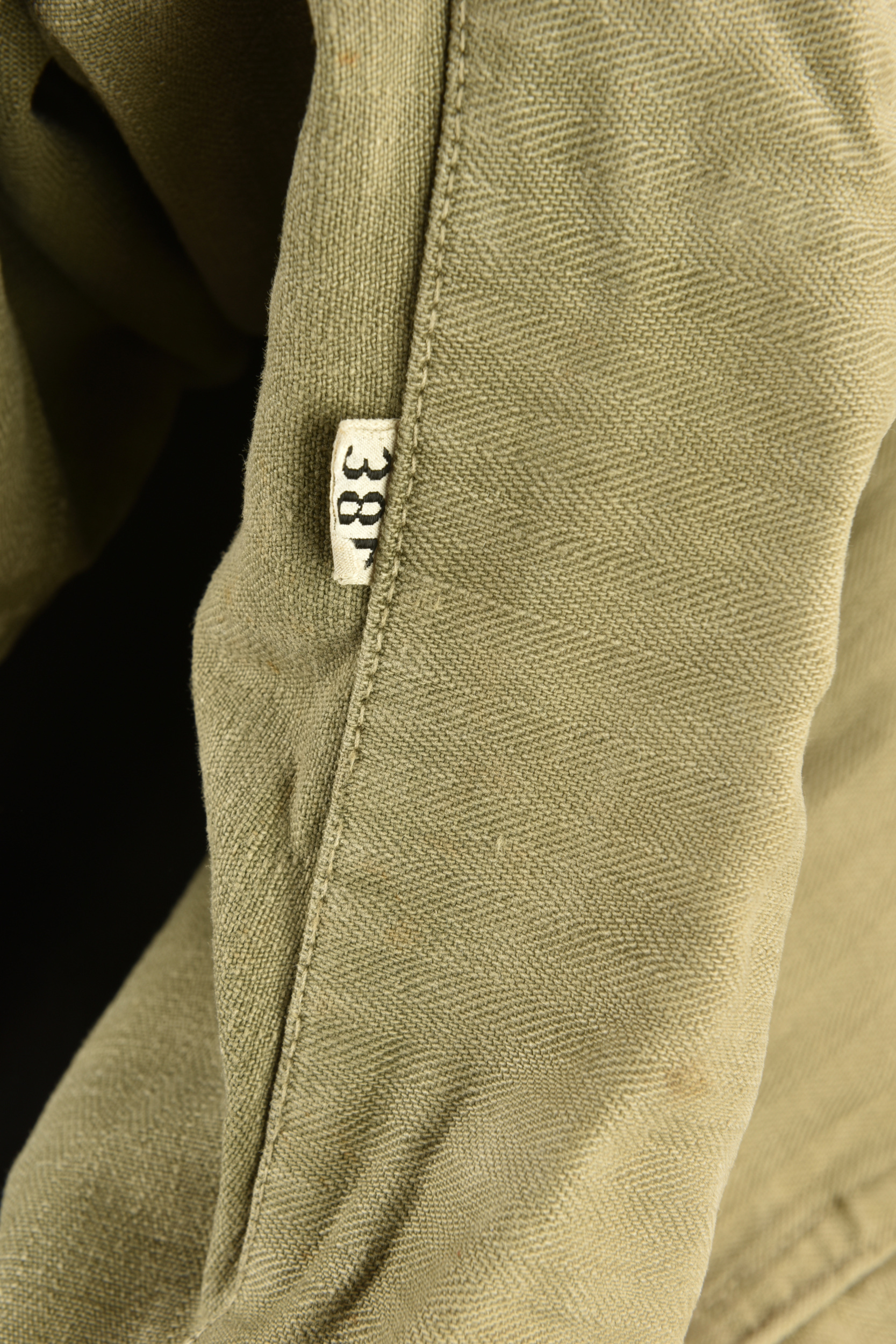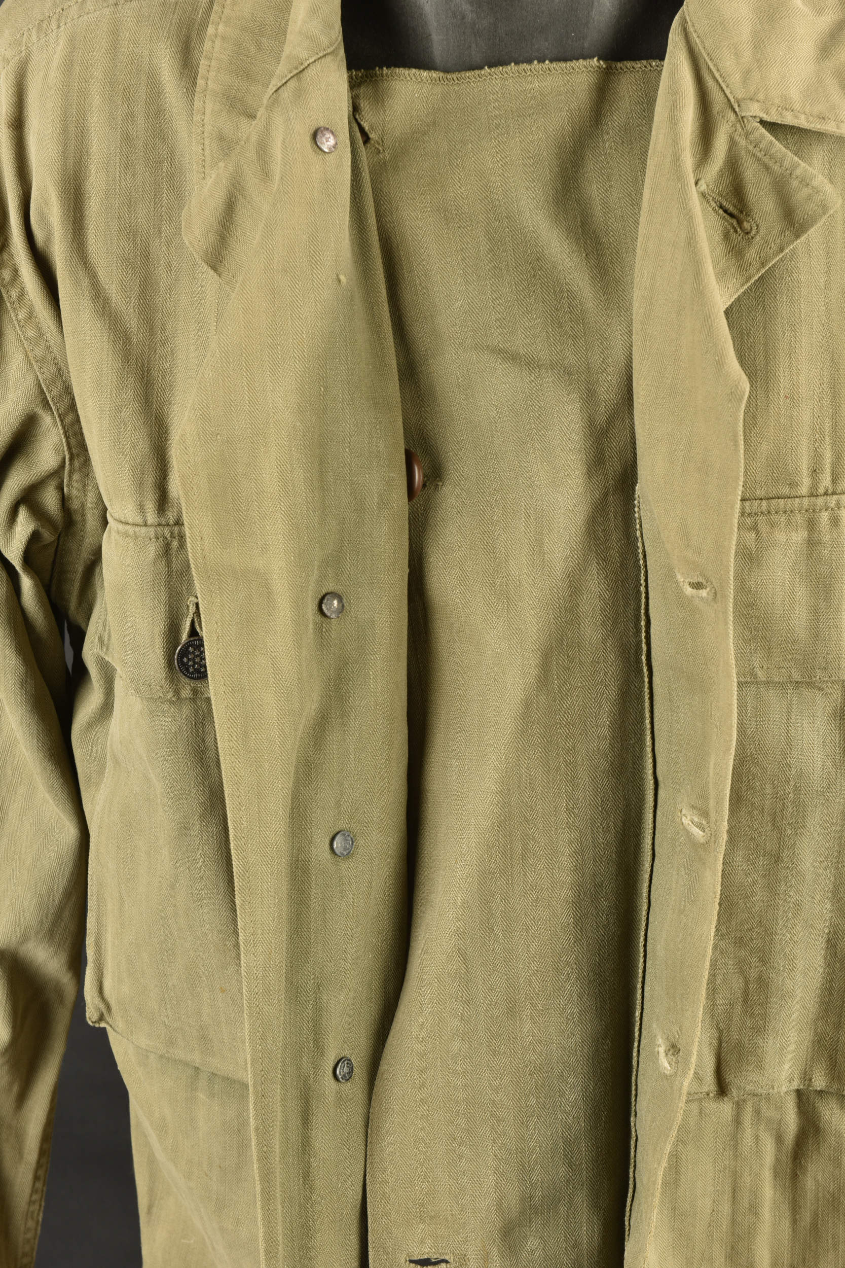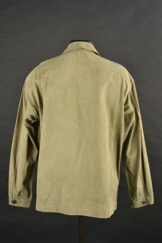Veste HBT US. En tissu coton HBT OD. Tous les boutons sont présents et estampillés de treize étoiles. Bavette anti-gaz complète. Etiquette dans le col indiquant une taille 38R. Reste de laundry number illisible. Etiquette fabricant présente, mais illisible. A noter une certaine usure et patine de la pièce, ainsi que quelques tâches et accrocs. Etat II+.