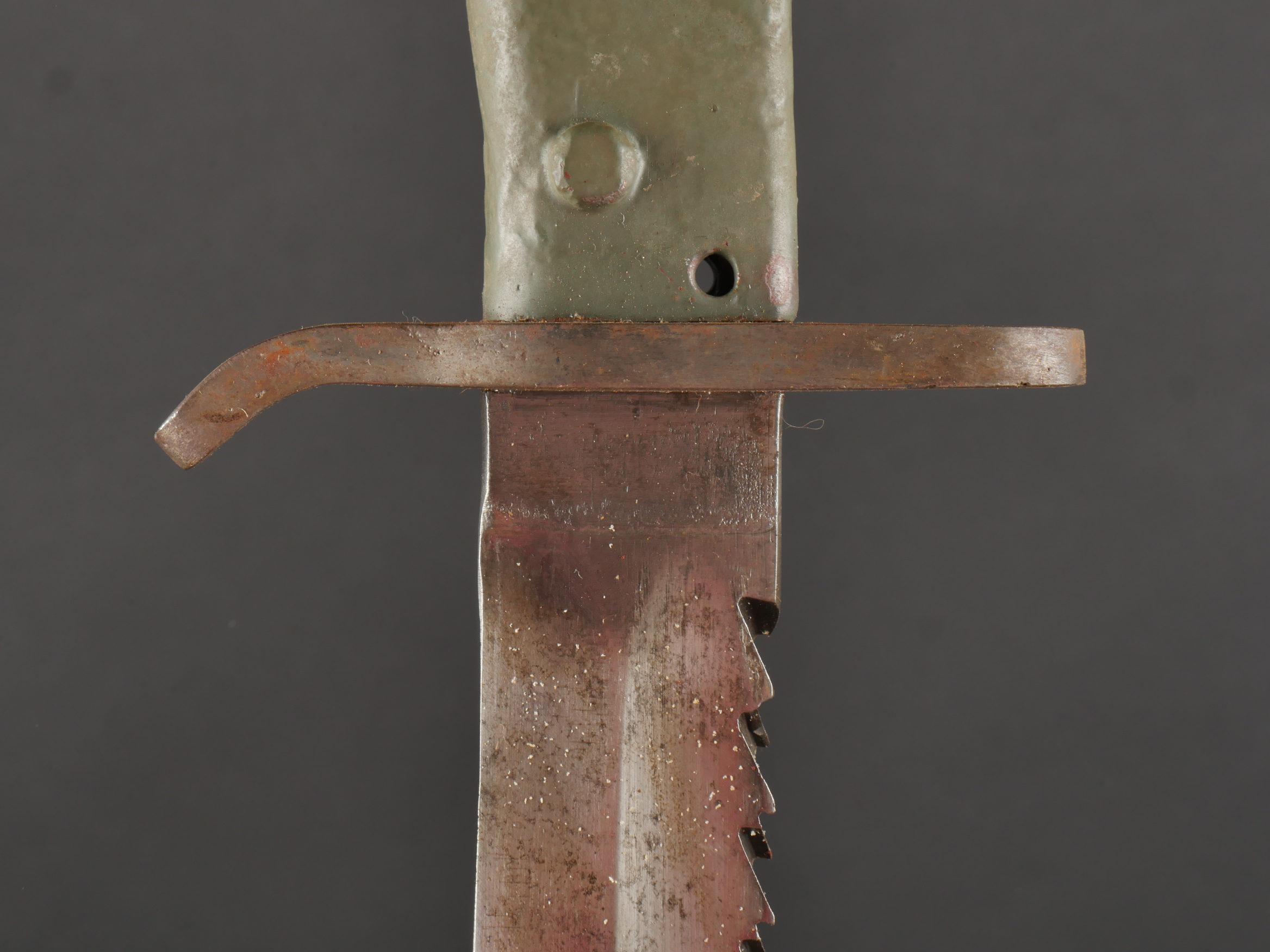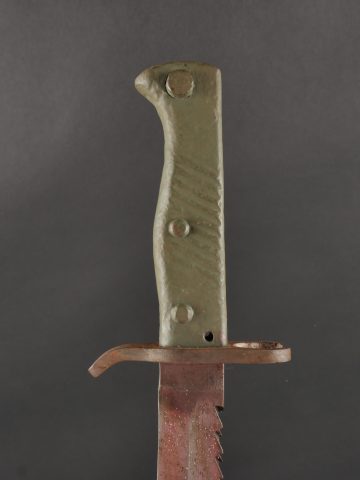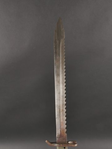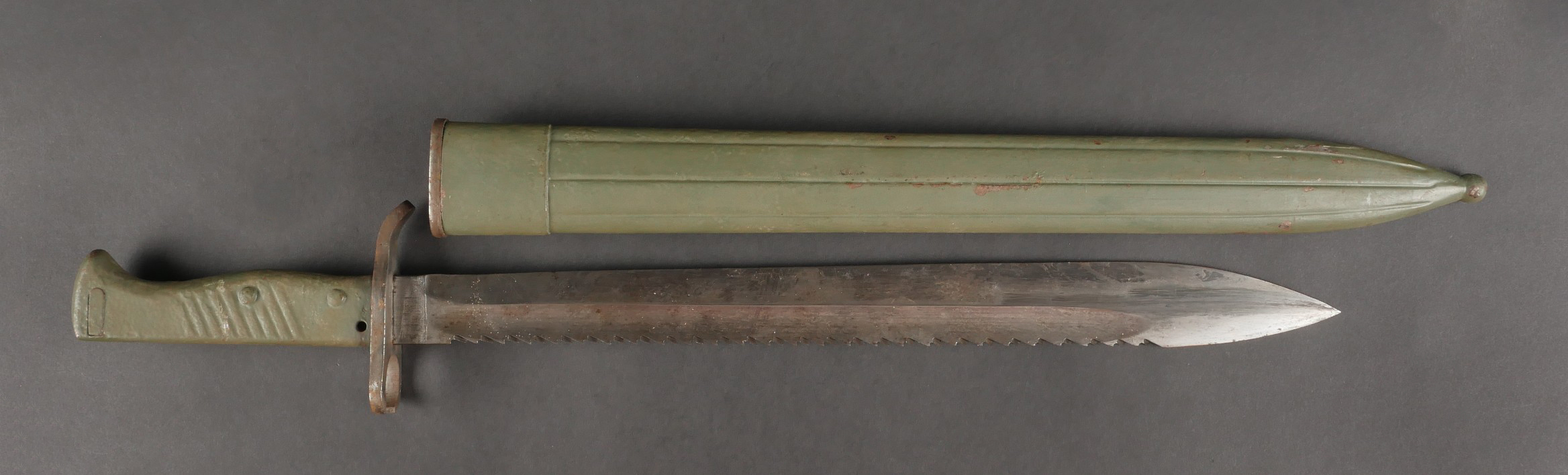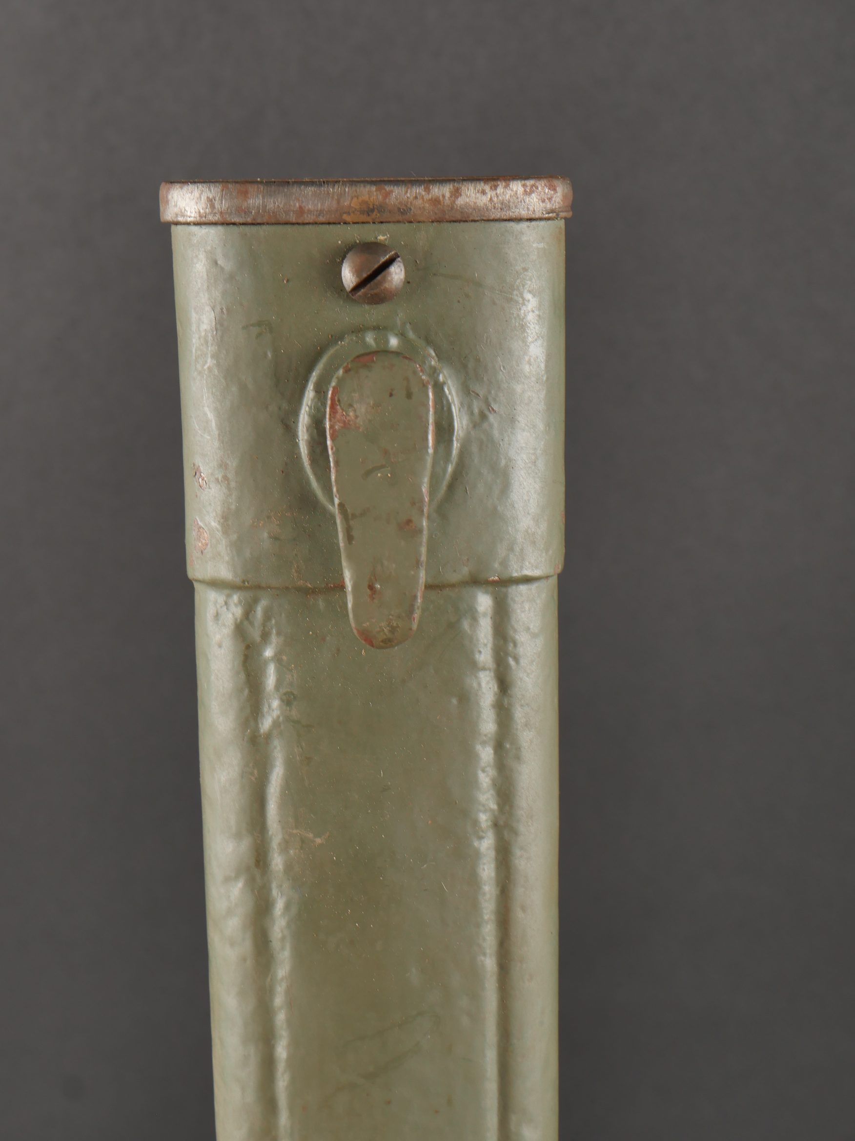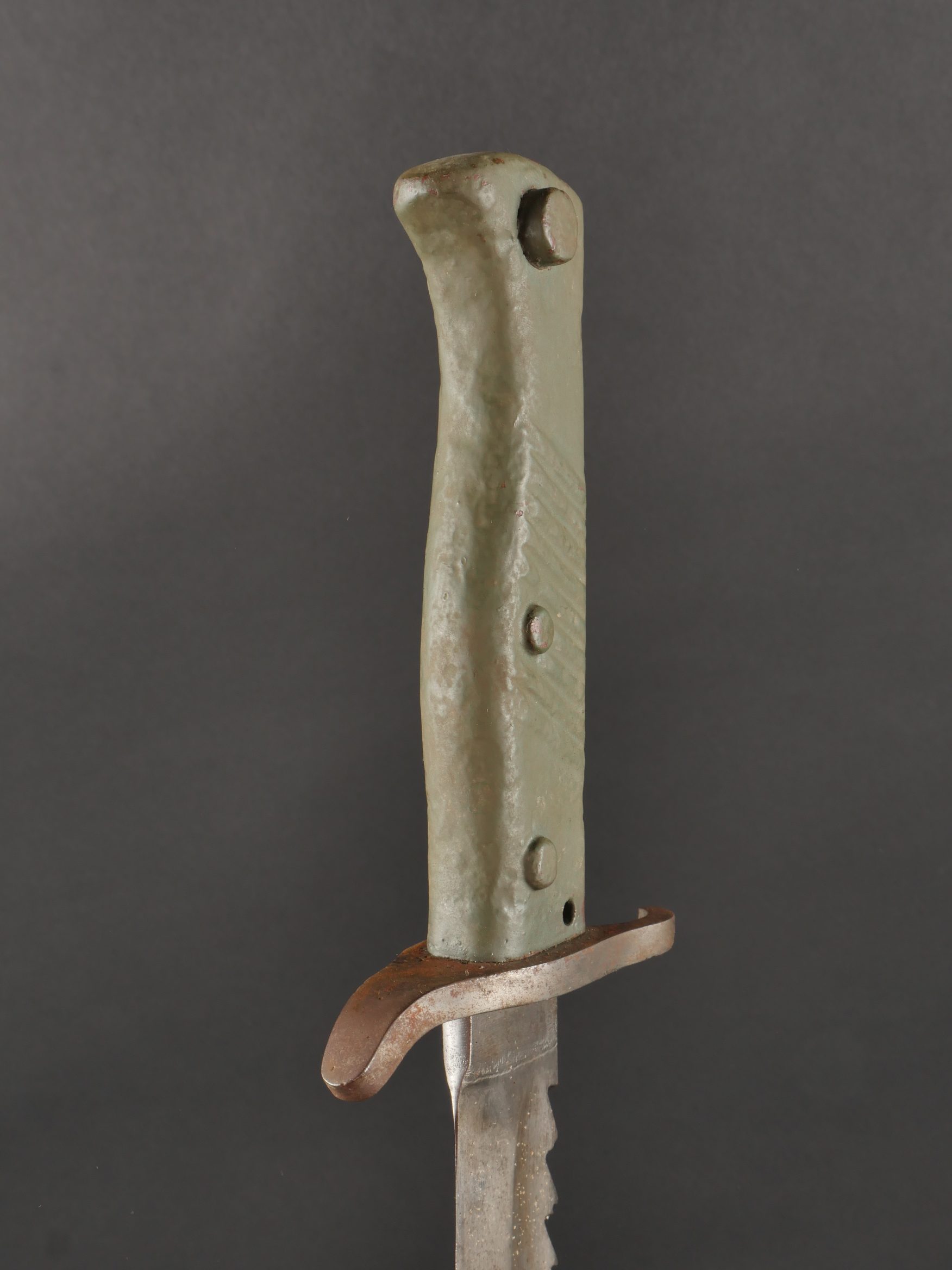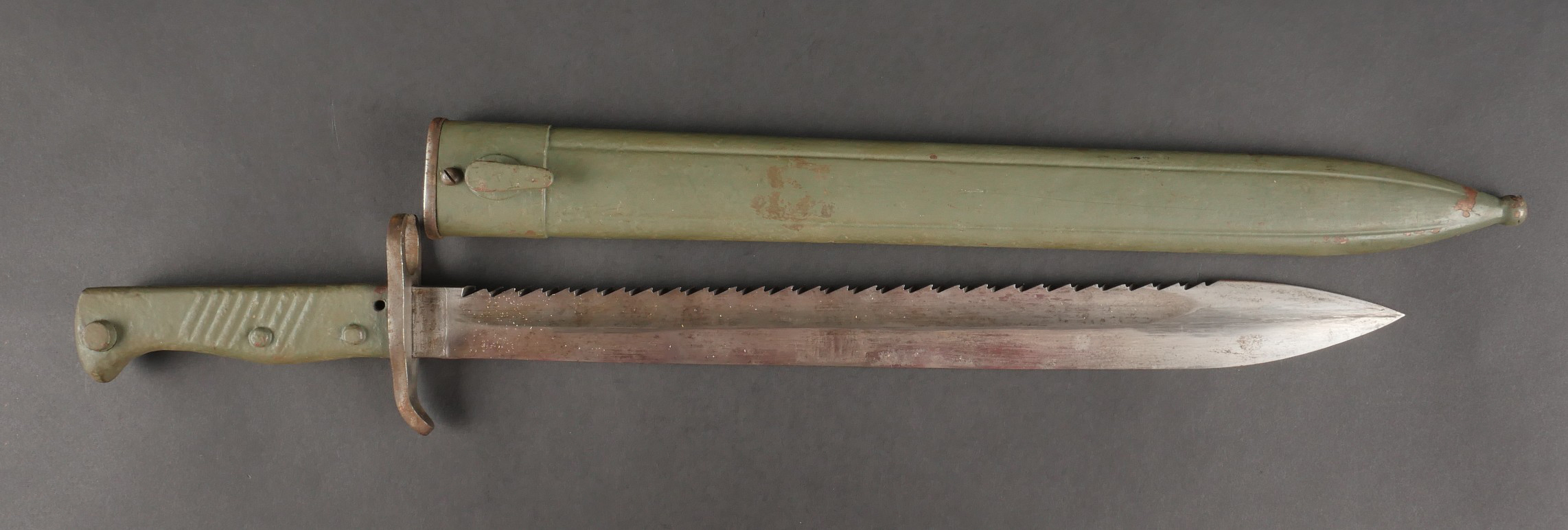 Baïonnette ersatz à dents de scie. Belle lame type 98-05 à dents de scie, poinçon de réception sur le dos de la lame. Poignée en fer moulée et striée avec quillon court et douille ouverte. Bouton poussoir fonctionnel. Bon fourreau métallique avec cuvette spécifique pour dents de scie. L’ensemble en peinture feldgrau postérieure mais ancienne et de la bonne teinte. Usure d’usage. German Ersatz Sawback Bayonet Fine sawback blade of 98/05 type with acceptance mark on spine. Cast iron handle with short quillon and open muzzle ring. Functional release button. Good steel scabbard with specific sawback throat piece. Entire set in old but appropriate field-grey paint. Signs of use.
