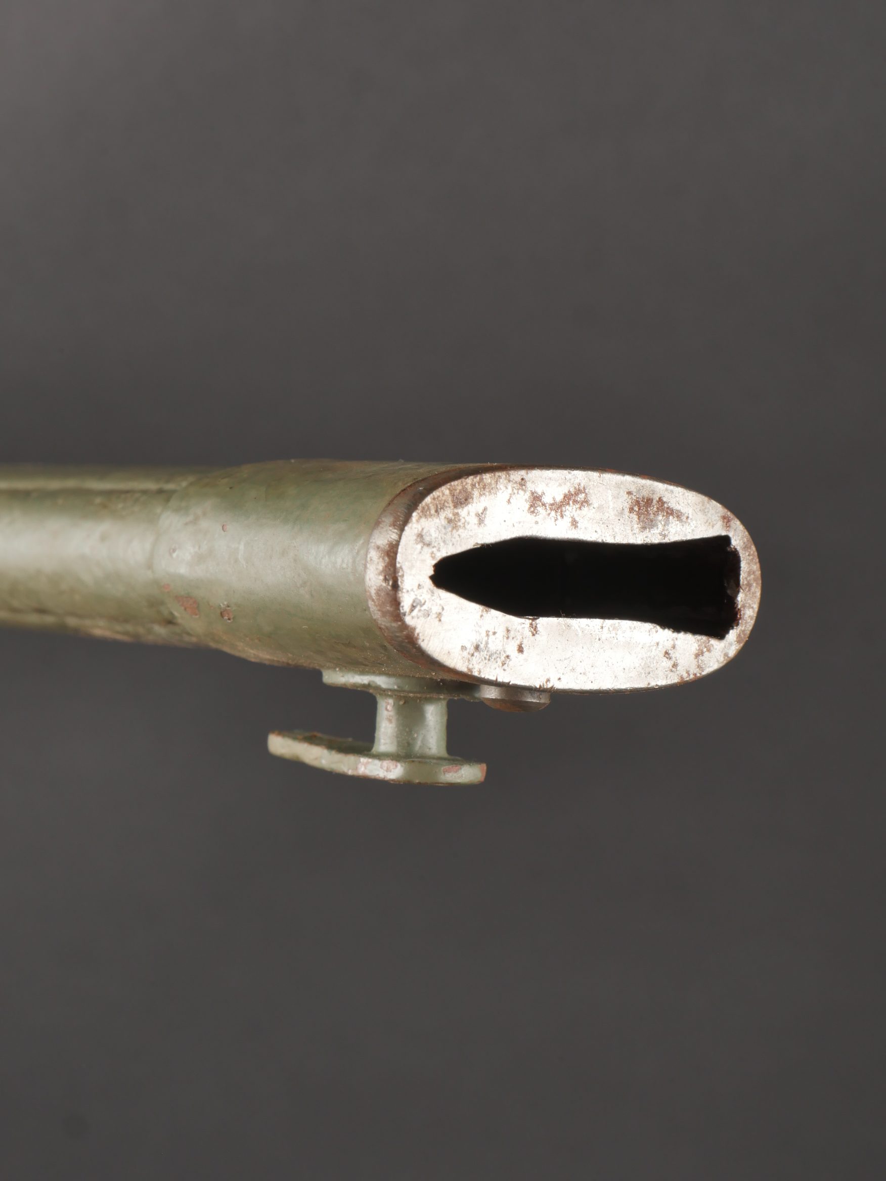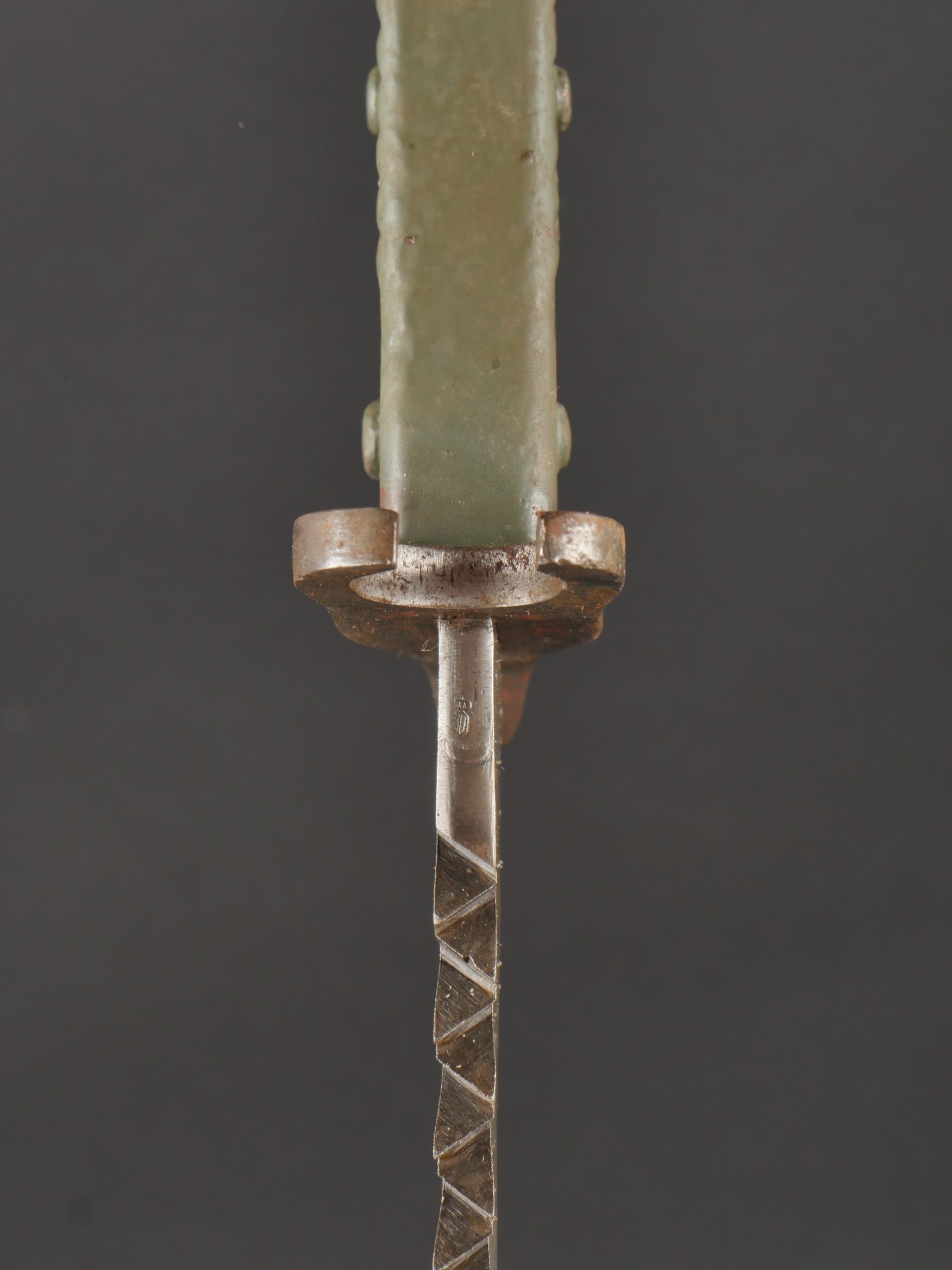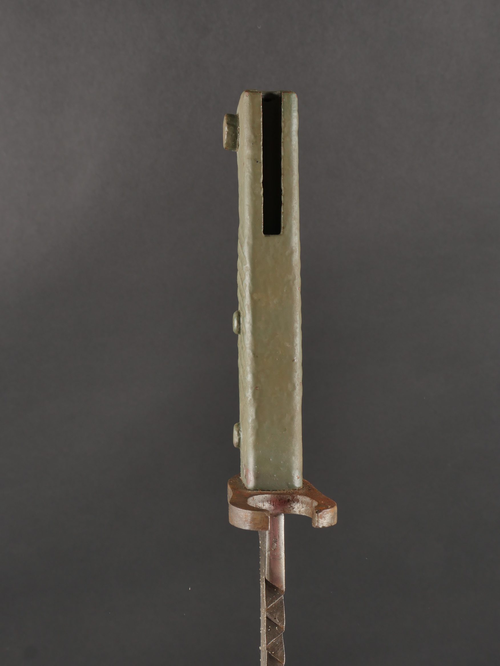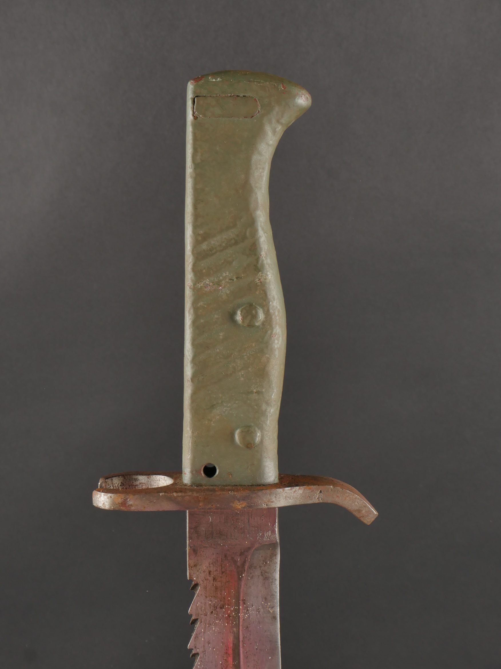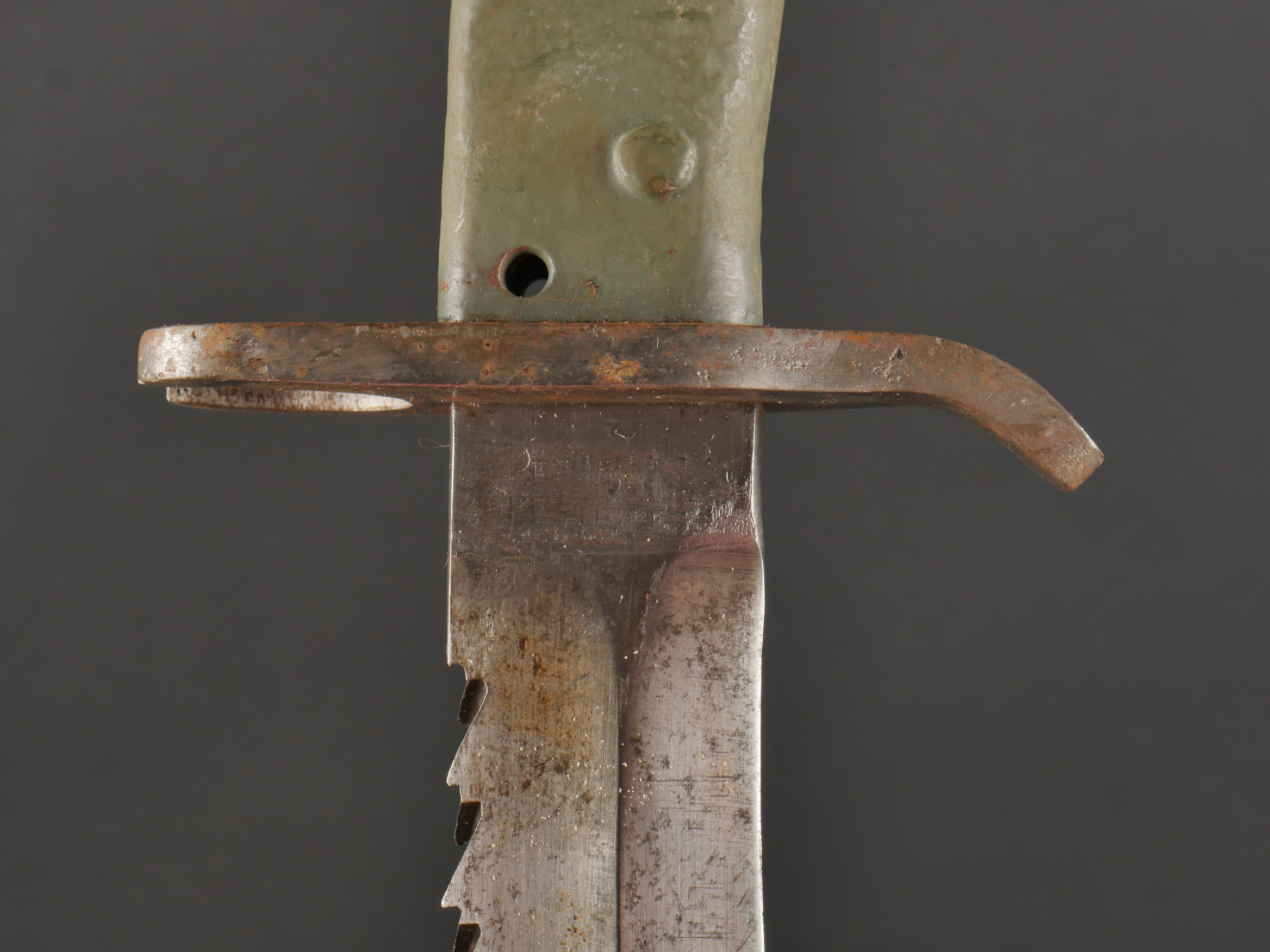 Baïonnette ersatz à dents de scie. Belle lame type 98-05 à dents de scie, poinçon de réception sur le dos de la lame. Poignée en fer moulée et striée avec quillon court et douille ouverte. Bouton poussoir fonctionnel. Bon fourreau métallique avec cuvette spécifique pour dents de scie. L’ensemble en peinture feldgrau postérieure mais ancienne et de la bonne teinte. Usure d’usage. German Ersatz Sawback Bayonet Fine sawback blade of 98/05 type with acceptance mark on spine. Cast iron handle with short quillon and open muzzle ring. Functional release button. Good steel scabbard with specific sawback throat piece. Entire set in old but appropriate field-grey paint. Signs of use.
