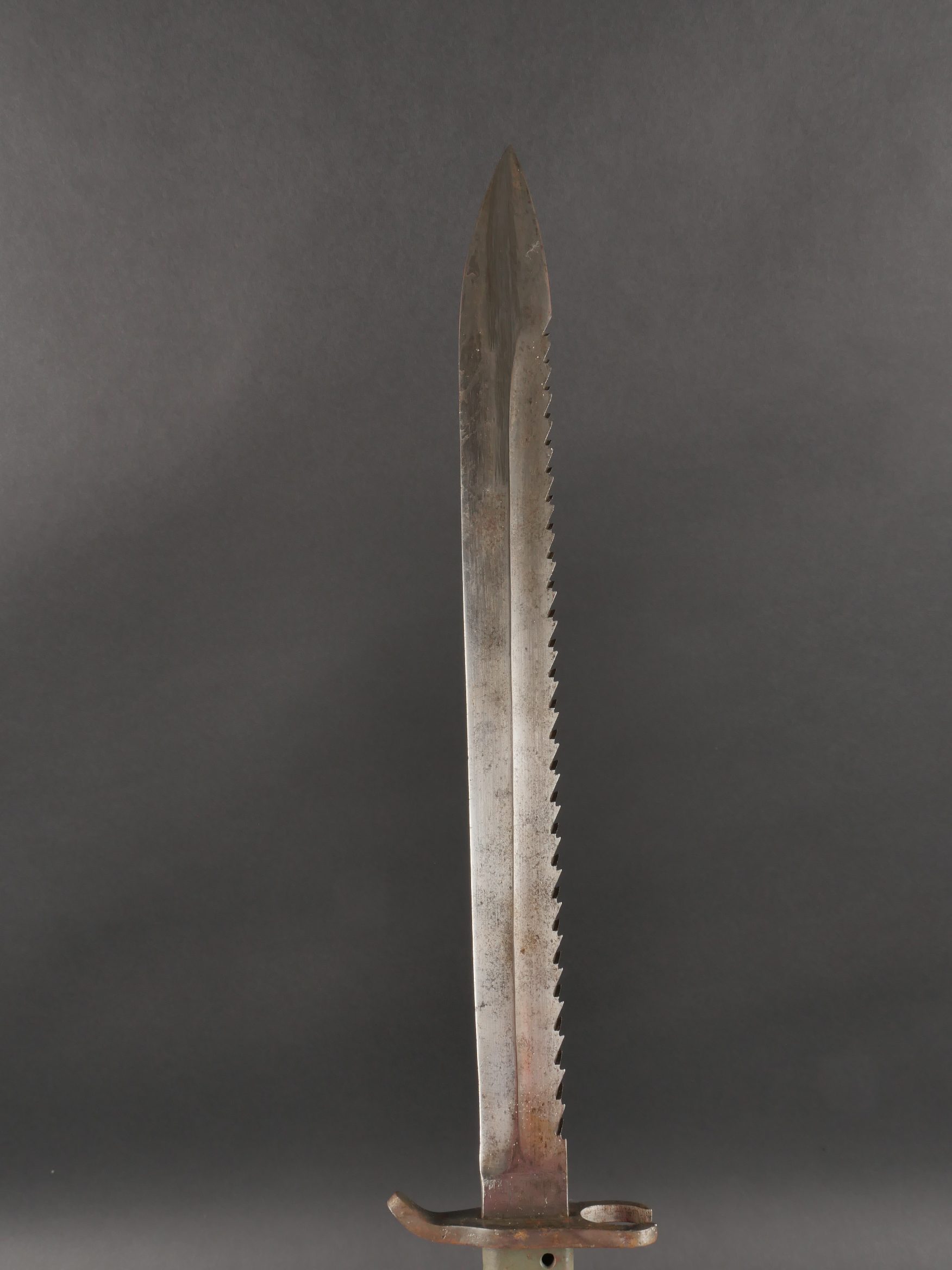 Baïonnette ersatz à dents de scie. Belle lame type 98-05 à dents de scie, poinçon de réception sur le dos de la lame. Poignée en fer moulée et striée avec quillon court et douille ouverte.... en savoir plus