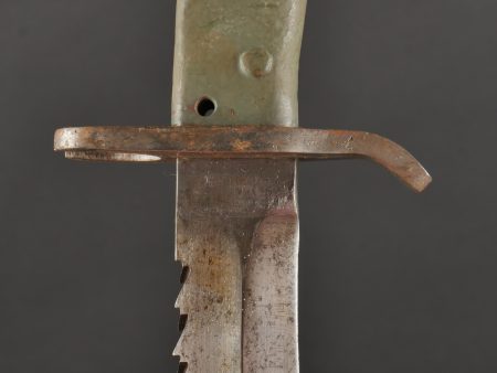 Détails de la vente >Baïonnette ersatz à dents de scie. Belle lame type 98-05 à dents de scie, poinçon de réception sur le dos de la lame. Poignée en fer moulée et striée avec quillon court et douille ouverte.... en savoir plus