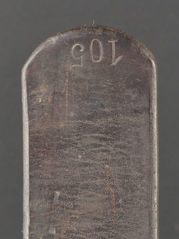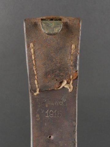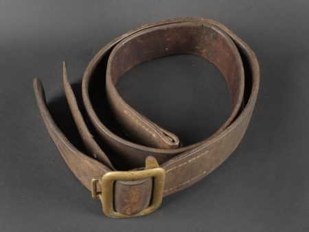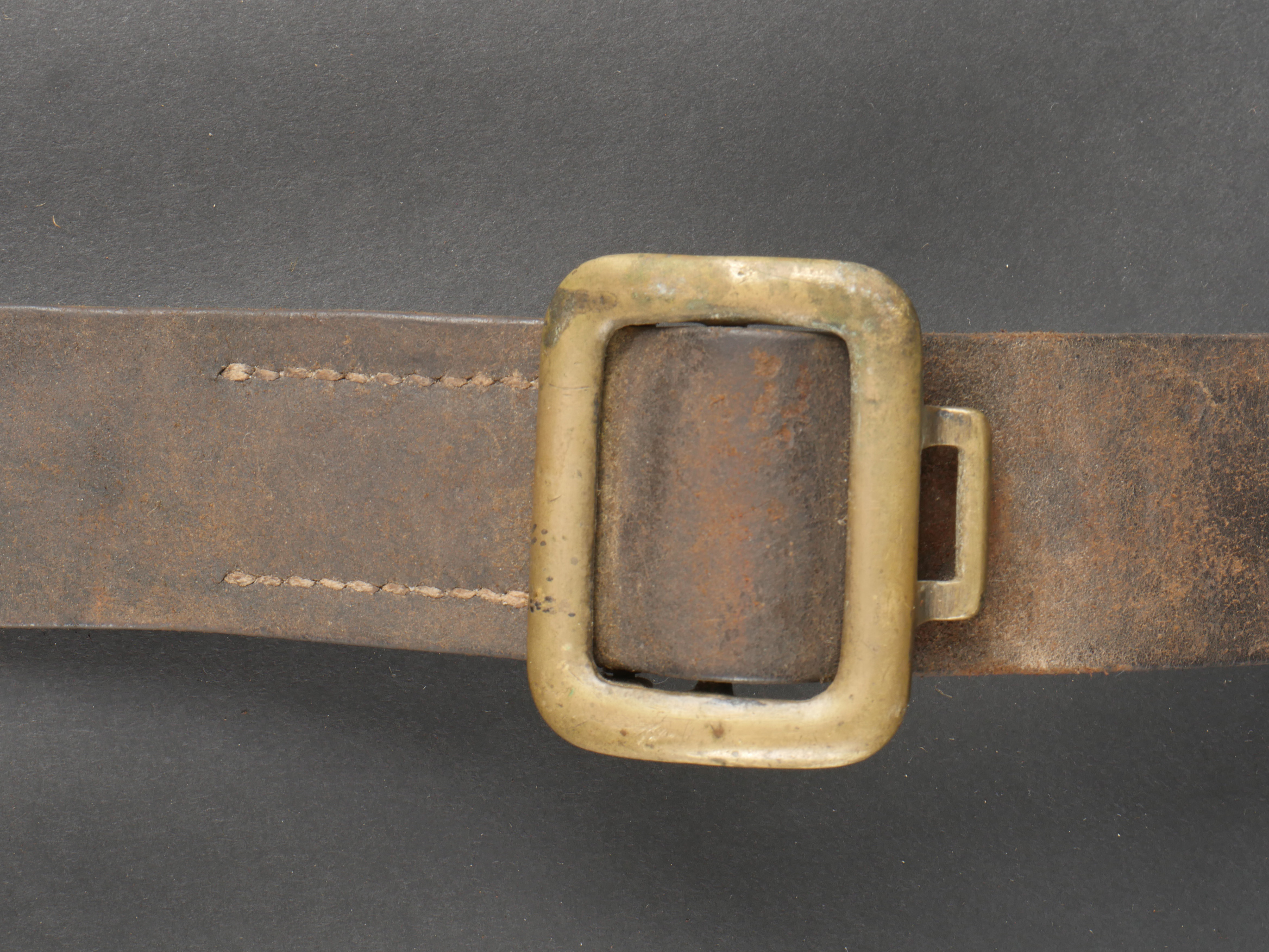 Ceinturon allemand pour troupes montées. En cuir fonçé, avec boucle pécifique troupe montée et son crochet à l’intérieur du cuir comme il se doit. Taille 105. Marquage d’un fabricant de Hannovre, daté 1915. Sur le côté gauche, traces de couture d’une bélière porte sabre, pratique souvent constatée, bélière retirée. Porté, patine. German Belt for Mounted TroopsDark leather belt fitted with the specific mounted-troop buckle, with the hook attached inside the leather as prescribed. Length 105 cm. Maker’s mark from Hannover, dated 1915. Stitching marks on the left side indicate a removed saber hanger, a common field modification. Worn, with attractive patina.