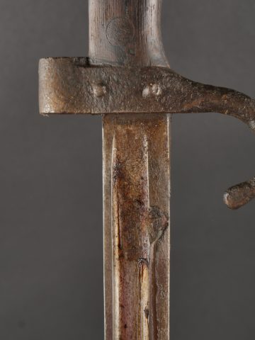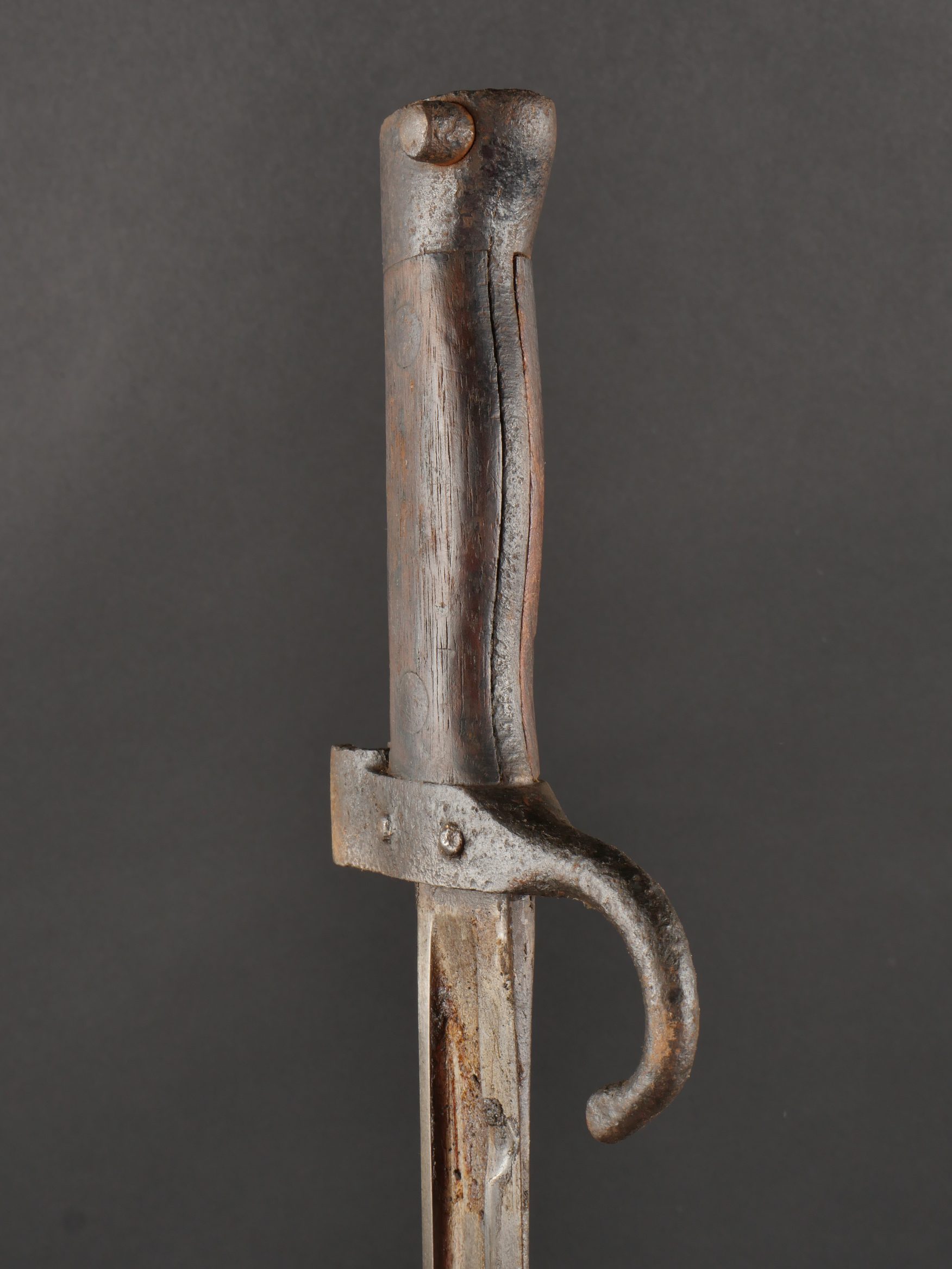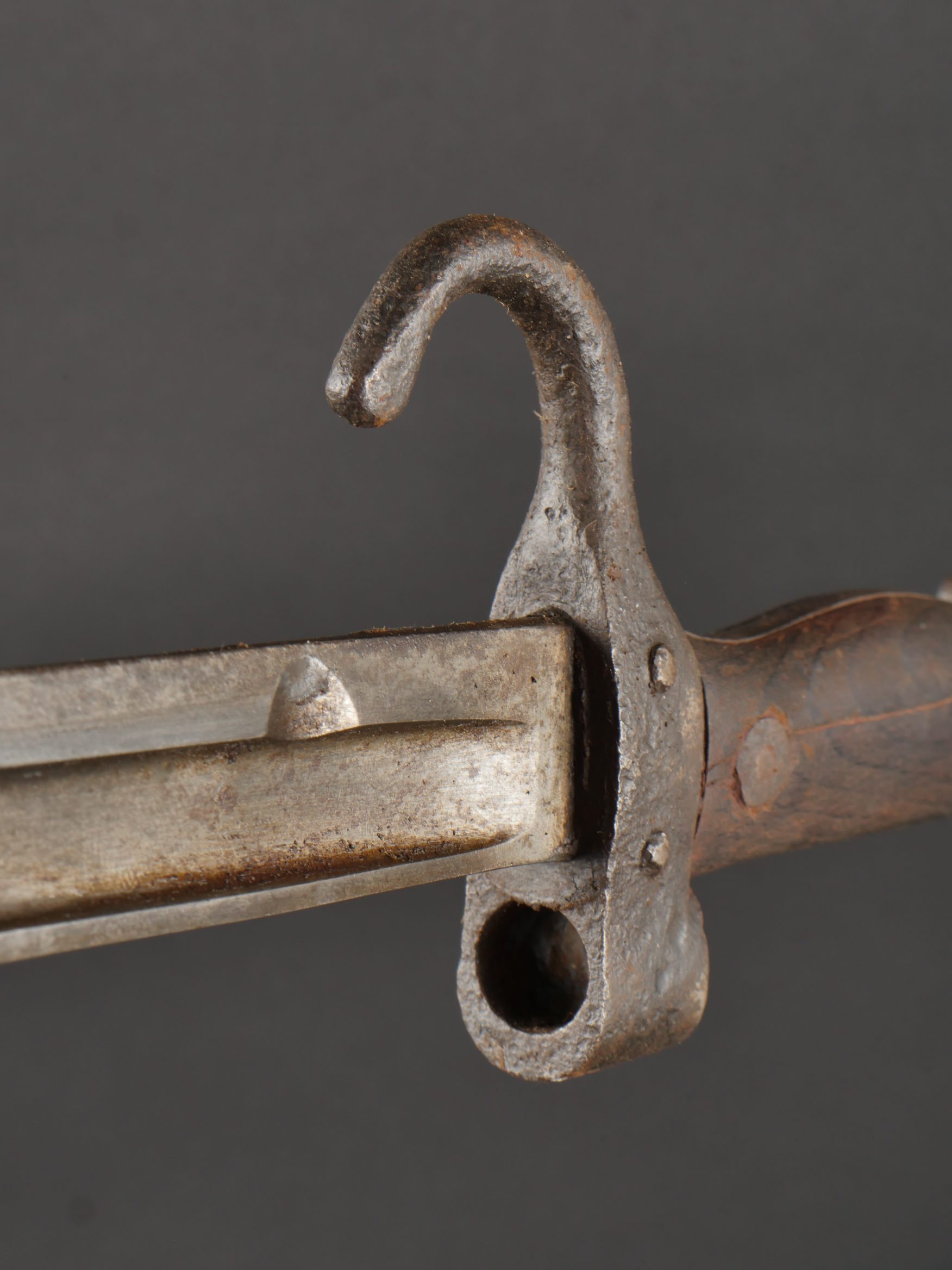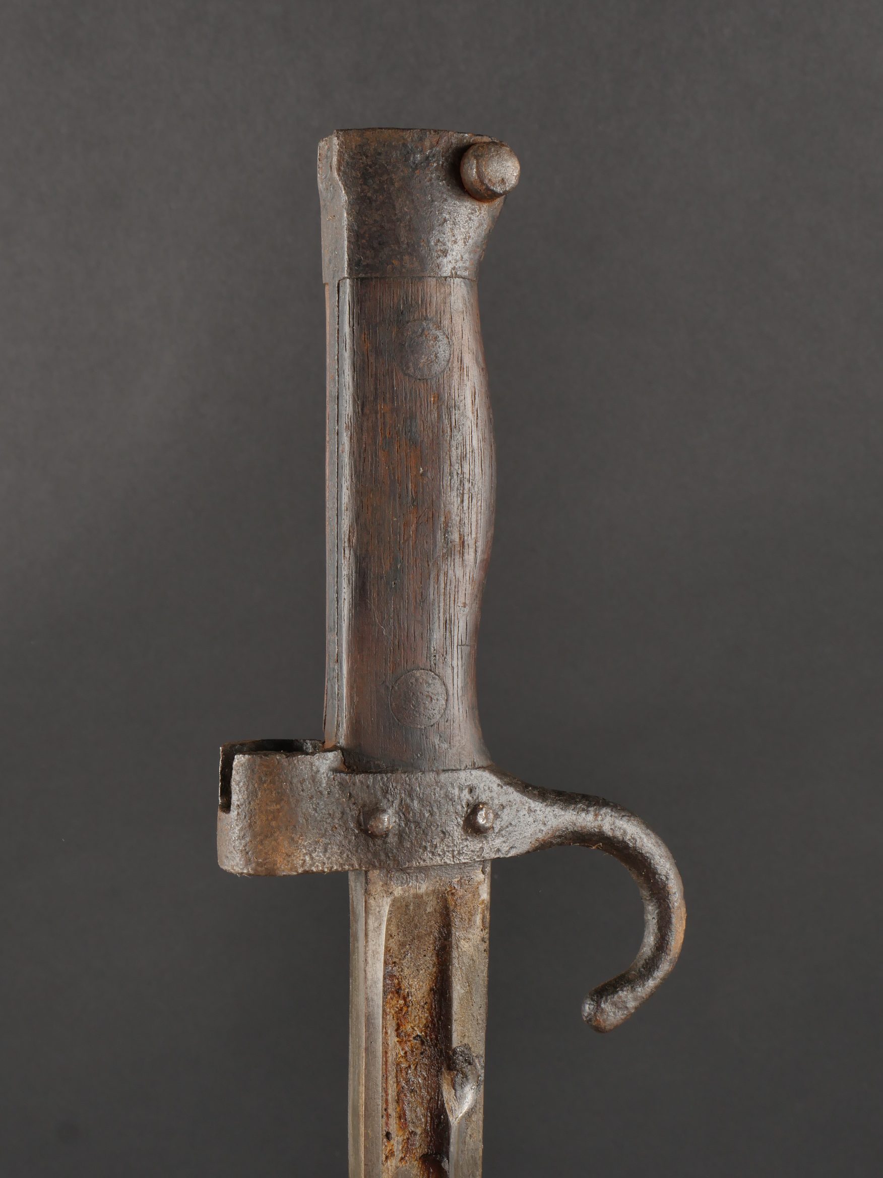 Baïonnette 1892 Berthier. Epée baïonnette 1892 à quillon. Lame à dos plat, plaquettes bois, l’une fendue mais pas cassée, poussoir fonctionnel. Fourreau fer avec traces d’oxydation. Les numéros de série ne sont pas lisibles. Model 1892 Berthier Bayonet Flat-backed blade, wooden grips—one split but intact, functional release button. Iron scabbard with oxidation marks. Serial numbers illegible.