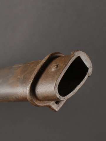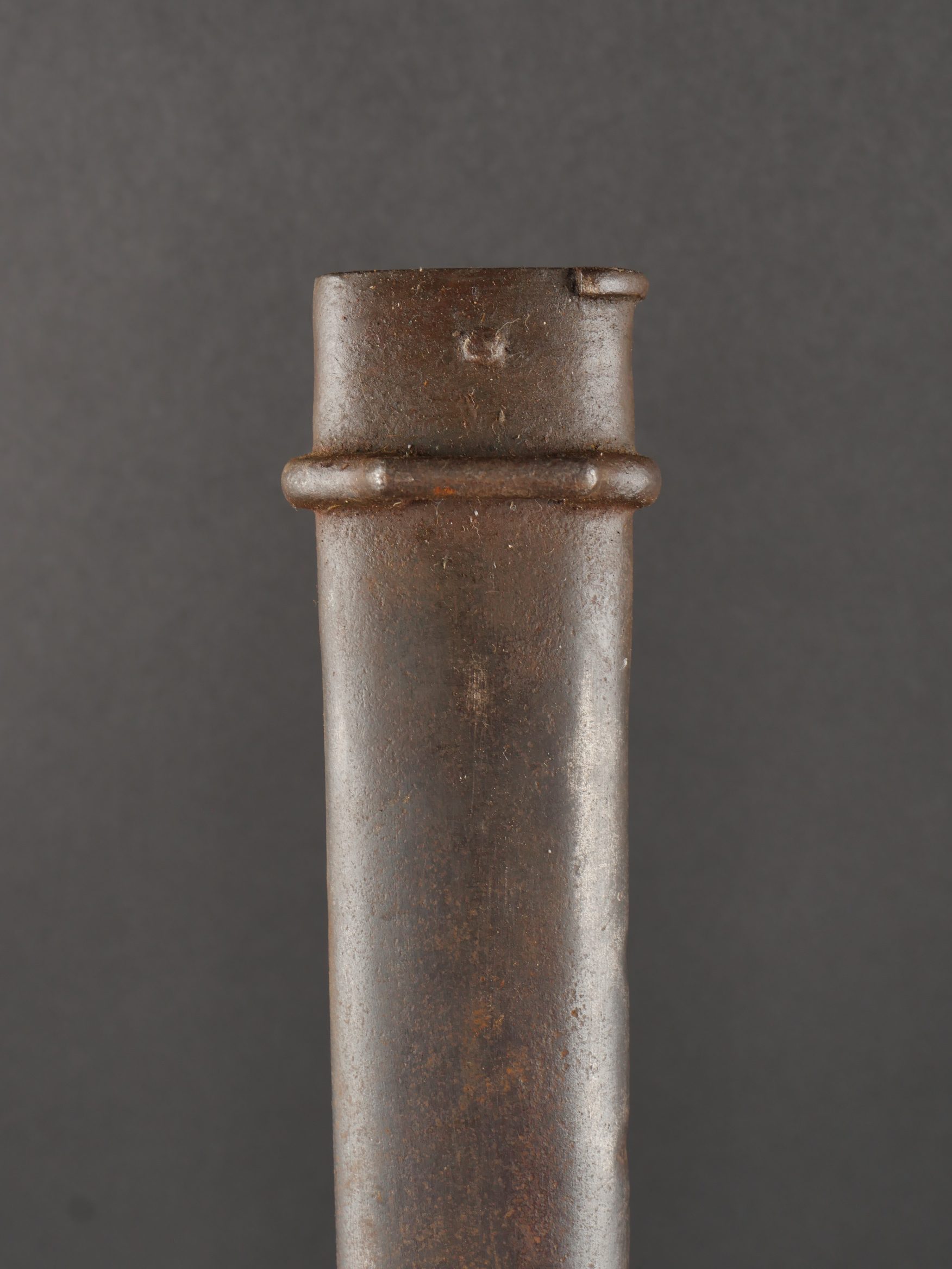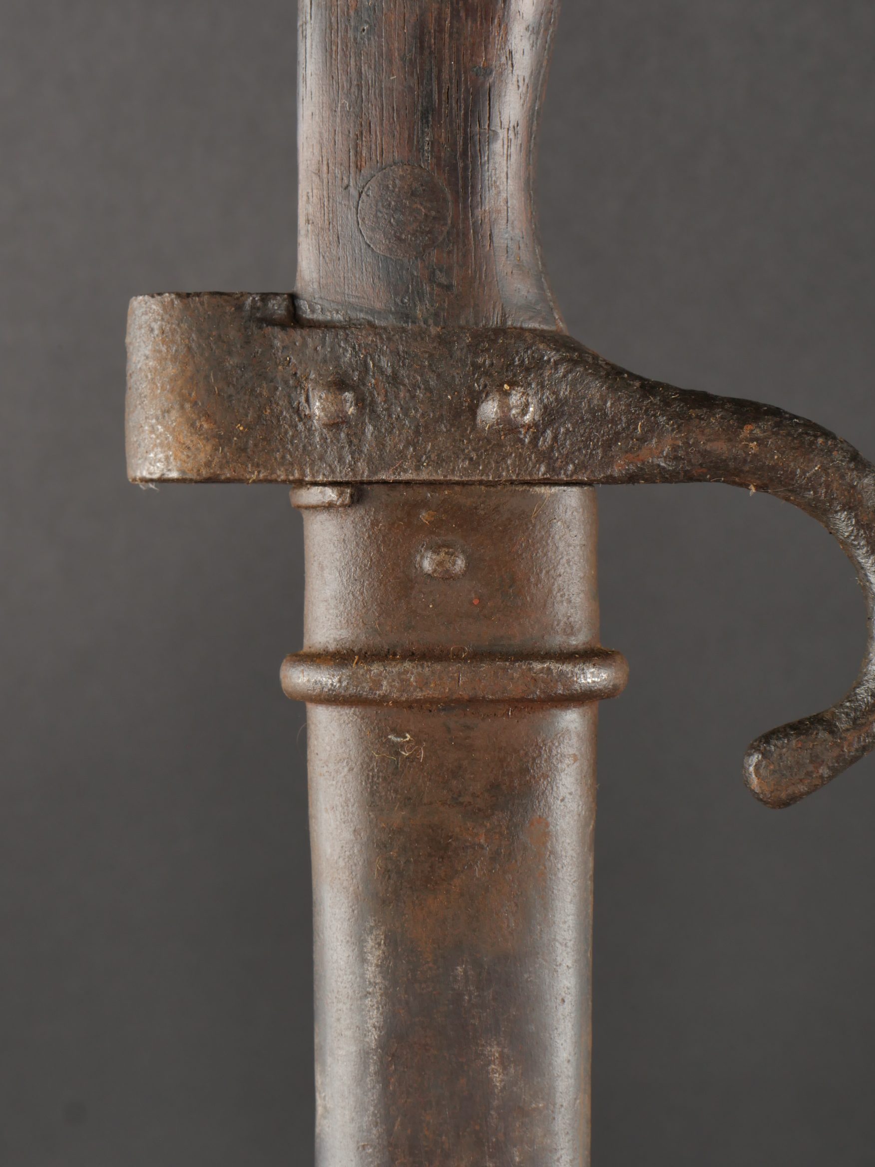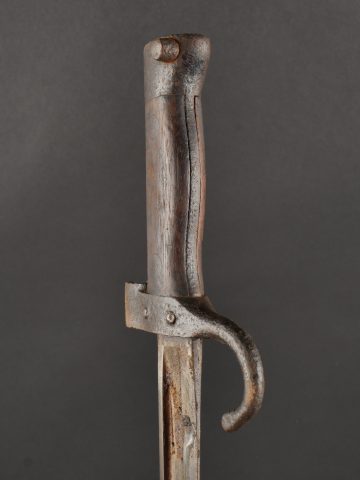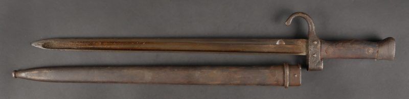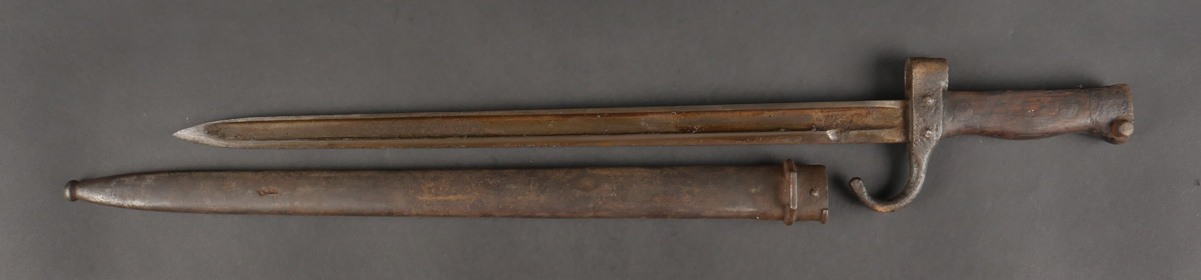 Baïonnette 1892 Berthier. Epée baïonnette 1892 à quillon. Lame à dos plat, plaquettes bois, l’une fendue mais pas cassée, poussoir fonctionnel. Fourreau fer avec traces d’oxydation. Les numéros de série ne sont pas lisibles. Model 1892 Berthier Bayonet Flat-backed blade, wooden grips—one split but intact, functional release button. Iron scabbard with oxidation marks. Serial numbers illegible.