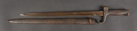 Détails de la vente >Baïonnette 1892 Berthier. Epée baïonnette 1892 à quillon. Lame à dos plat, plaquettes bois, l’une fendue mais pas cassée, poussoir fonctionnel. Fourreau fer avec traces... en savoir plus