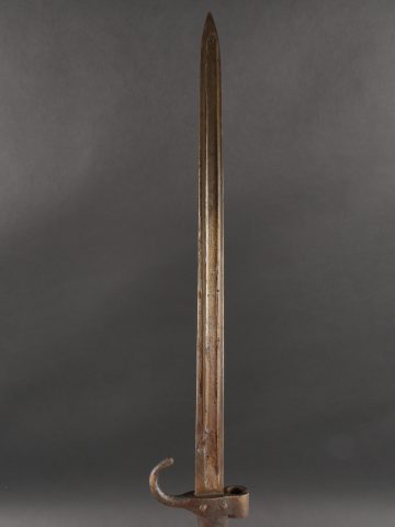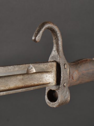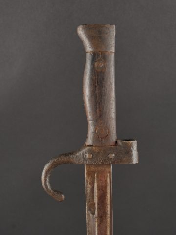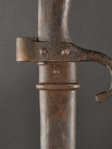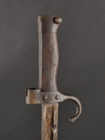 Baïonnette 1892 Berthier. Epée baïonnette 1892 à quillon. Lame à dos plat, plaquettes bois, l’une fendue mais pas cassée, poussoir fonctionnel. Fourreau fer avec traces... en savoir plus