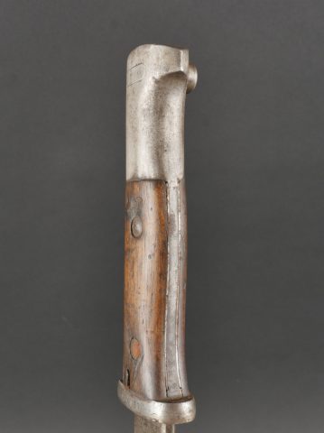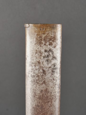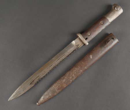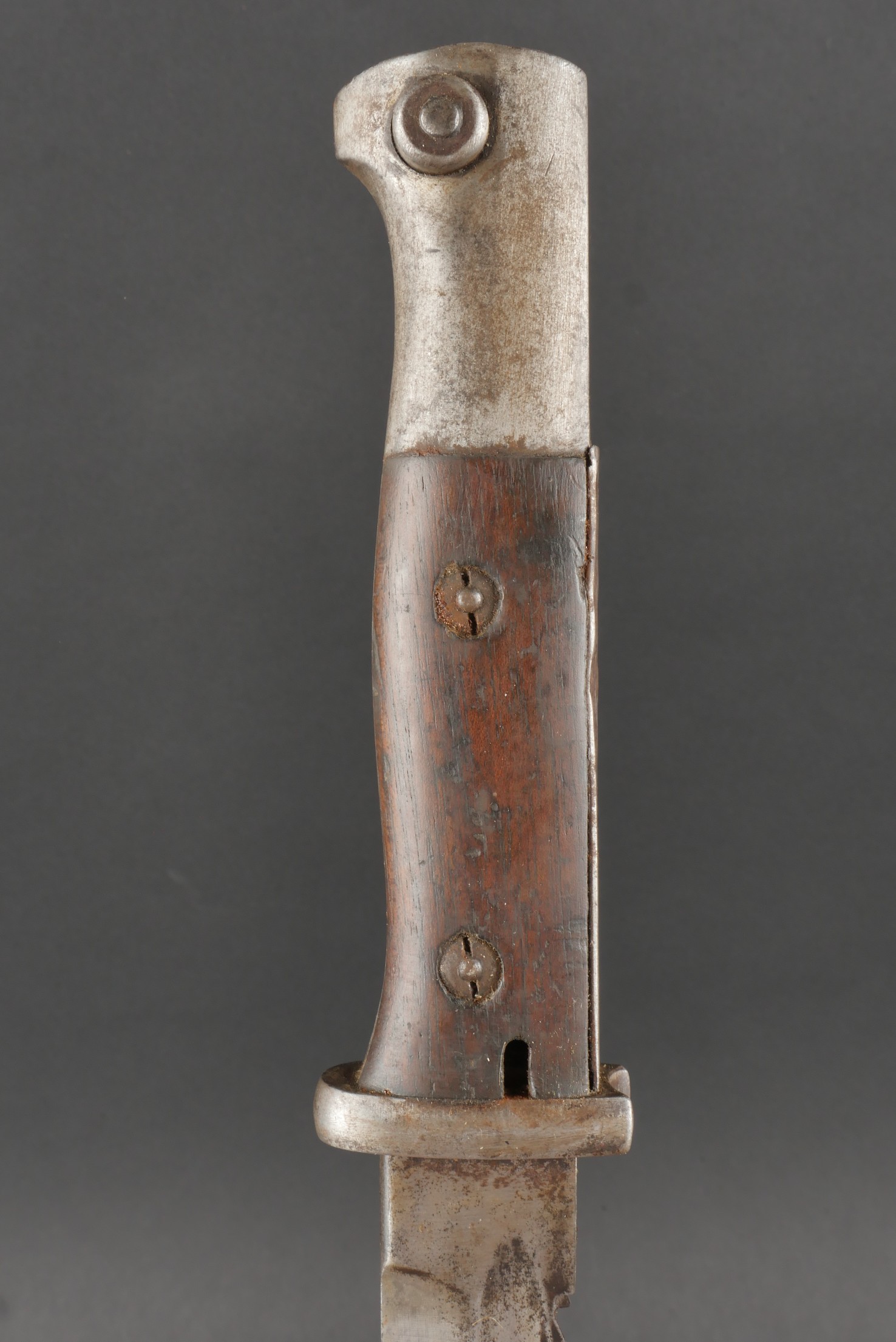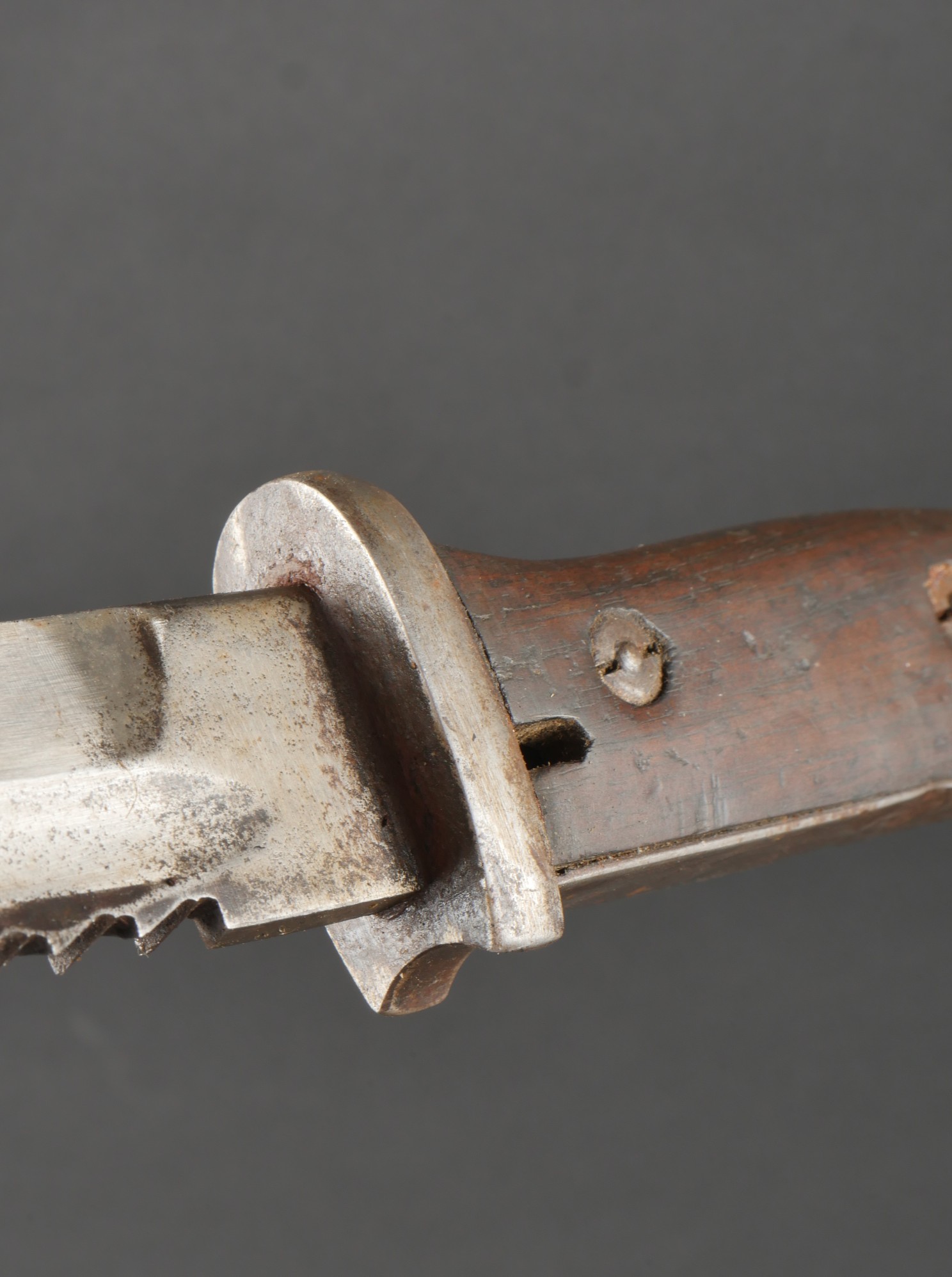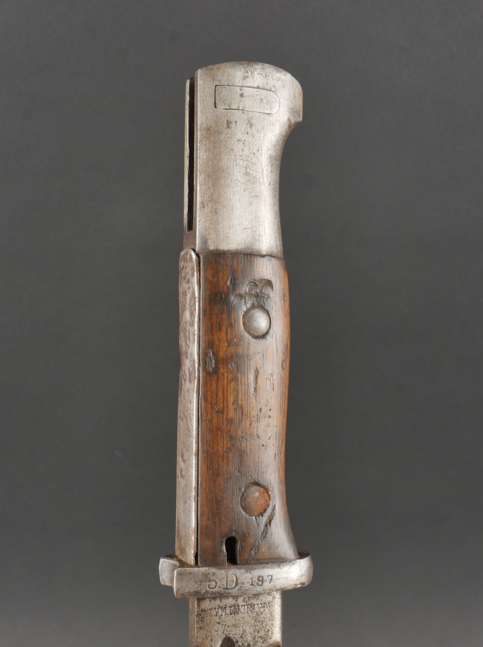 Baïonnette allemande 84-98 2nd type à dents de scie régimentée. Baïonnette 2nd type avec pare flamme, lame à gouttières arrondies du fabricant GEBR HELLER MARIENTHAL et datée 1916 avec dents de scie. Usure. Plaquettes en bois, lisses, bouton poussoir fonctionnel. Croisière marquée 5.D.197, très probablement pour 5e régiment de Dragons. Fourreau fer avec chiffre 47 frappé au dos près de la cuvette. Oxydation superficielle. German 84/98 Second Type Sawback Bayonet (Regimental Marked) Second-type bayonet with flashguard and rounded fullers, made by “Gebr. Heller, Marienthal,” dated 1916. Sawback blade, wooden grips, functional press stud. Crossguard marked “5.D.197,” likely for 5th Dragoon Regiment. Iron scabbard stamped “47” near the throat. Light oxidation.