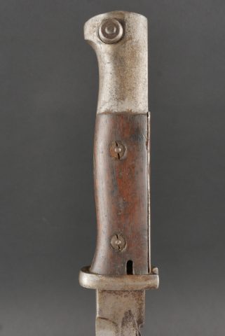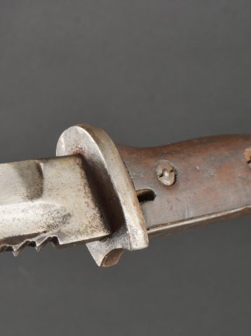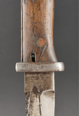 Détails de la vente >Baïonnette allemande 84-98 2nd type à dents de scie régimentée. Baïonnette 2nd type avec pare flamme, lame à gouttières arrondies du fabricant GEBR HELLER MARIENTHAL et datée 1916 avec... en savoir plus
