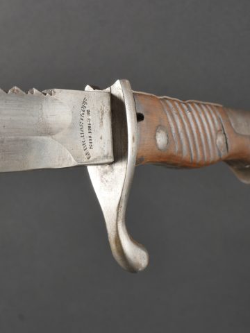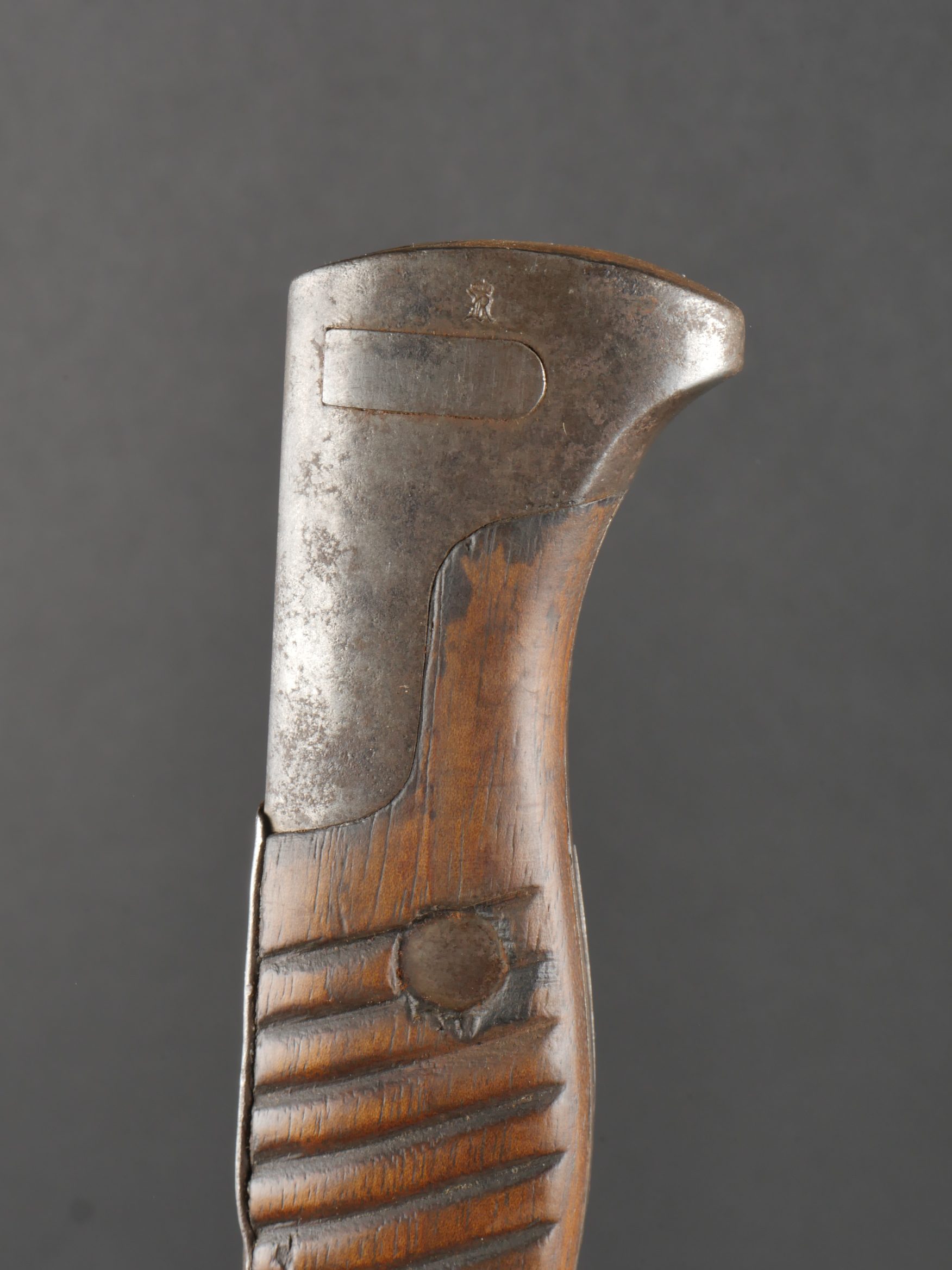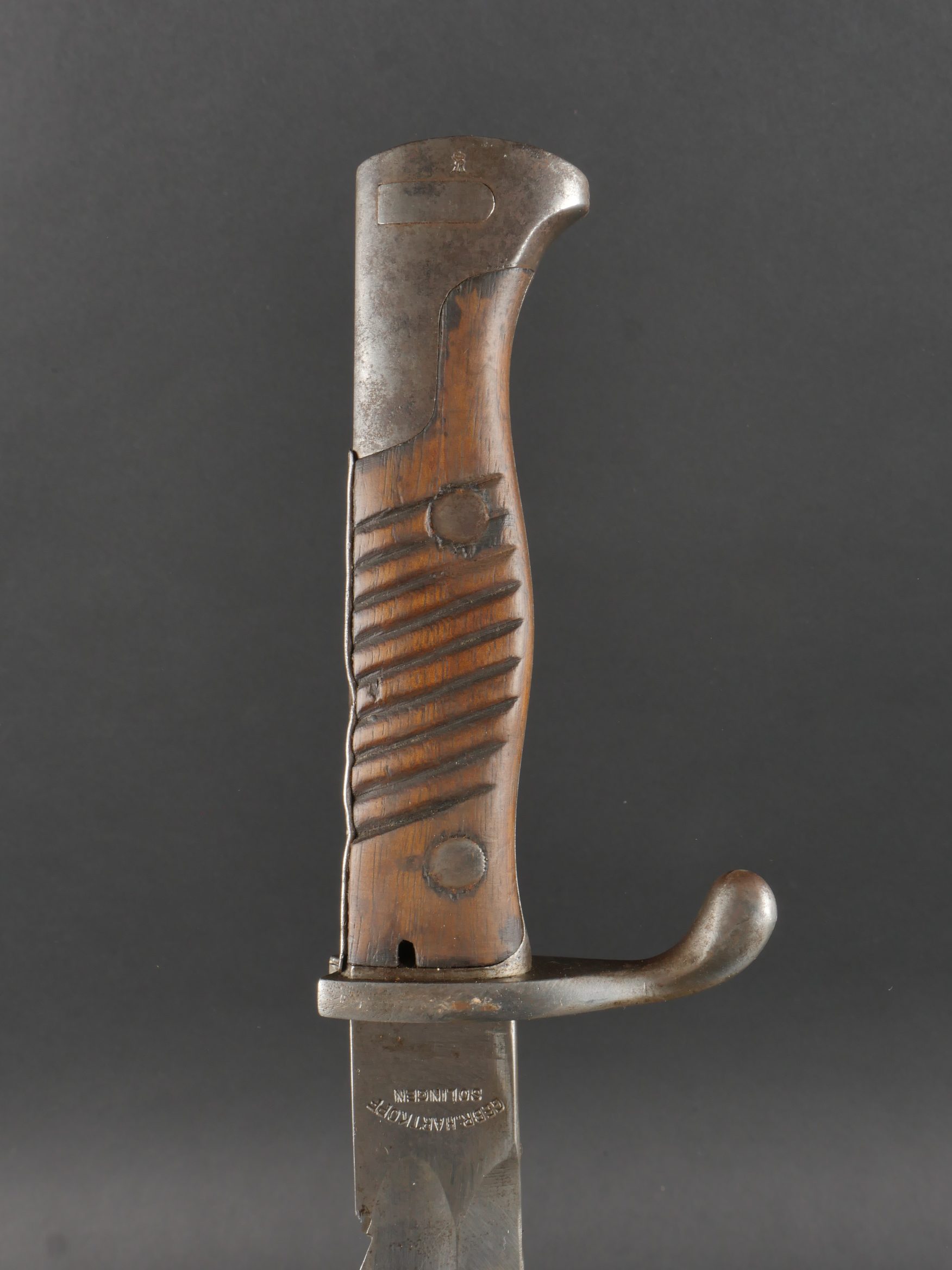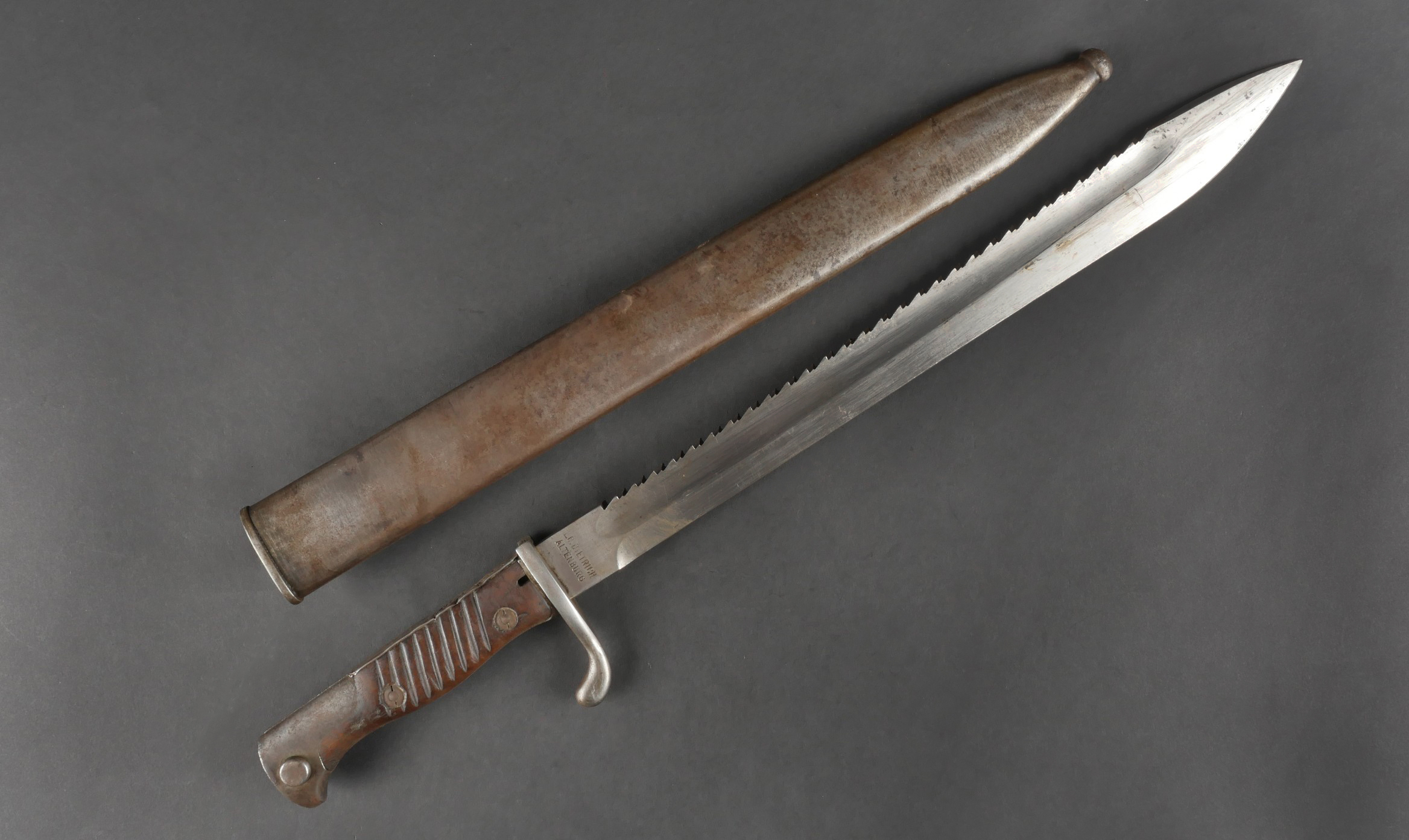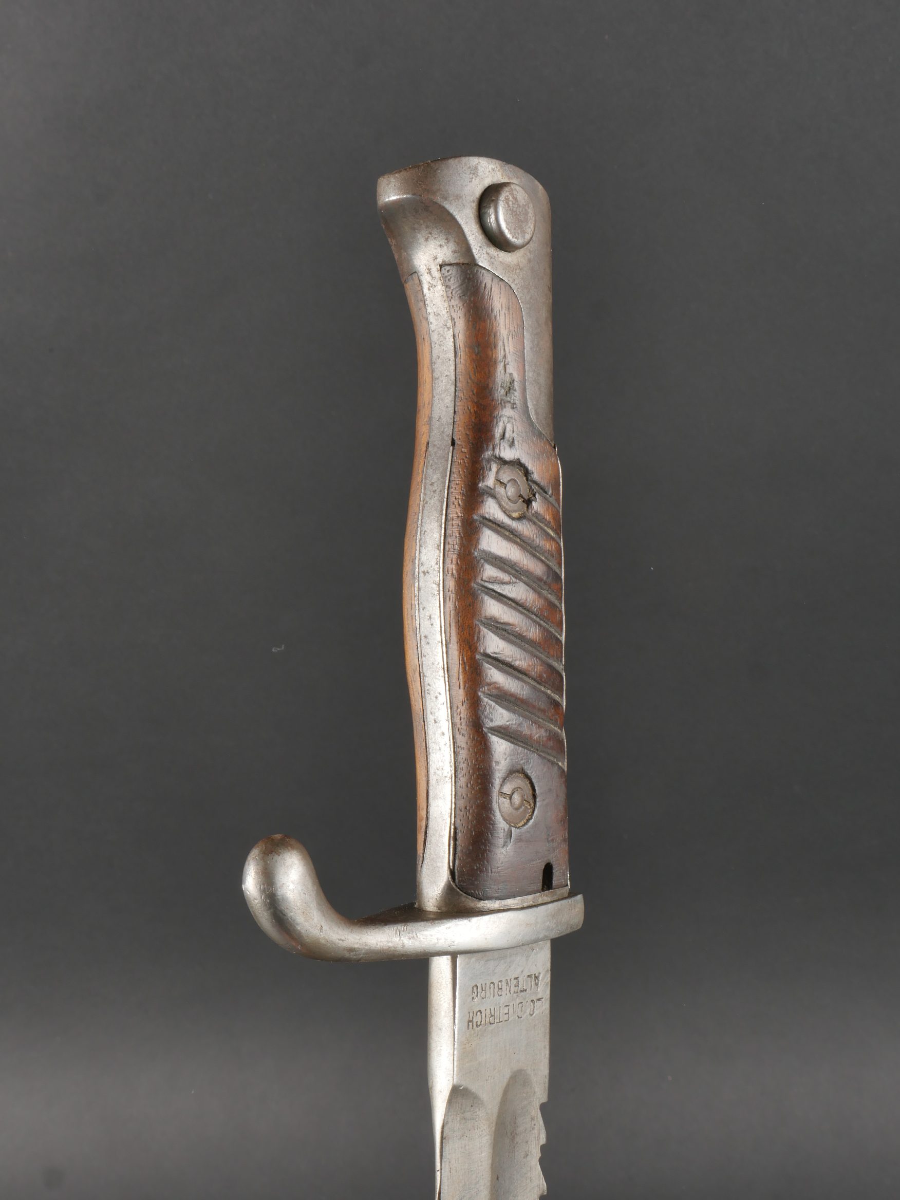 Baïonnette allemande 98-05 à dents de scie. Belle lame à dents de scie, avec double marquage, d’un côté LO DIETRCIH ALTENBURG, de l’autre GEBR. HARTKOPF SOLINGEN. Poinçon de réception sur le dos de la lame. Plaquettes bois striées. Pare flamme avec de nombreux coups. Bouton poussoir fonctionnel. Joli fourreau spécifique dents de scies, bel aspect, quelques coups. German 98/05 Sawback Bayonet Fine sawback blade with dual manufacturer markings, “LO DIETRICH ALTENBURG” on one side and “GEBR. HARTKOPF SOLINGEN” on the other. Inspection stamp on the spine. Grooved wooden grips, flashguard with impact marks, functional release button. Specific sawback scabbard in good condition, minor dents.