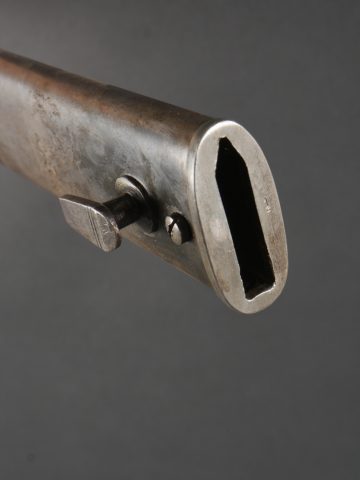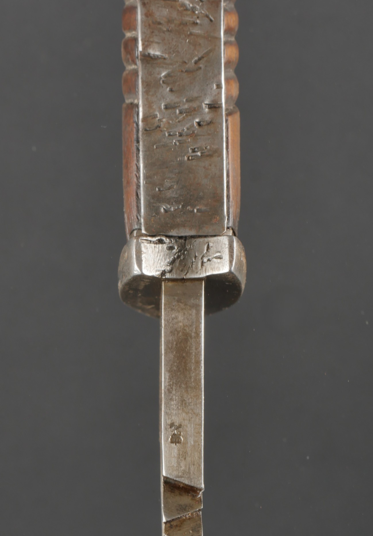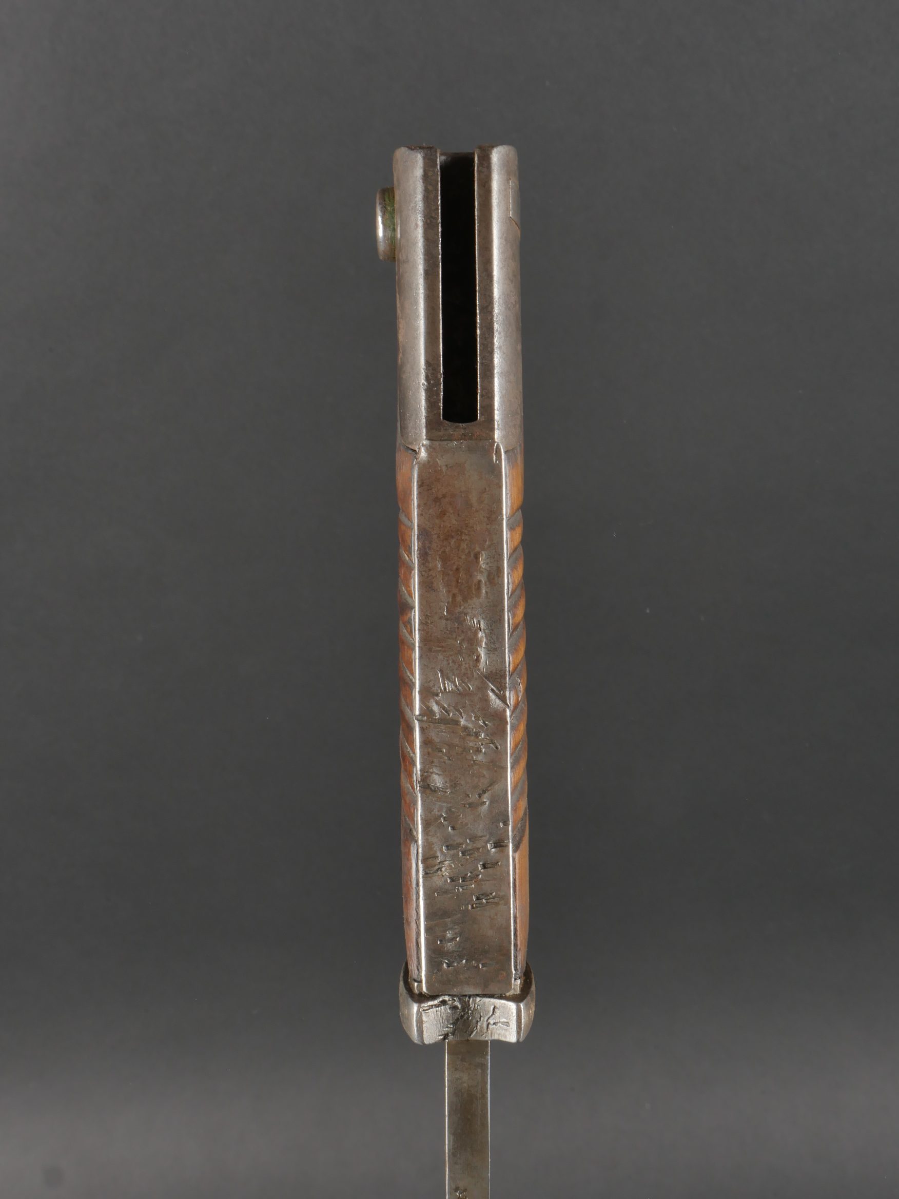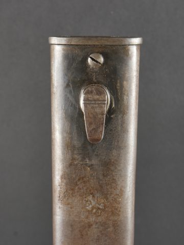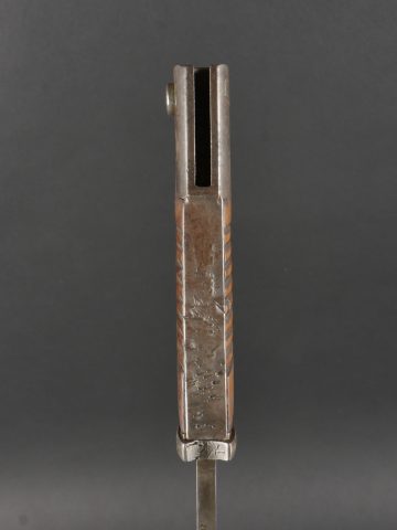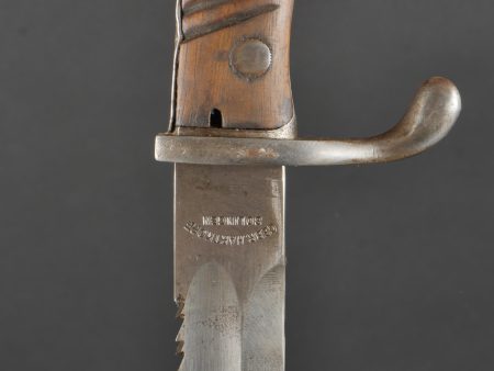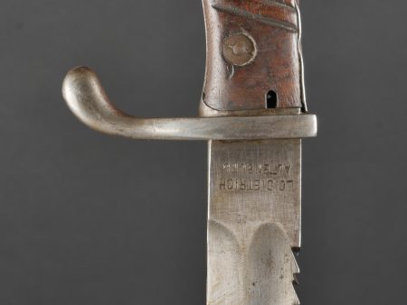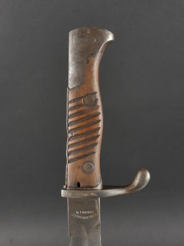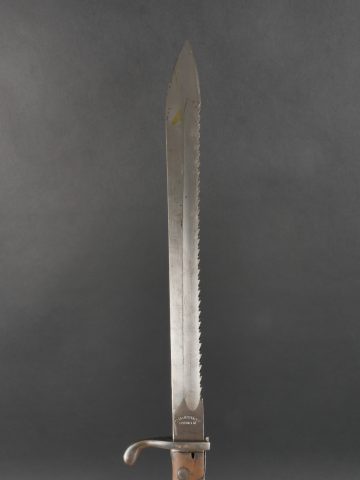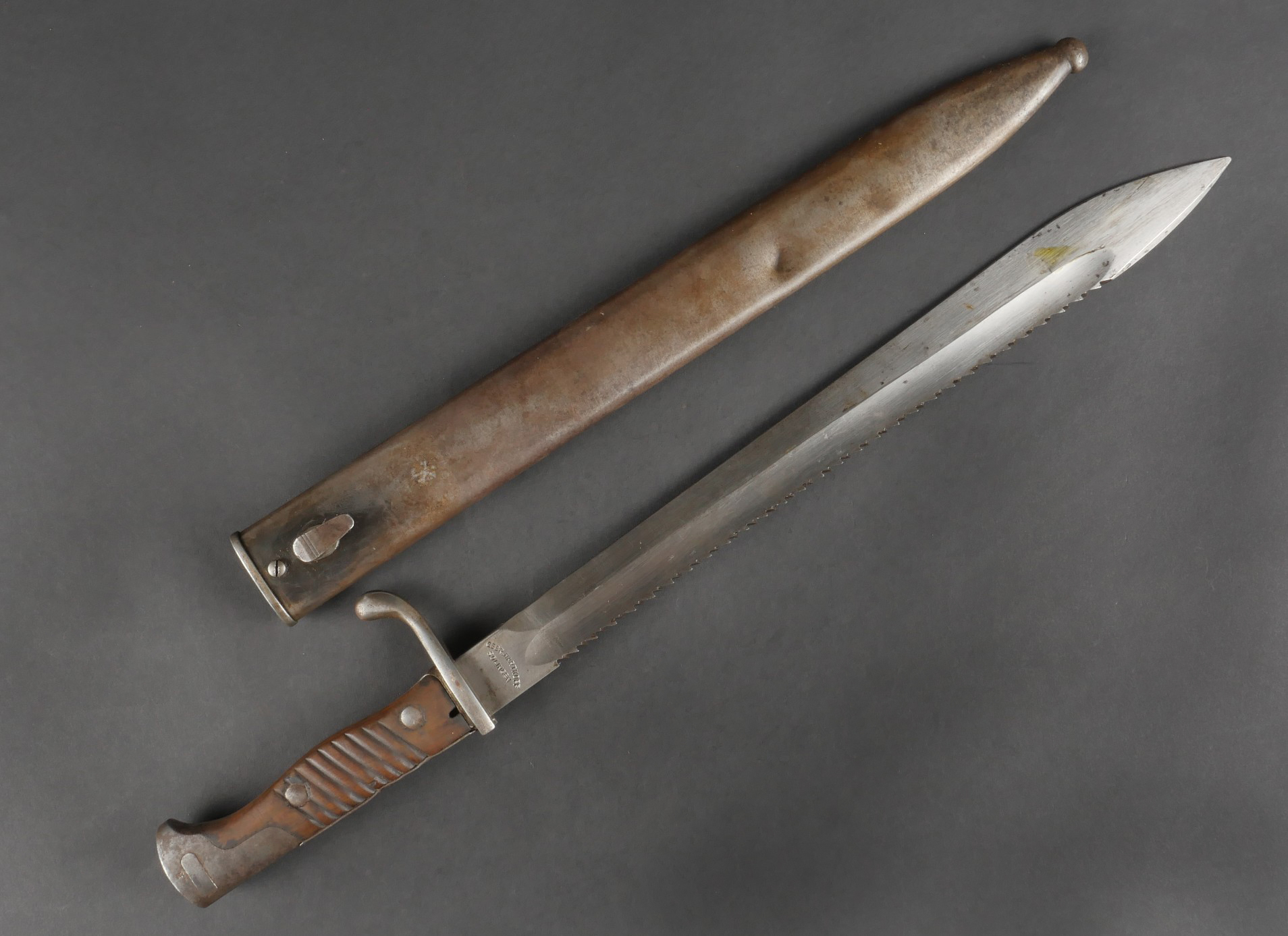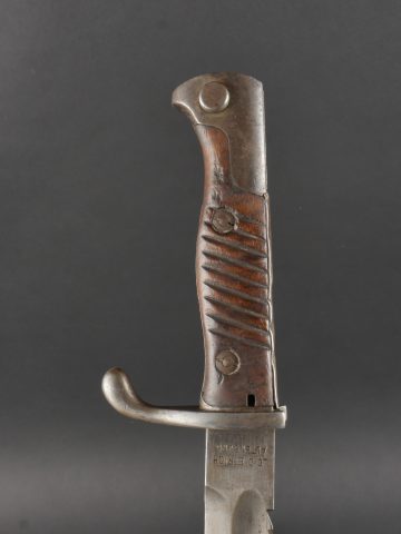 Baïonnette allemande 98-05 à dents de scie. Belle lame à dents de scie, avec double marquage, d’un côté LO DIETRCIH ALTENBURG, de l’autre GEBR. HARTKOPF SOLINGEN. Poinçon de réception sur le dos de la lame. Plaquettes bois striées. Pare flamme avec de nombreux coups. Bouton poussoir fonctionnel. Joli fourreau spécifique dents de scies, bel aspect, quelques coups. German 98/05 Sawback Bayonet Fine sawback blade with dual manufacturer markings, “LO DIETRICH ALTENBURG” on one side and “GEBR. HARTKOPF SOLINGEN” on the other. Inspection stamp on the spine. Grooved wooden grips, flashguard with impact marks, functional release button. Specific sawback scabbard in good condition, minor dents.