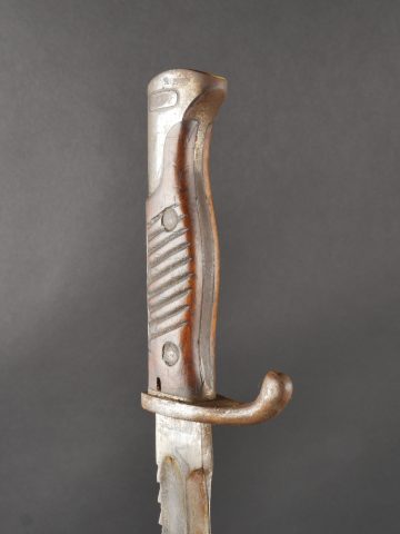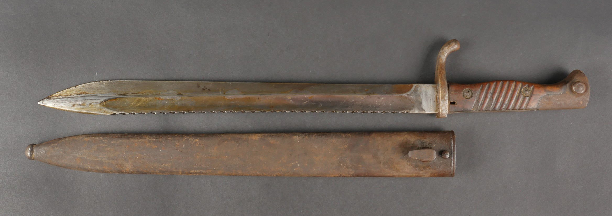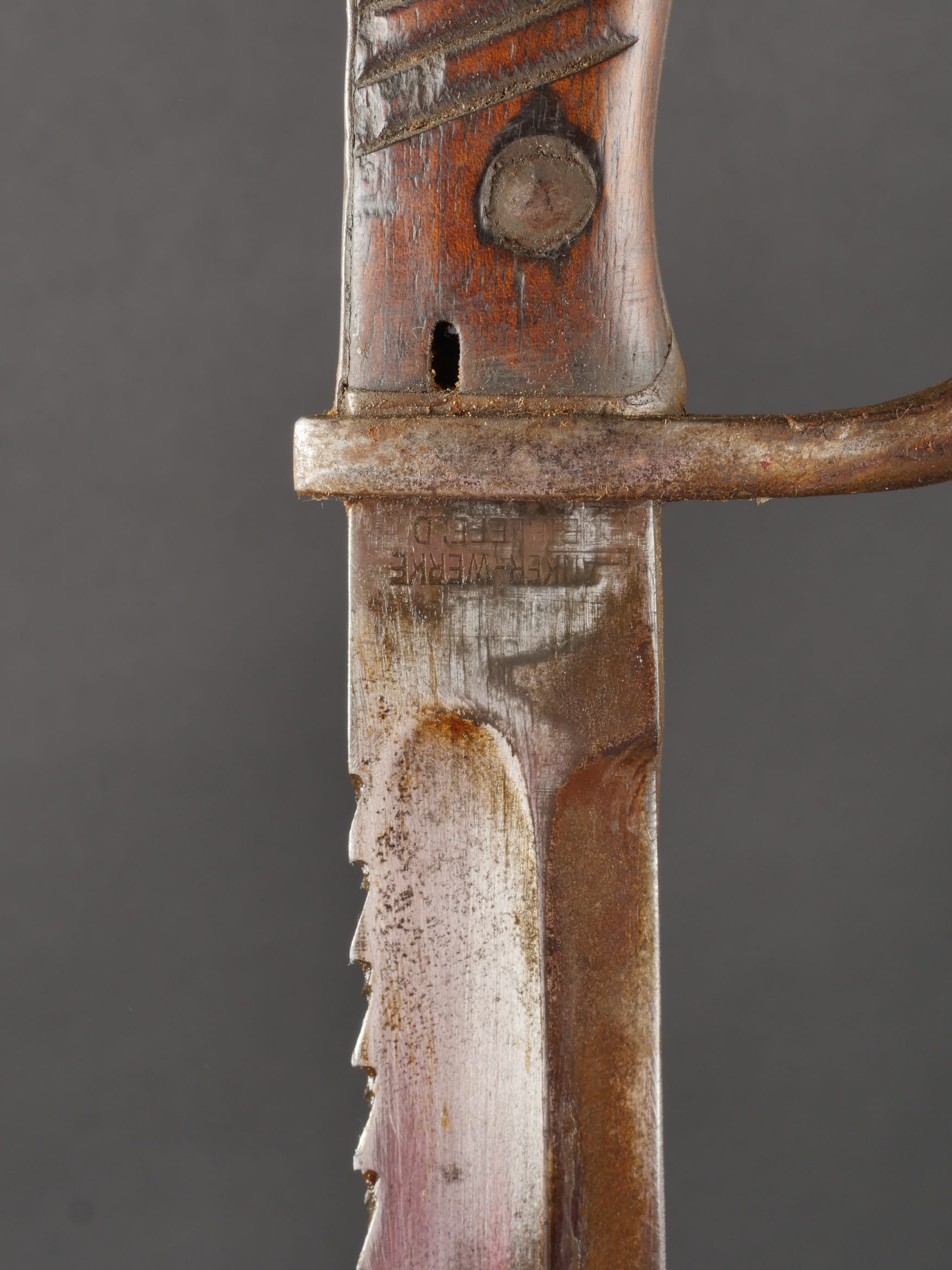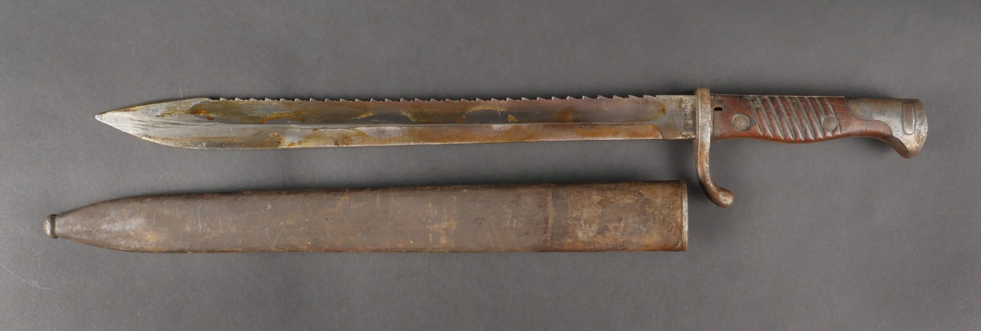 Baïonnette allemande 98-05 à dents de scie. Lame à dents du fabricant ANKER WERKE de BIELEFELD, poinçon de réception couronné au dos de la lame. Poignées en bois striées, bouton poussoir fonctionnel. Fourreau fer, patiné. German 98/05 Sawback Bayonet Sawback blade by Anker Werke, Bielefeld, with crowned inspection mark on spine. Grooved wooden grips, functional release button. Patinated steel scabbard.