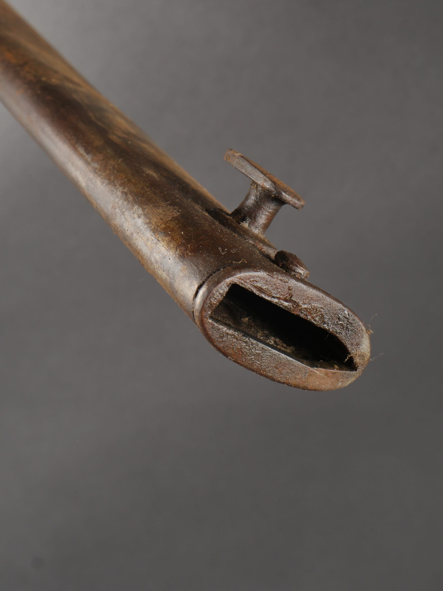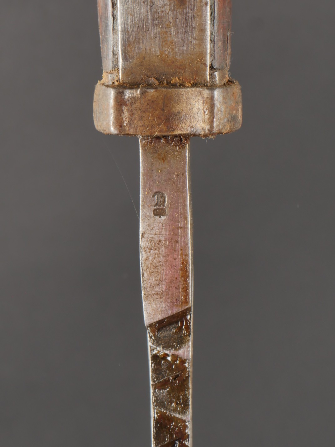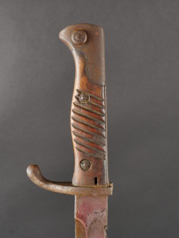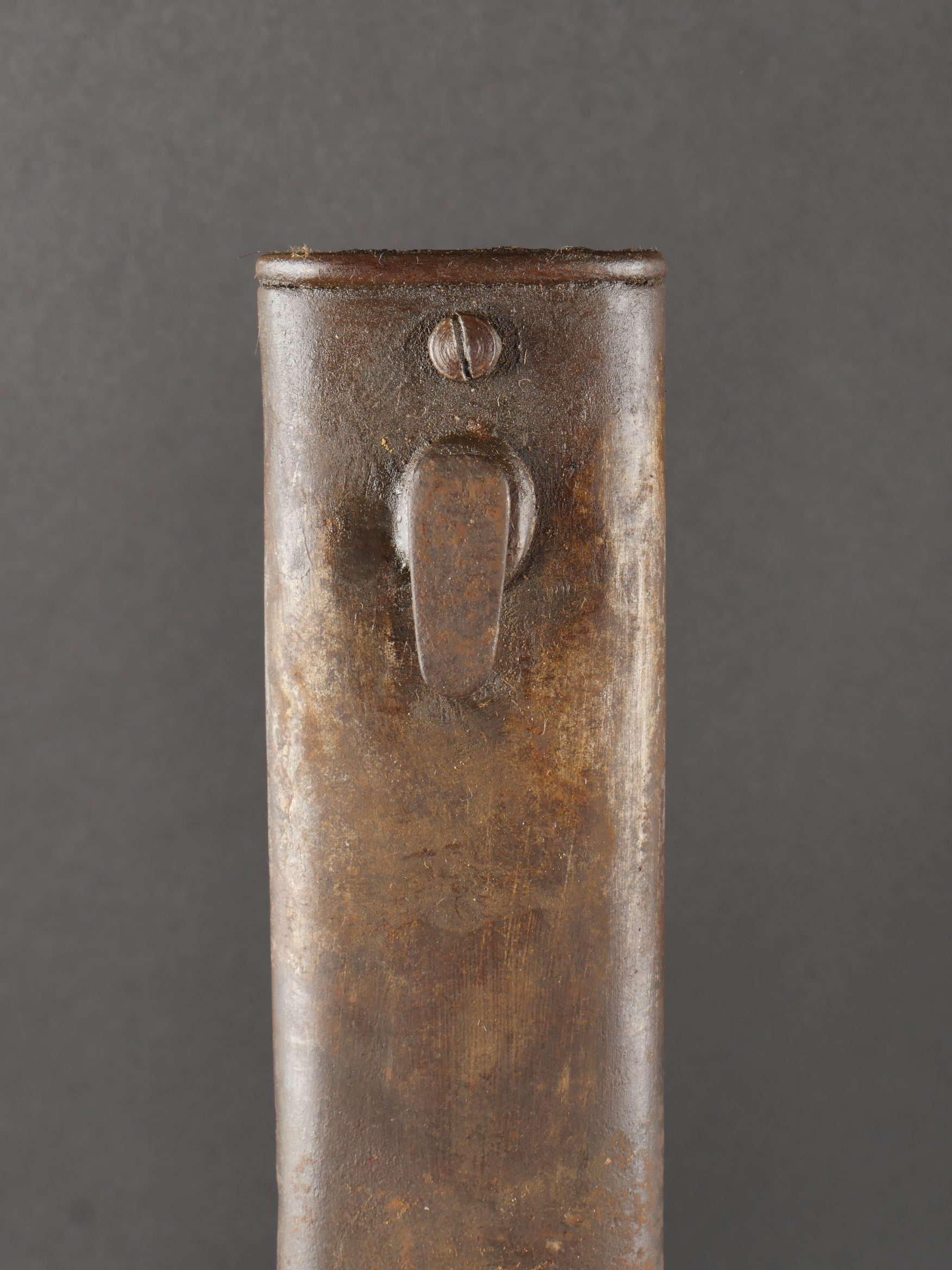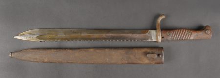 Baïonnette allemande 98-05 à dents de scie. Lame à dents du fabricant ANKER WERKE de BIELEFELD, poinçon de réception couronné au dos de la lame. Poignées en bois striées, bouton poussoir fonctionnel. Fourreau fer, patiné. German 98/05 Sawback Bayonet Sawback blade by Anker Werke, Bielefeld, with crowned inspection mark on spine. Grooved wooden grips, functional release button. Patinated steel scabbard.