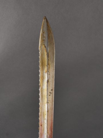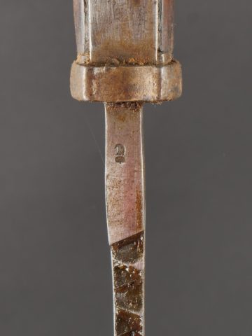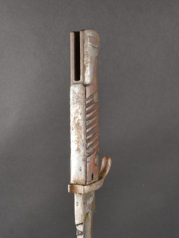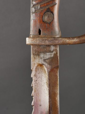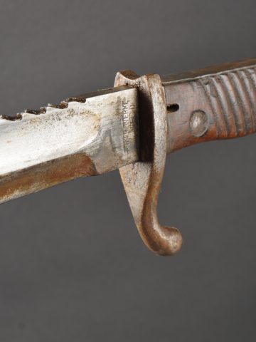 Détails de la vente >Baïonnette allemande 98-05 à dents de scie. Lame à dents du fabricant ANKER WERKE de BIELEFELD, poinçon de réception couronné au dos de la lame. Poignées en bois striées, bouton poussoir... en savoir plus