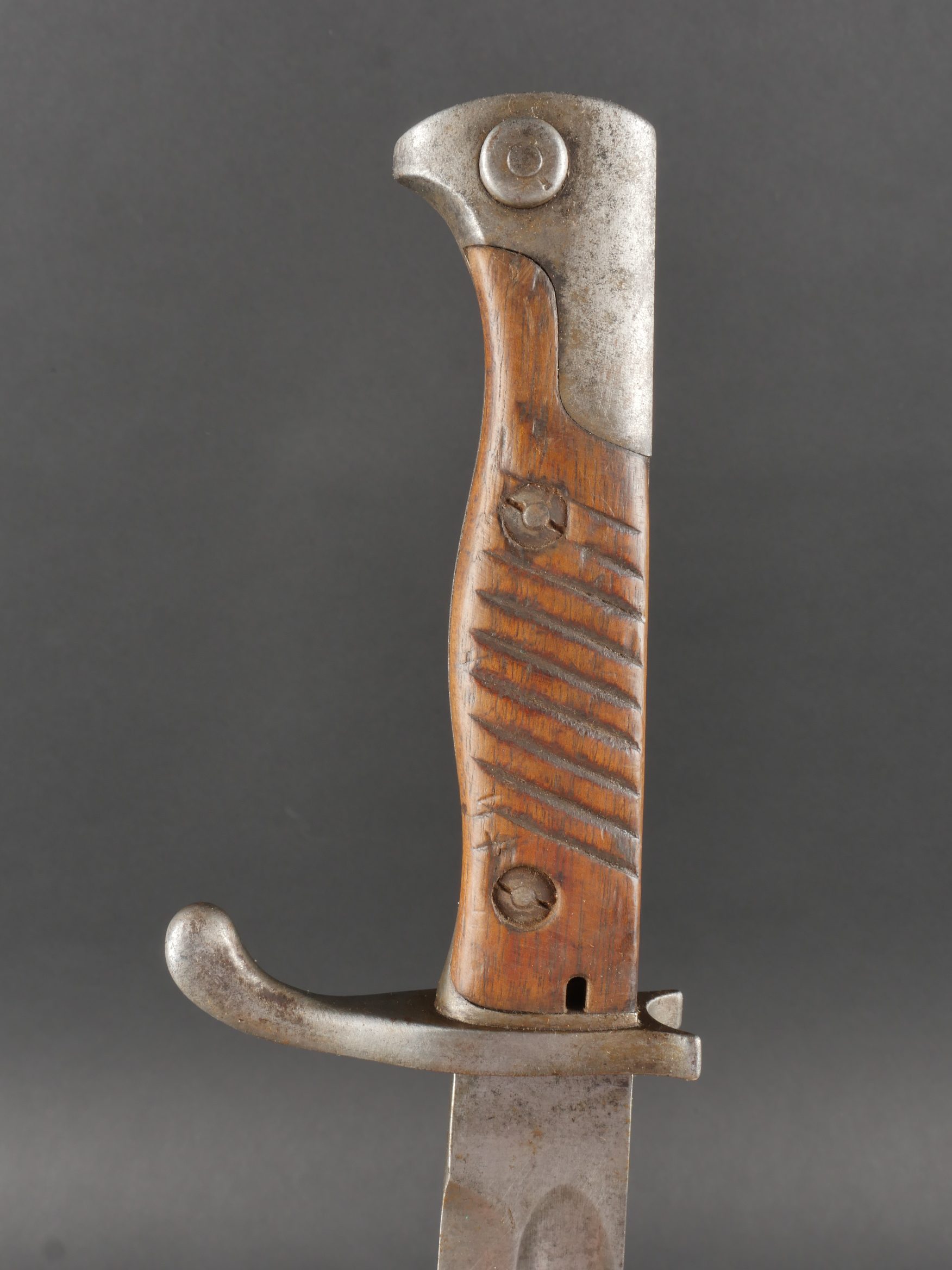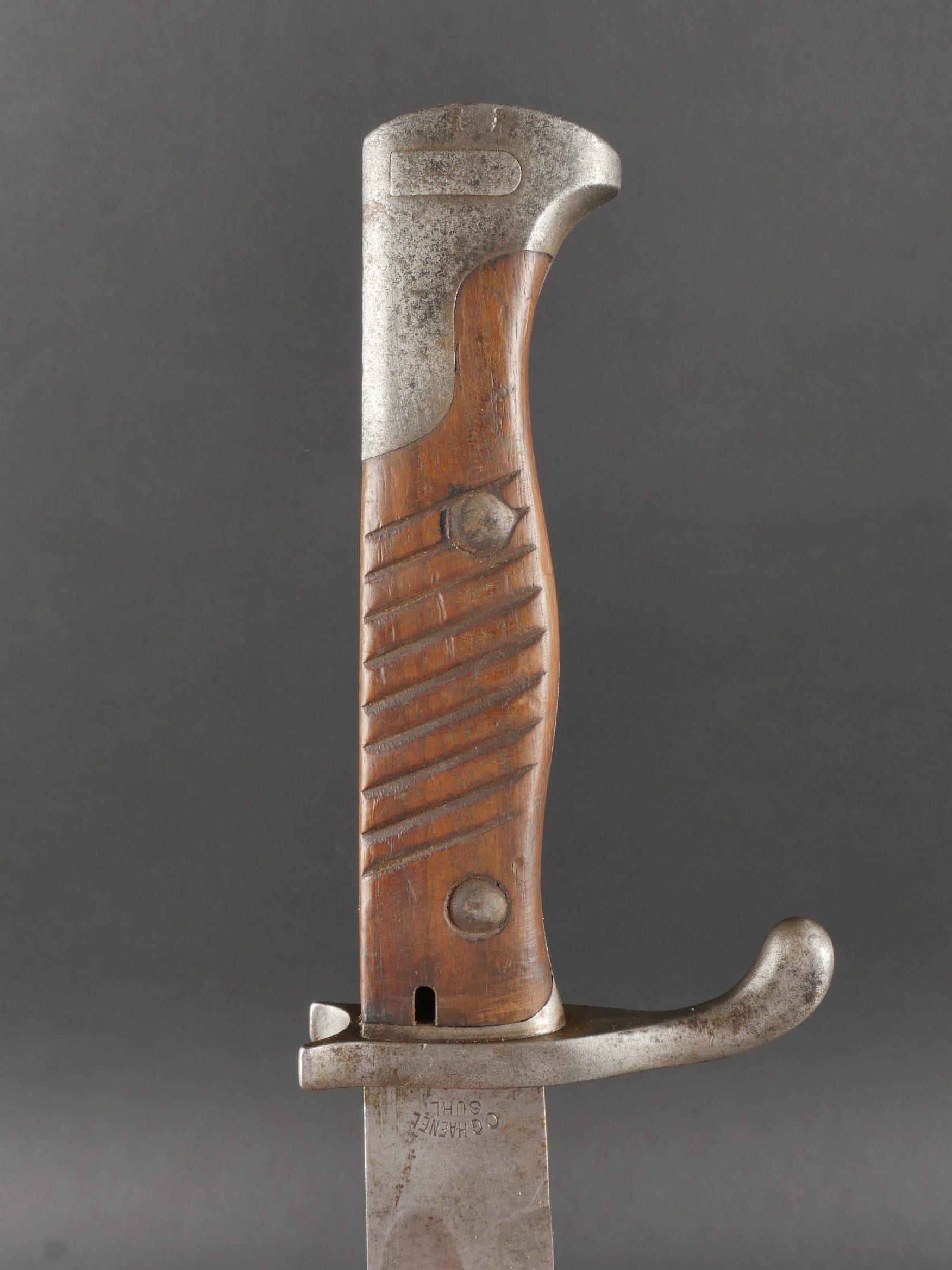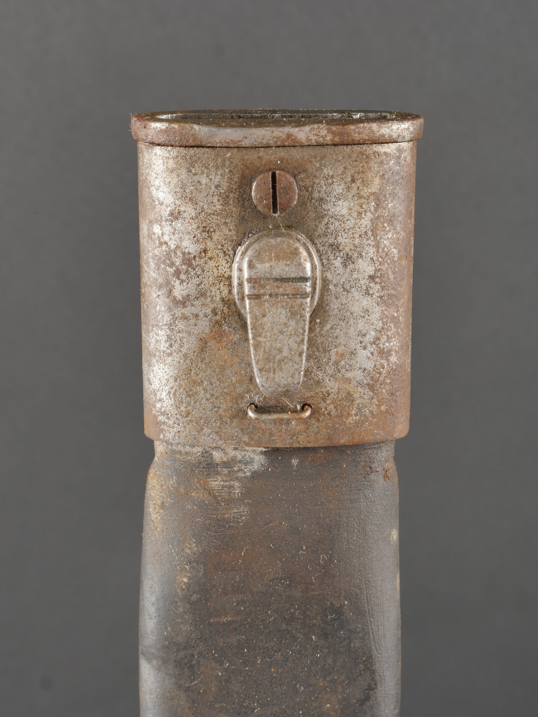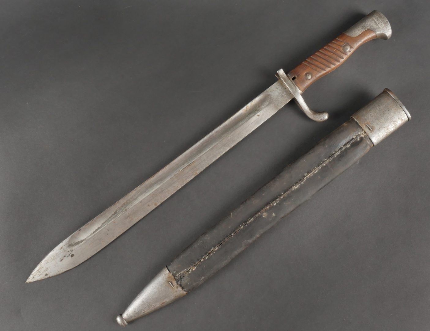 Baïonnette allemande 98-05 fourreau cuir. Seitengewehr 98-05 1er type avec lame du fabricant C. G. Haenel de Suhl, datée 1915. Plaquettes en bois striées, amorçe de douille, sans pare flamme, poussoir fonctionnel. Avec un fourreau en cuir avec chape et bouterole fer. Usure, état moyen. German 98/05 Bayonet with Leather Scabbard First type with blade by C.G. Haenel, Suhl, dated 1915. Grooved wooden grips, short socket, no flashguard, functional release. Leather scabbard with steel fittings. Worn, fair condition.