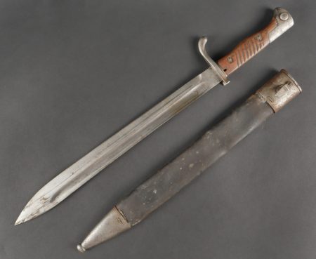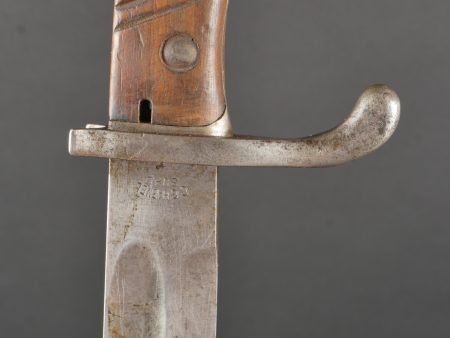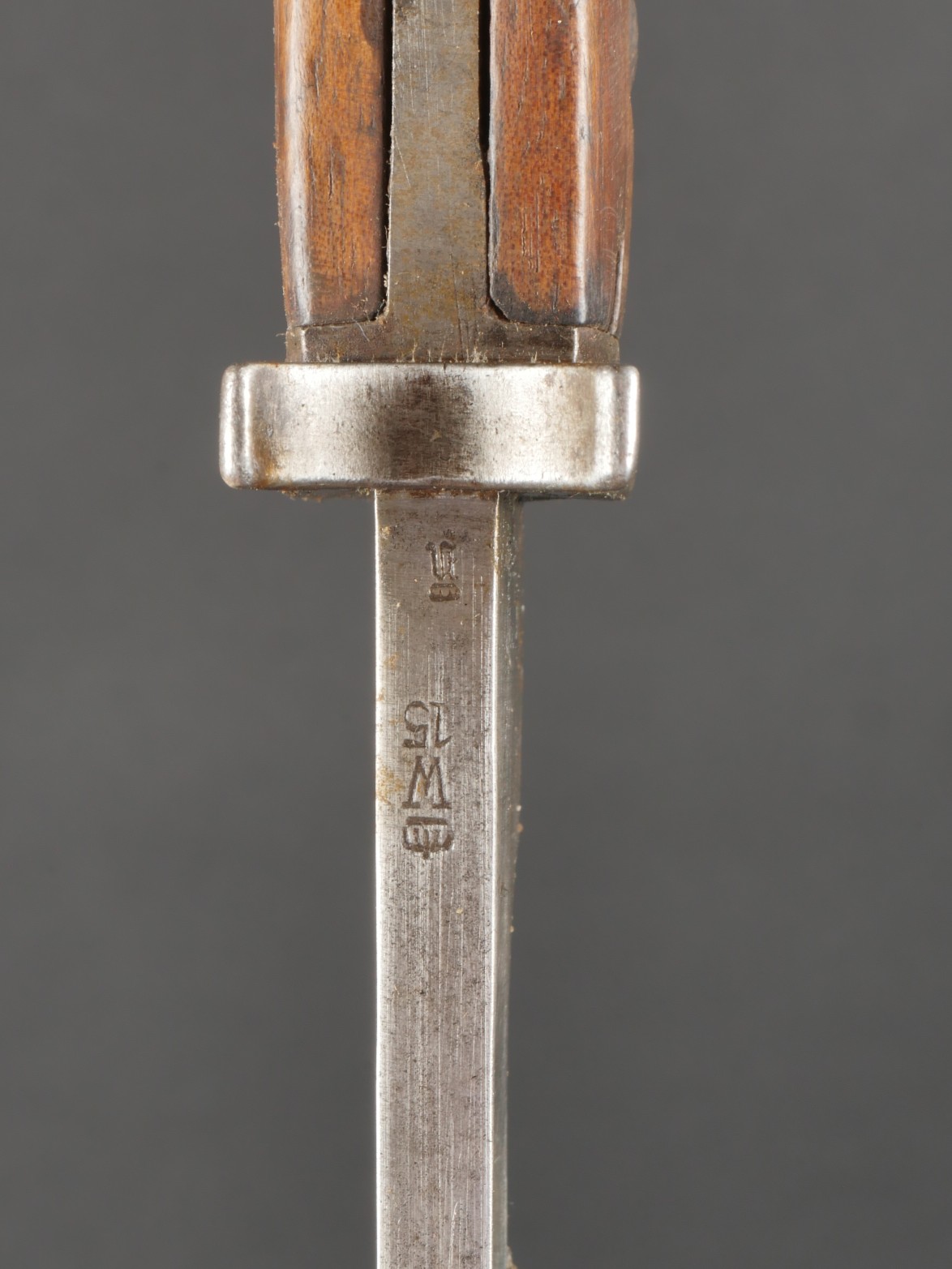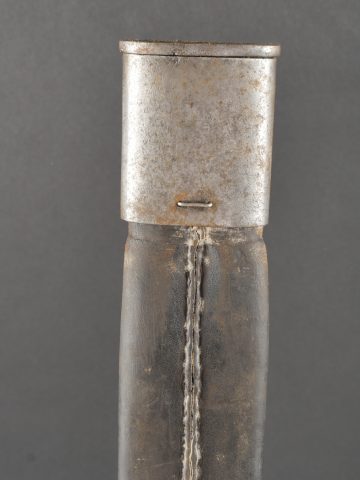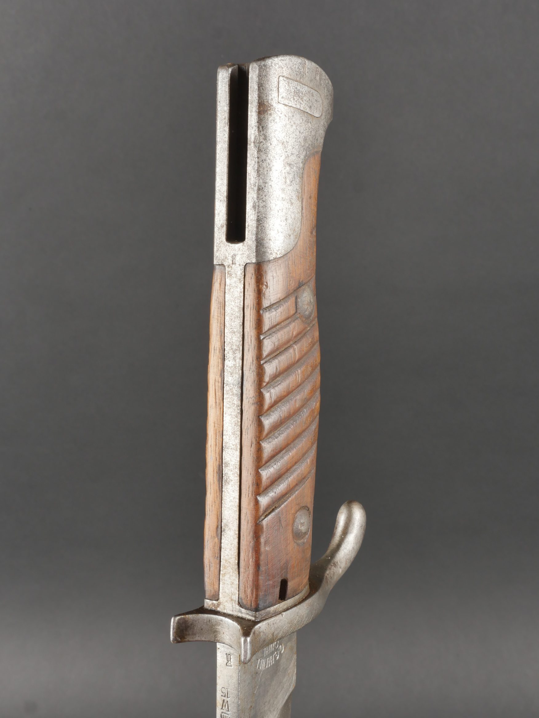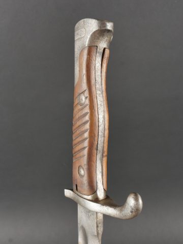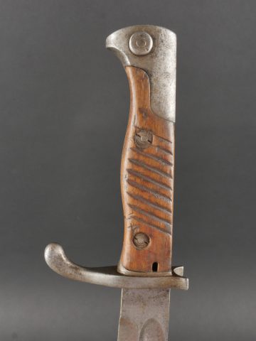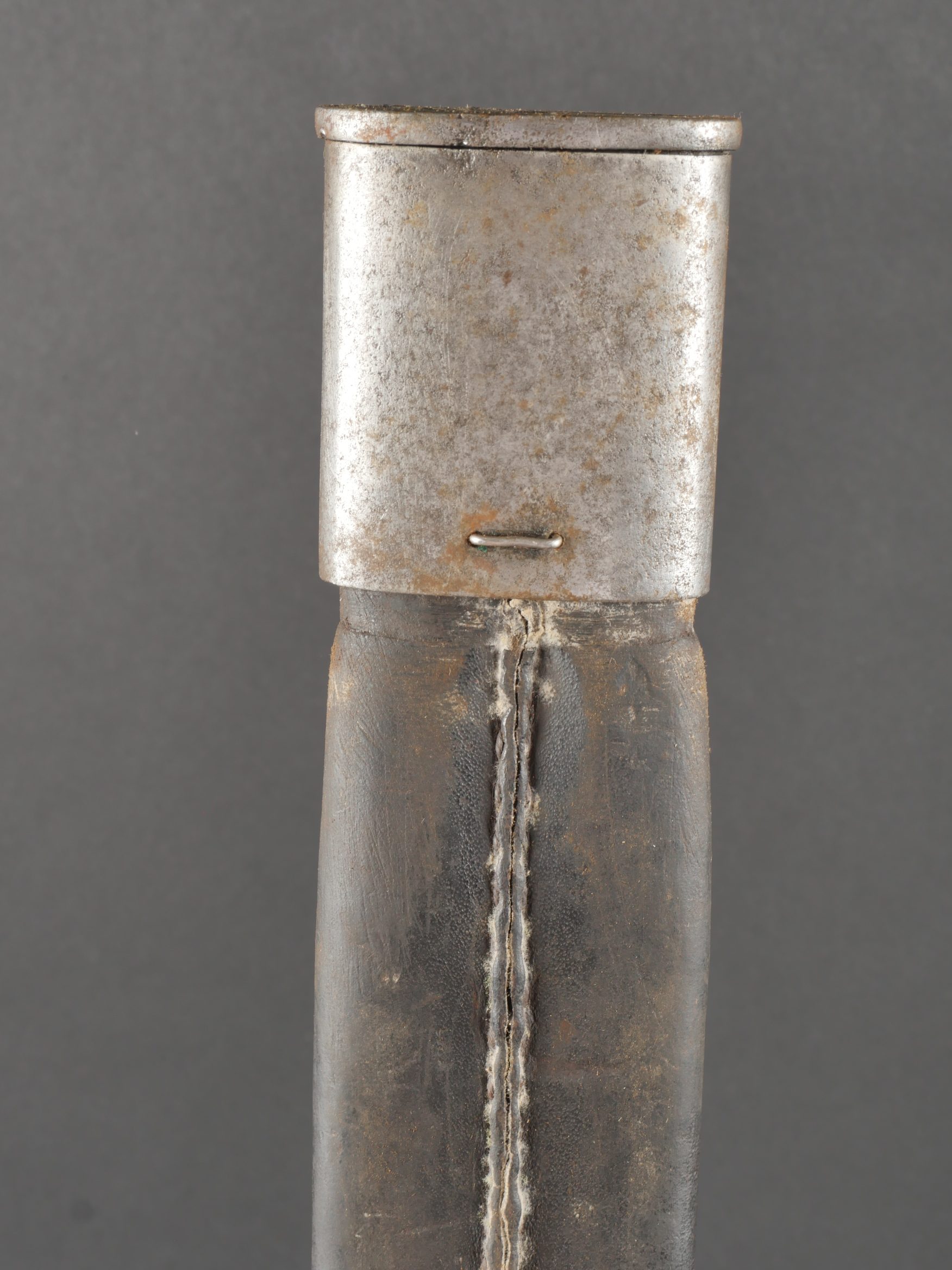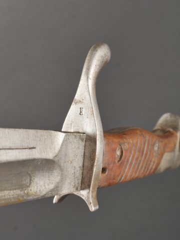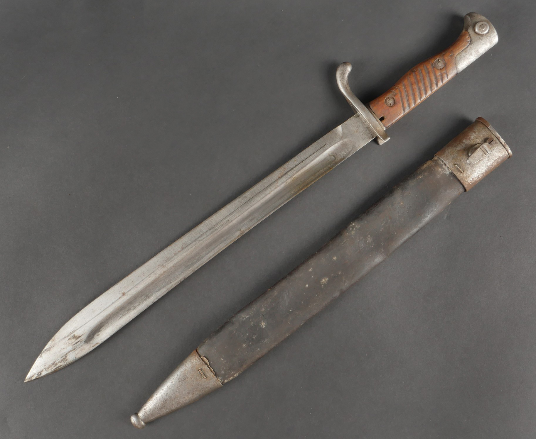 Baïonnette allemande 98-05 fourreau cuir. Seitengewehr 98-05 1er type avec lame du fabricant C. G. Haenel de Suhl, datée 1915. Plaquettes en bois striées, amorçe de douille, sans pare flamme, poussoir fonctionnel. Avec un fourreau en cuir avec chape et bouterole fer. Usure, état moyen. German 98/05 Bayonet with Leather Scabbard First type with blade by C.G. Haenel, Suhl, dated 1915. Grooved wooden grips, short socket, no flashguard, functional release. Leather scabbard with steel fittings. Worn, fair condition.