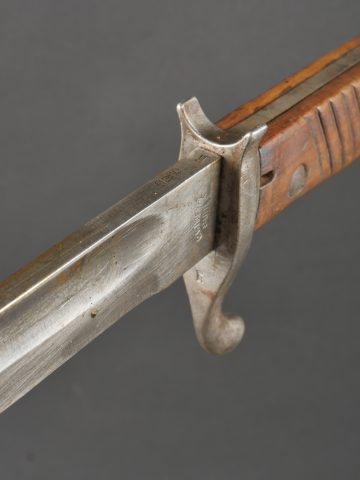 Détails de la vente >Baïonnette allemande 98-05 fourreau cuir. Seitengewehr 98-05 1er type avec lame du fabricant C. G. Haenel de Suhl, datée 1915. Plaquettes en bois striées, amorçe de douille, sans pare flamme,... en savoir plus