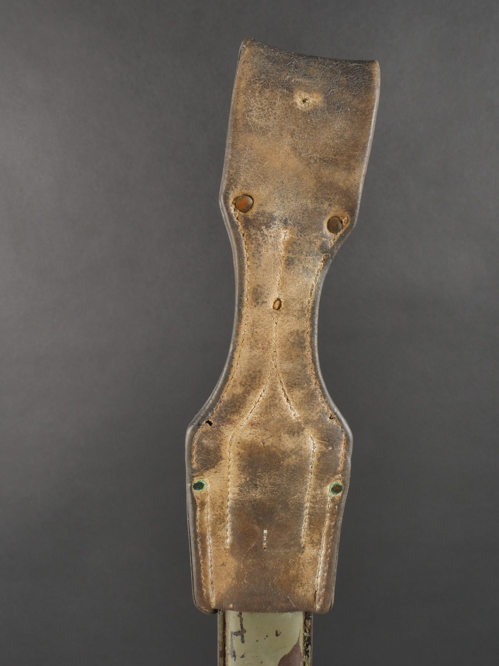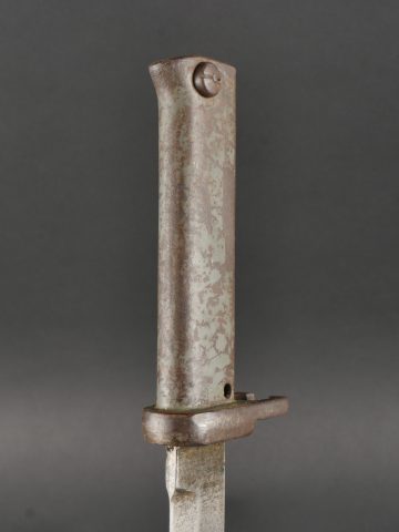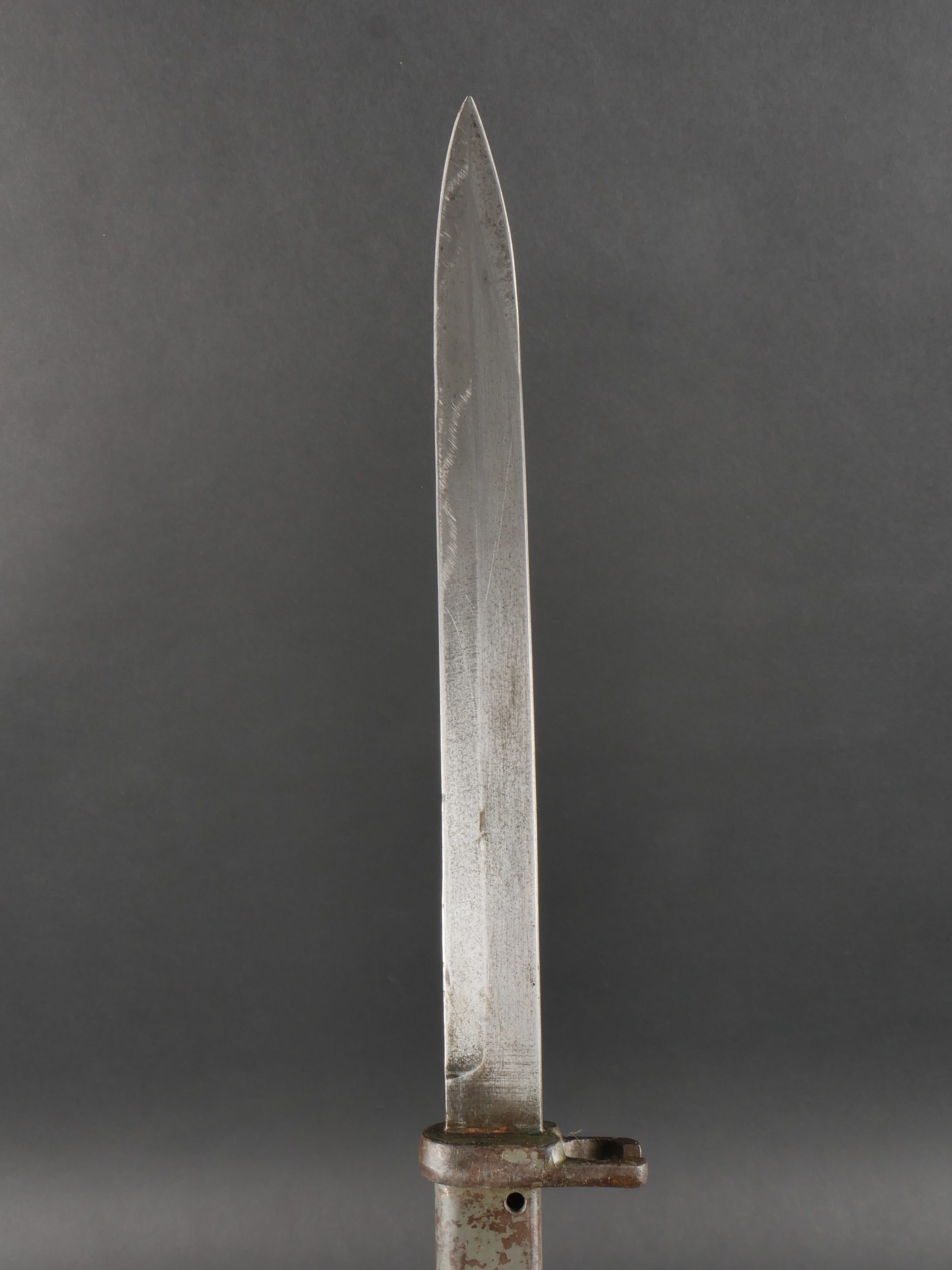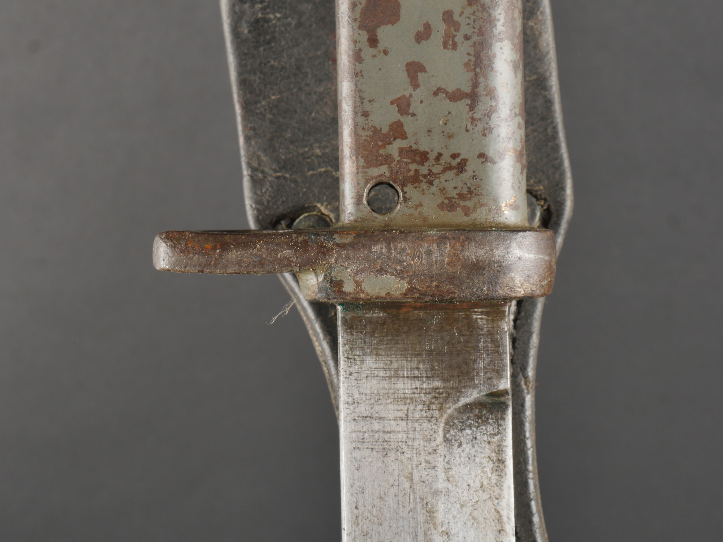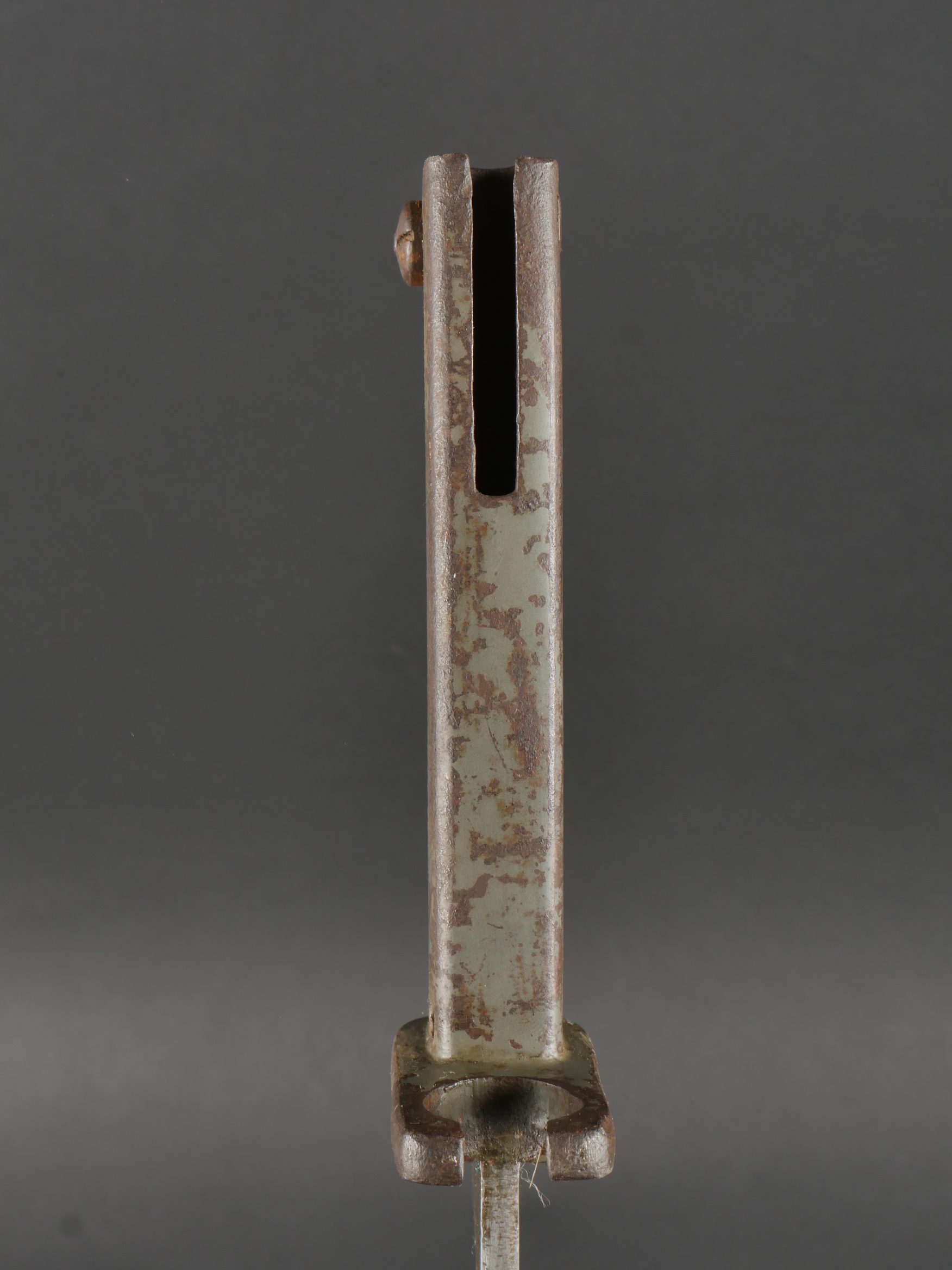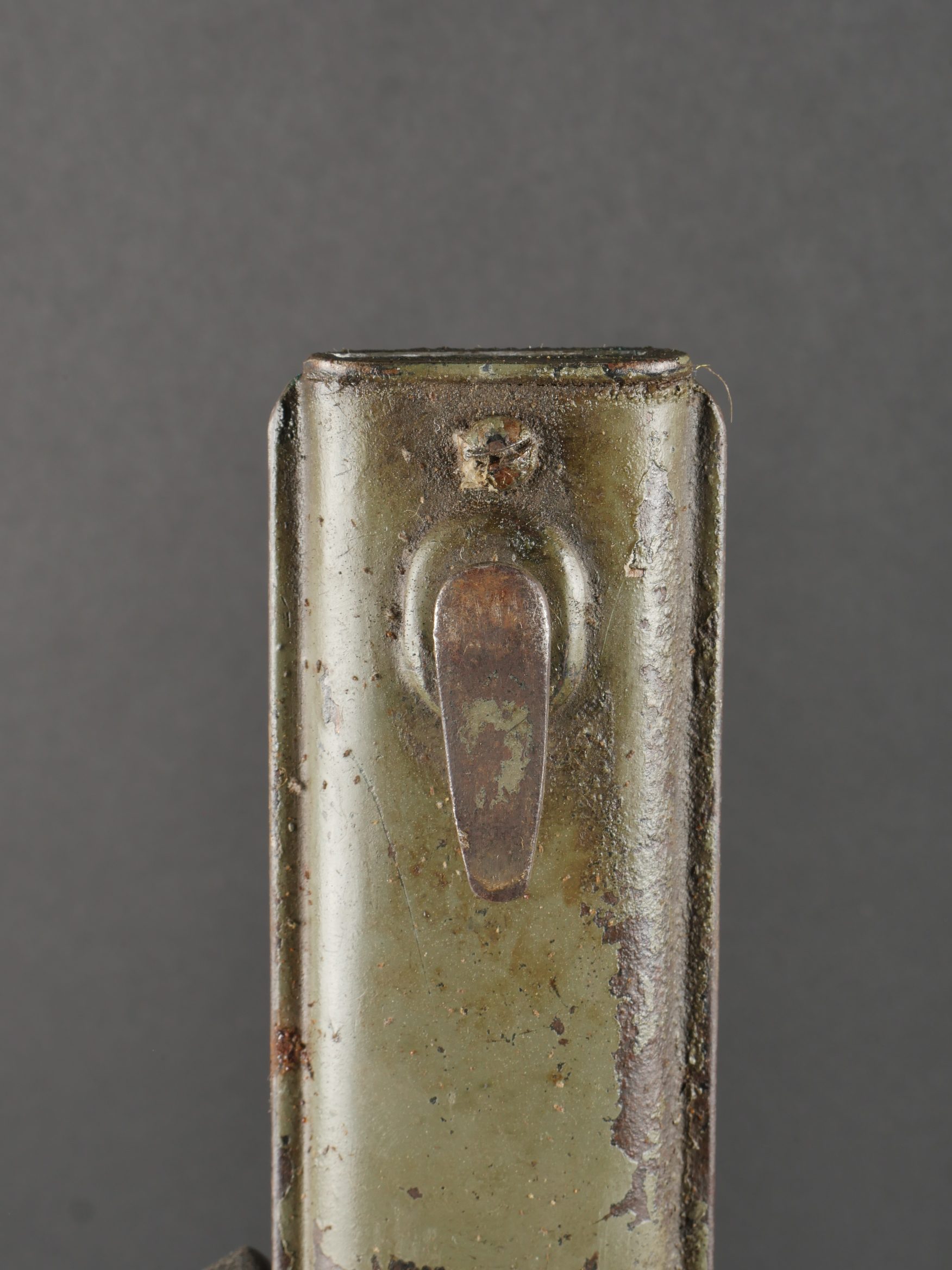 Baïonnette ersatz allemande fourreau FAG feldgrau. Baïonnette ersatz, lame à un pan, dos plat et contre tranchant en pointe. Poignée fer peint en feldgrau. Bouton poussoir fonctionnel. Douille ouverte, poinçon de réception couronné sur la croisière. Fourreau FAG en fer peint feldgrau. Porte fourreau en cuir noirci, reste de marquage au dos illisible. ENsemble en bon état. German Ersatz Bayonet with FAG Field-Grey Scabbard One-piece ersatz bayonet with single-edged blade, flat back, and pointed false edge. Iron hilt painted field-grey, functional release button, crowned inspection mark on the crossguard. FAG iron scabbard painted field-grey. Blackened leather frog with illegible markings. Set in good condition.