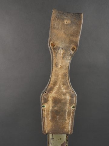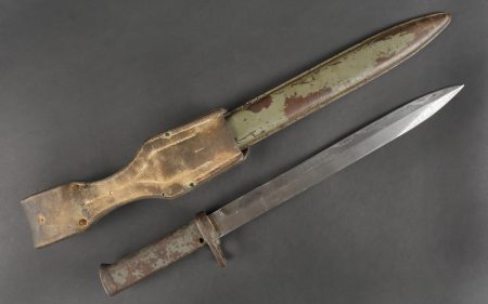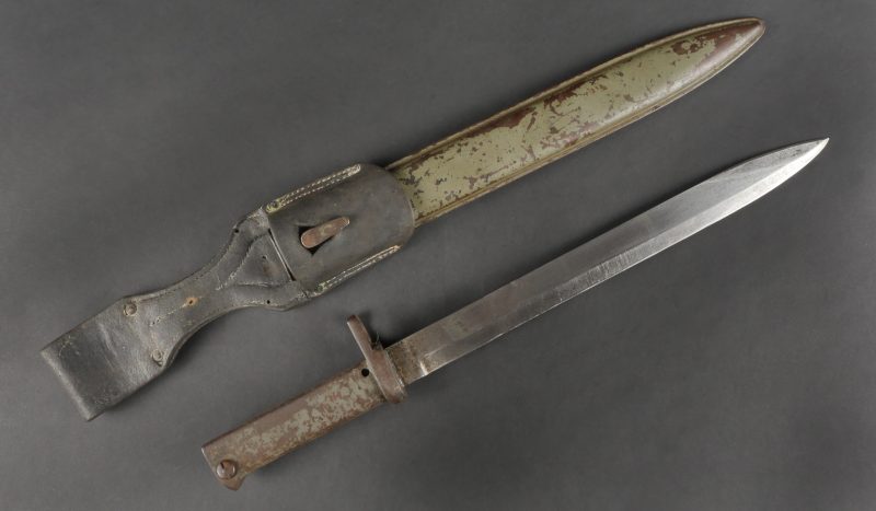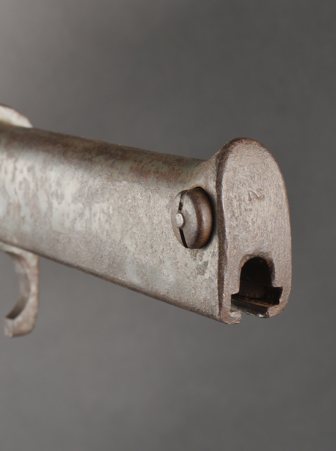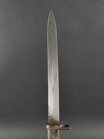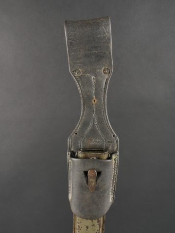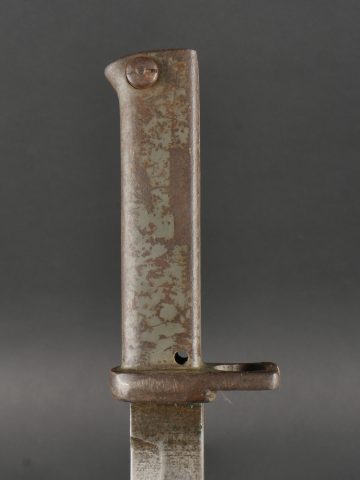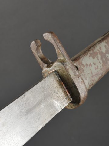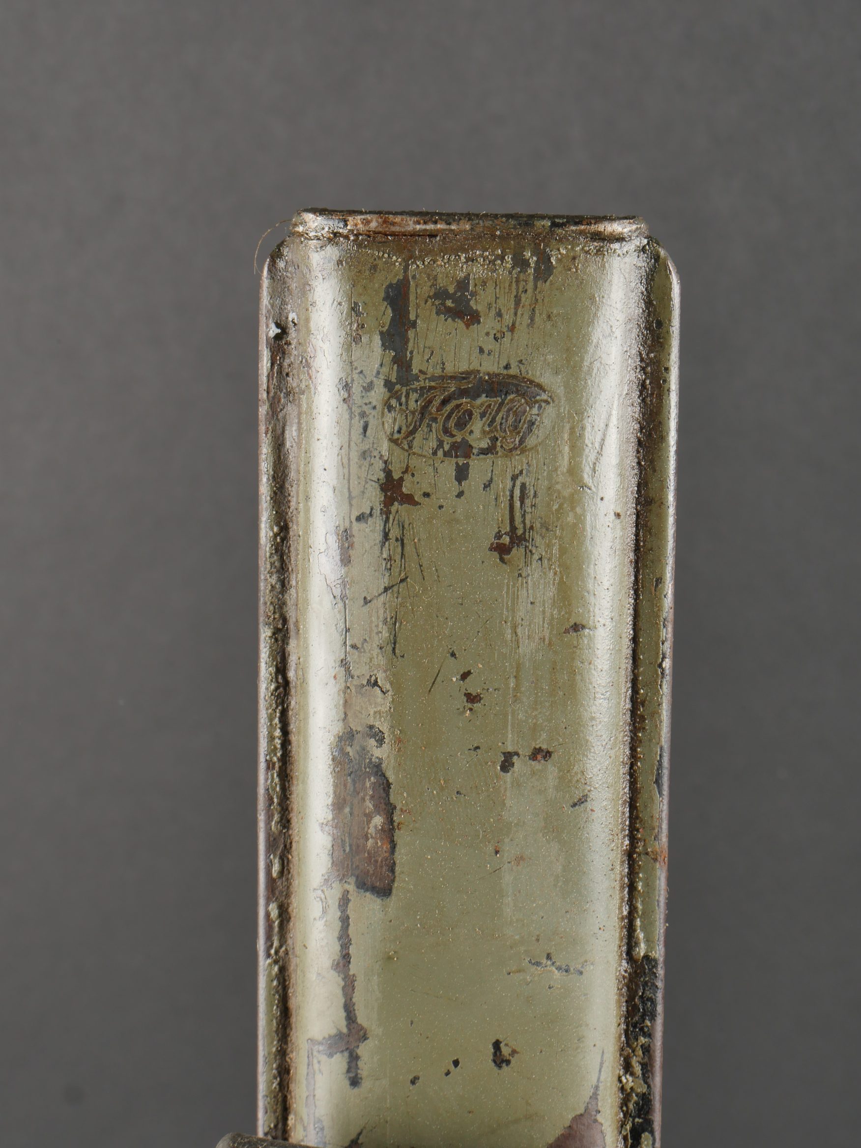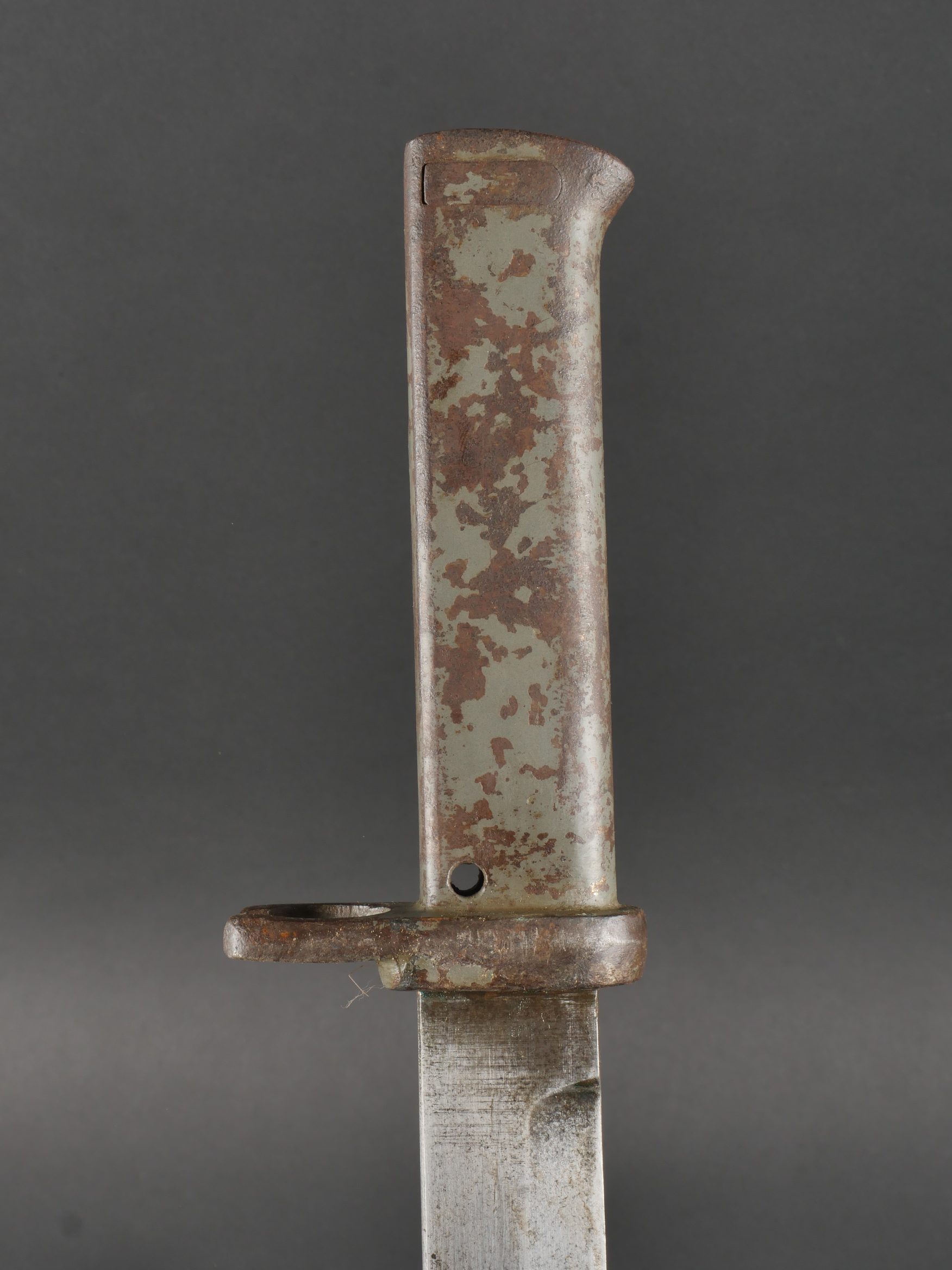 Baïonnette ersatz allemande fourreau FAG feldgrau. Baïonnette ersatz, lame à un pan, dos plat et contre tranchant en pointe. Poignée fer peint en feldgrau. Bouton poussoir fonctionnel. Douille ouverte, poinçon de réception couronné sur la croisière. Fourreau FAG en fer peint feldgrau. Porte fourreau en cuir noirci, reste de marquage au dos illisible. ENsemble en bon état. German Ersatz Bayonet with FAG Field-Grey Scabbard One-piece ersatz bayonet with single-edged blade, flat back, and pointed false edge. Iron hilt painted field-grey, functional release button, crowned inspection mark on the crossguard. FAG iron scabbard painted field-grey. Blackened leather frog with illegible markings. Set in good condition.