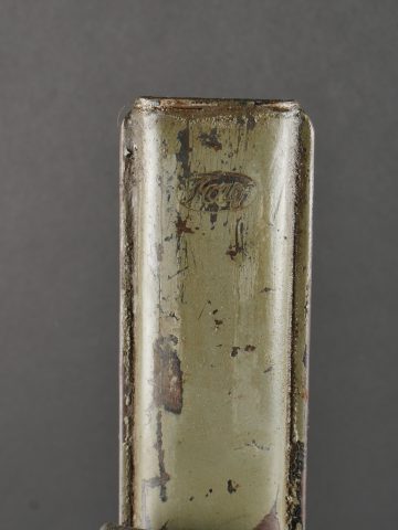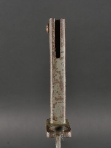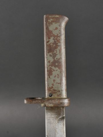 Baïonnette ersatz allemande fourreau FAG feldgrau. Baïonnette ersatz, lame à un pan, dos plat et contre tranchant en pointe. Poignée fer peint en feldgrau. Bouton poussoir fonctionnel. Douille... en savoir plus