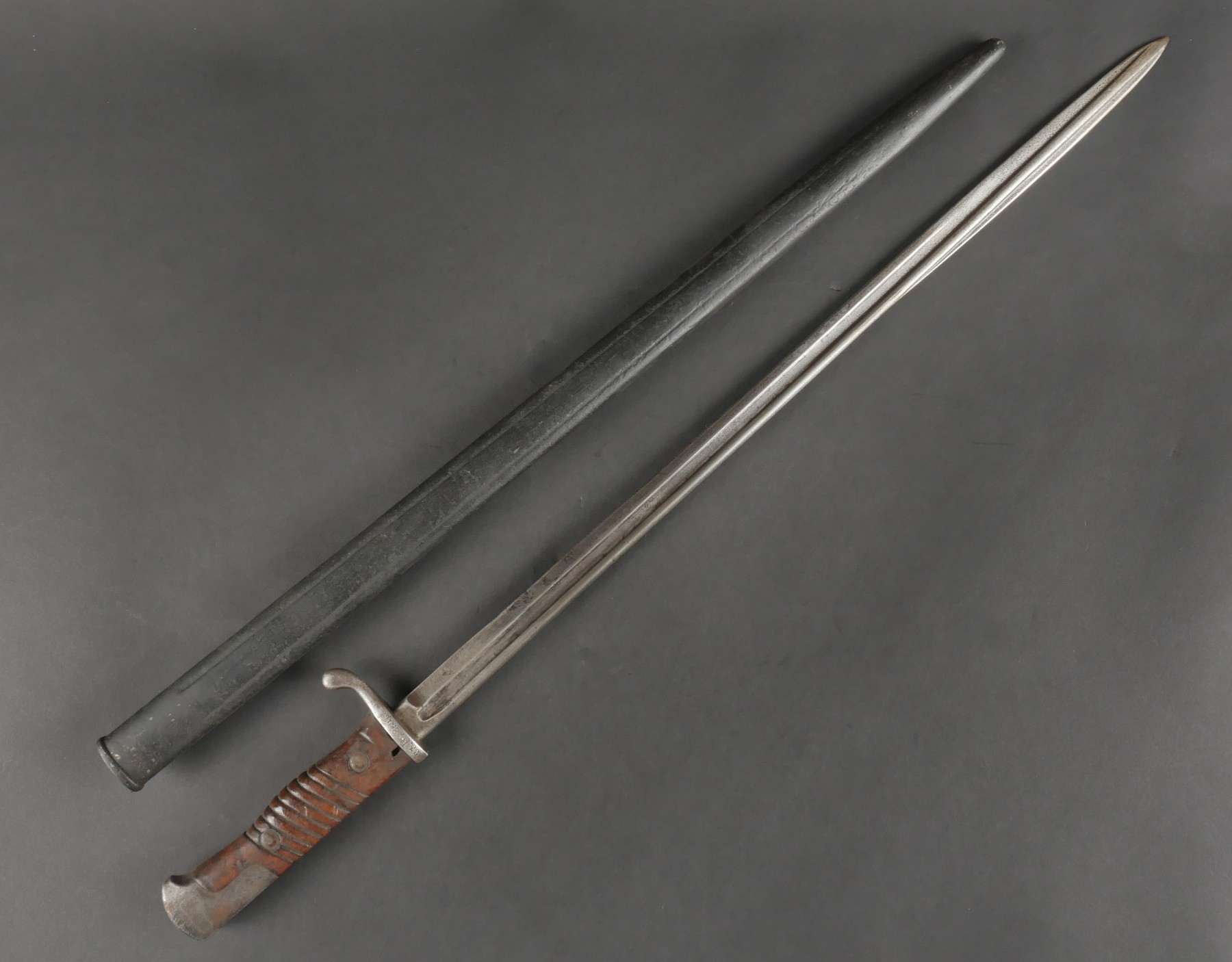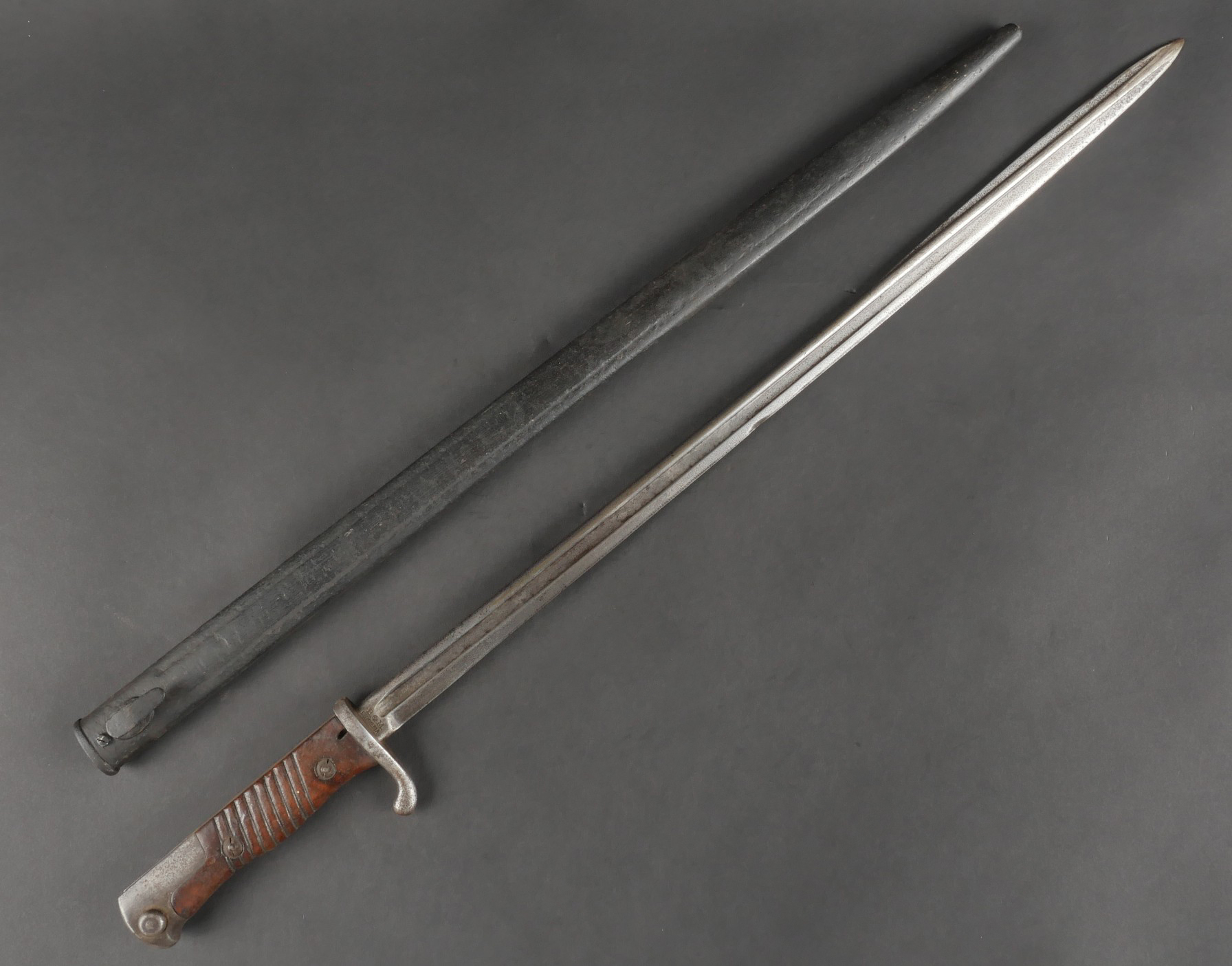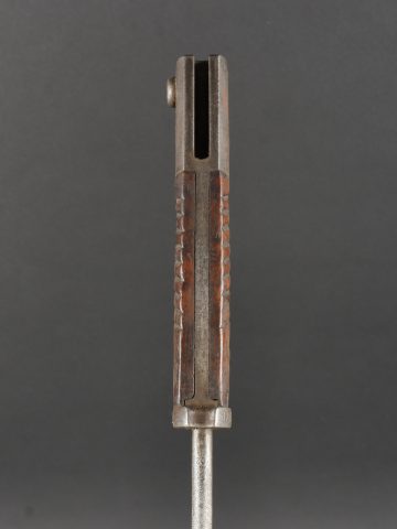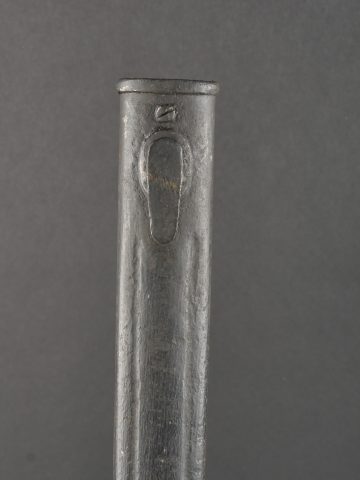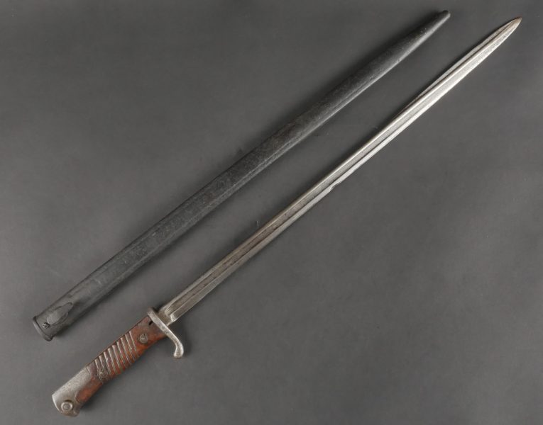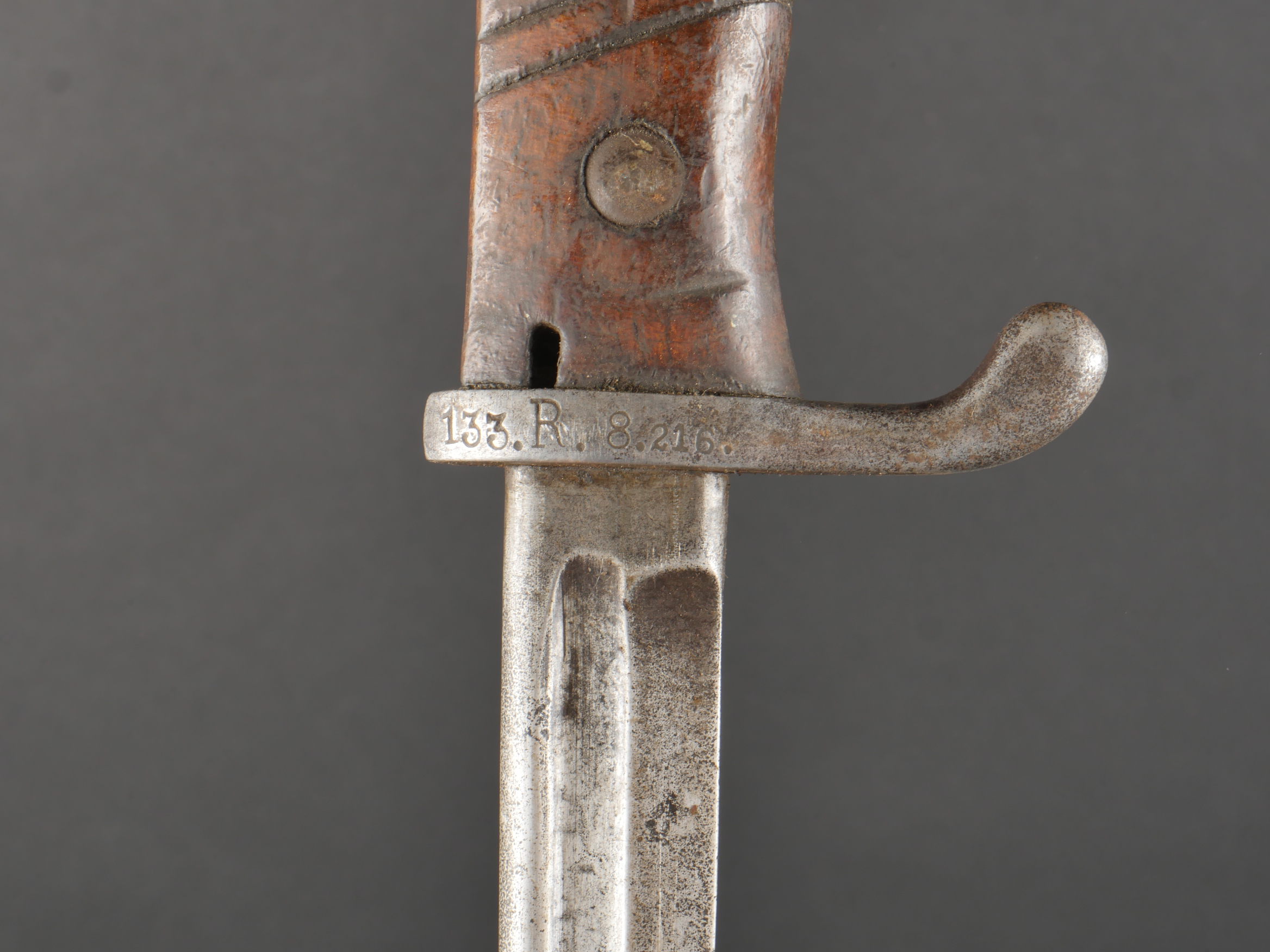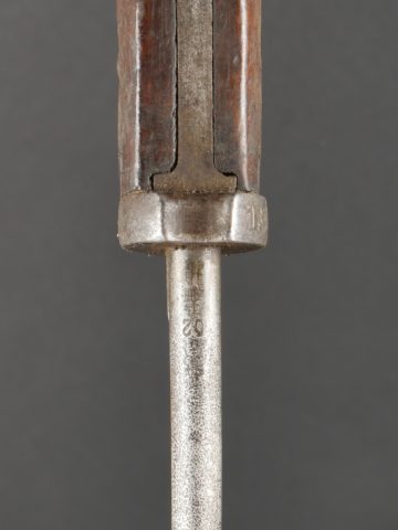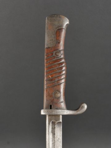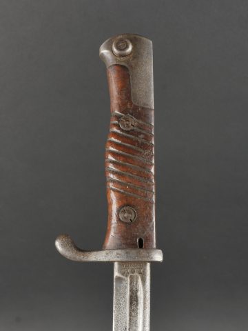 Baïonnette S98 alter Art du JR133 saxon avec fourreau fer. Seitengewehr S98 1er type avec poignée monobloc en bois strié. La lame a été raccourcie, usure, traces d’oxydation. Datée 1902. Marquage sur la croisière 133.R.8.216 pour arme n°216 de la 8e compagnie du 133e régiment d’infanterie saxon. Bouton poussoir à dégripper. Avec un fourreau en fer, repeint en noir. S98 Alter Art Bayonet, JR133 Saxon Regiment, with Steel Scabbard Early pattern S98 with one-piece grooved wooden grip. Blade shortened, with wear and oxidation marks. Dated 1902. Crossguard marked 133.R.8.216 for weapon no. 216 of the 8th Company, 133rd Saxon Infantry Regiment. Release button stiff. Steel scabbard repainted black.