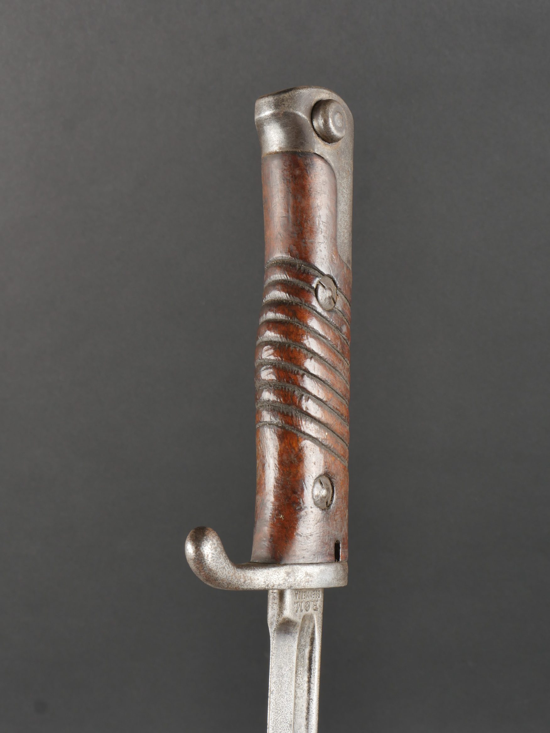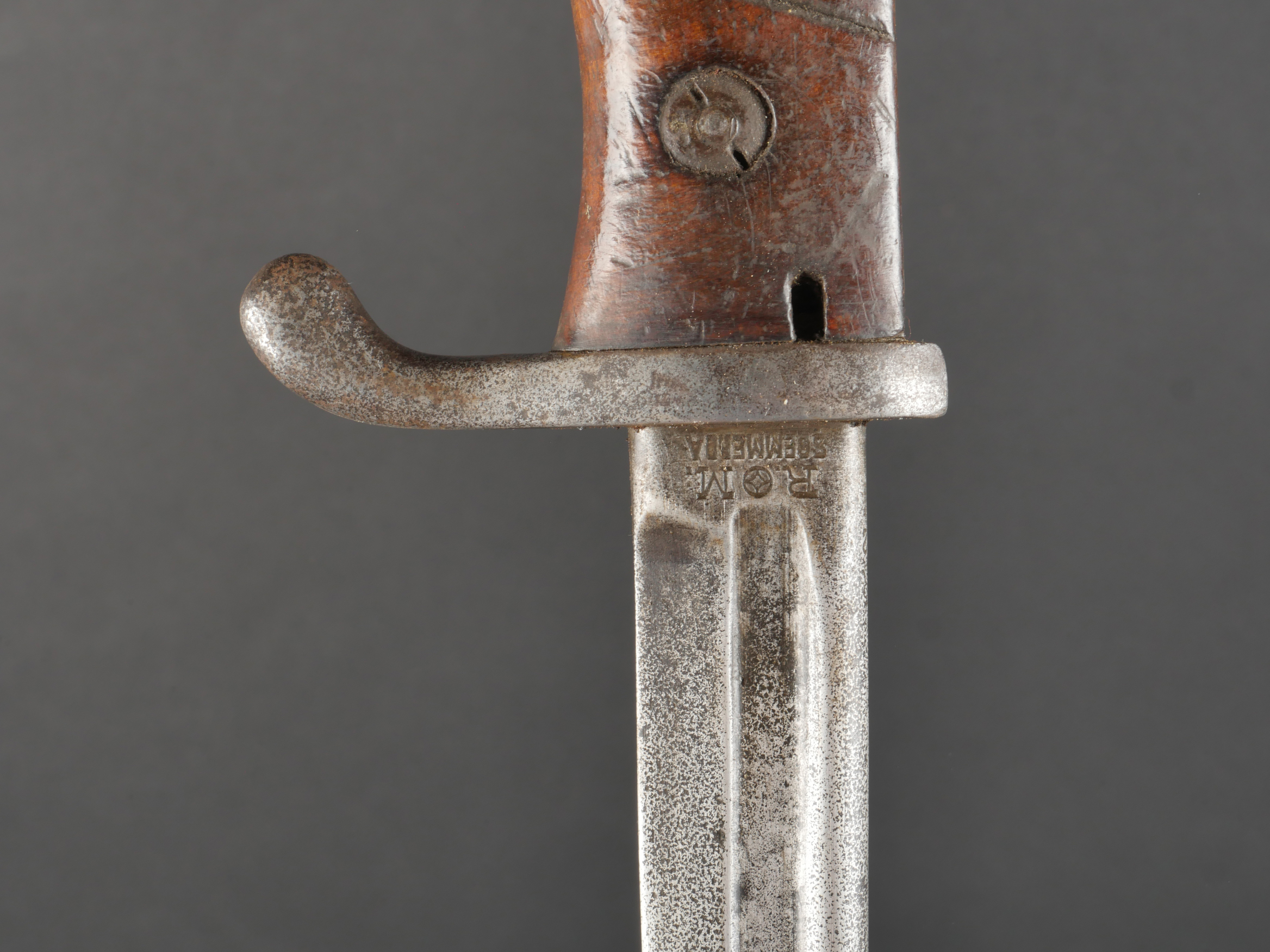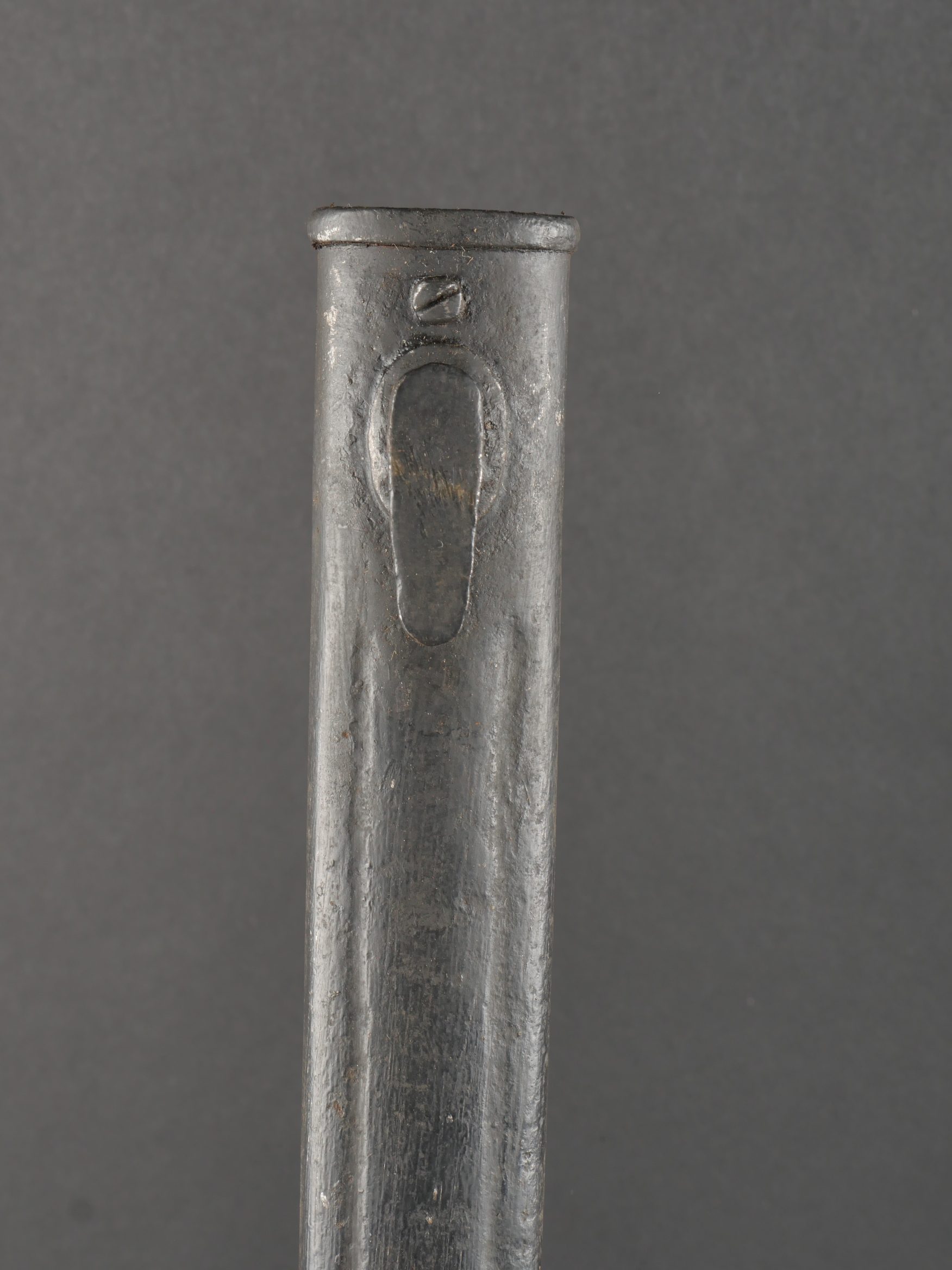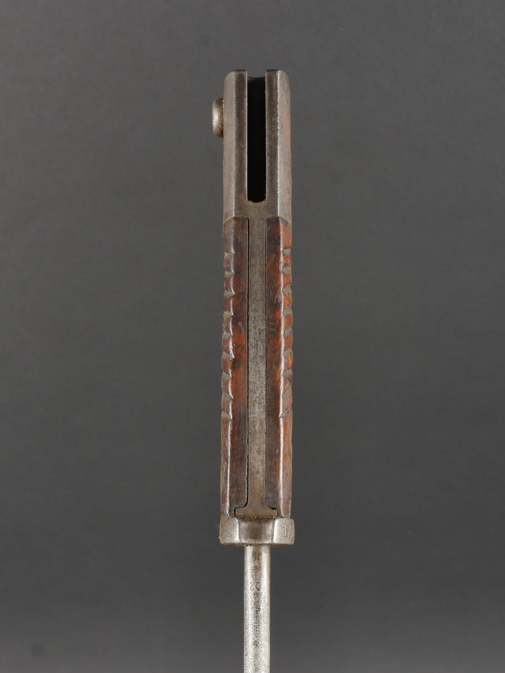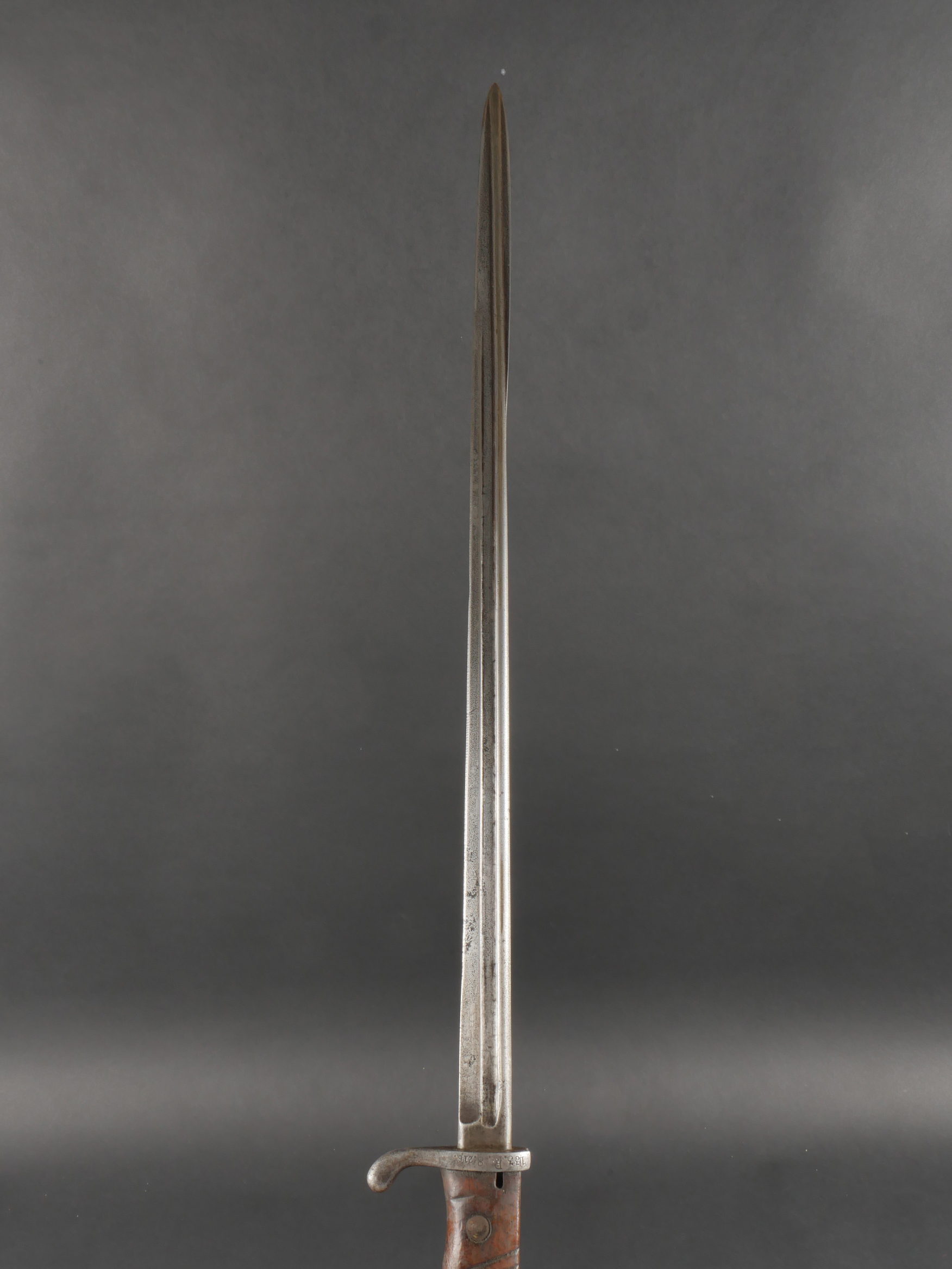 Baïonnette S98 alter Art du JR133 saxon avec fourreau fer. Seitengewehr S98 1er type avec poignée monobloc en bois strié. La lame a été raccourcie, usure, traces d’oxydation. Datée 1902. Marquage sur la croisière 133.R.8.216 pour arme n°216 de la 8e compagnie du 133e régiment d’infanterie saxon. Bouton poussoir à dégripper. Avec un fourreau en fer, repeint en noir. S98 Alter Art Bayonet, JR133 Saxon Regiment, with Steel Scabbard Early pattern S98 with one-piece grooved wooden grip. Blade shortened, with wear and oxidation marks. Dated 1902. Crossguard marked 133.R.8.216 for weapon no. 216 of the 8th Company, 133rd Saxon Infantry Regiment. Release button stiff. Steel scabbard repainted black.